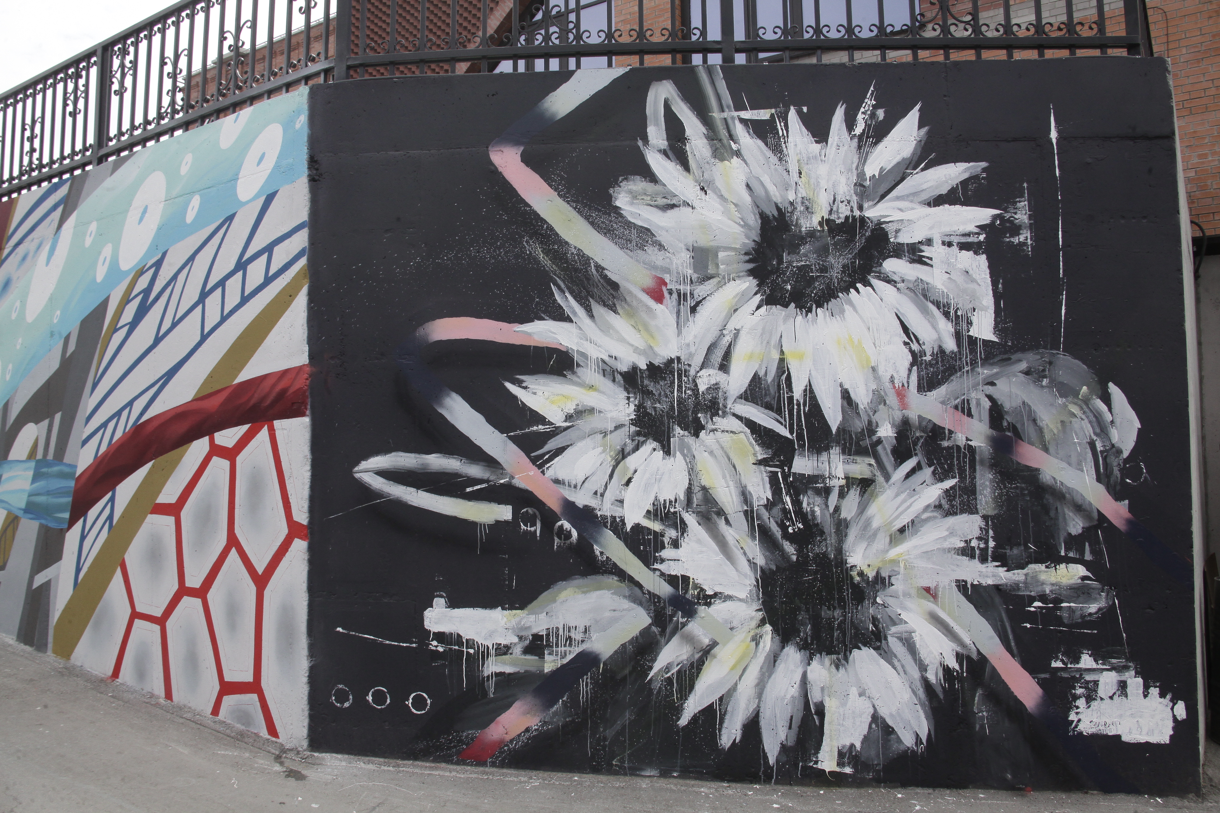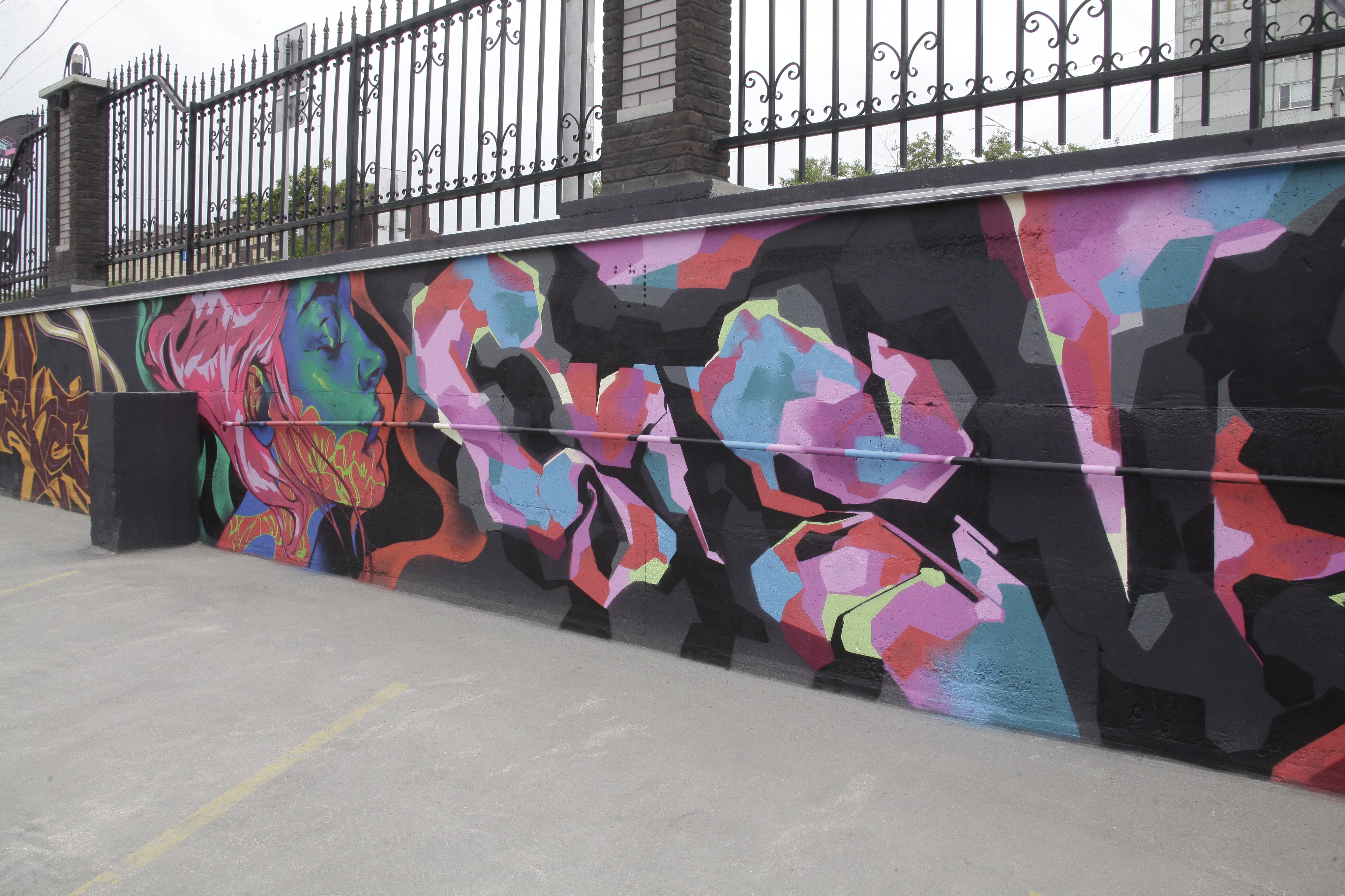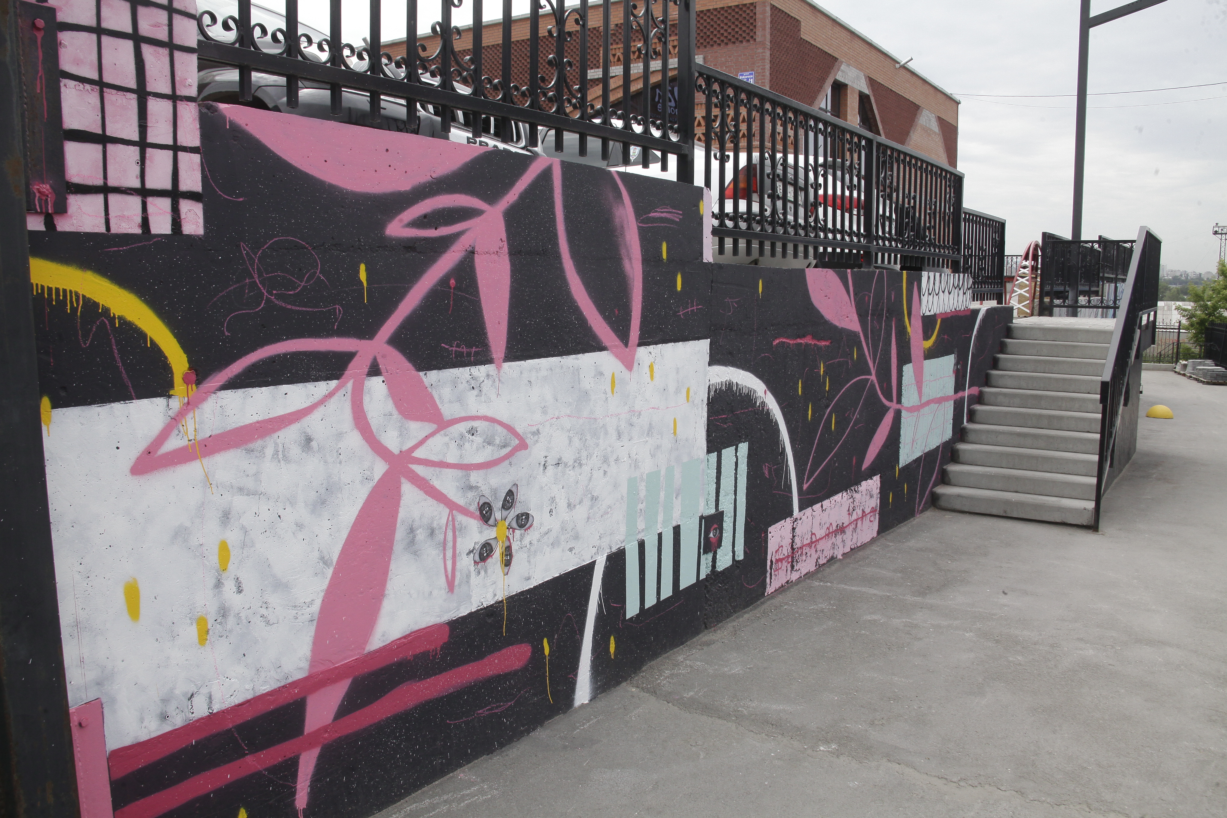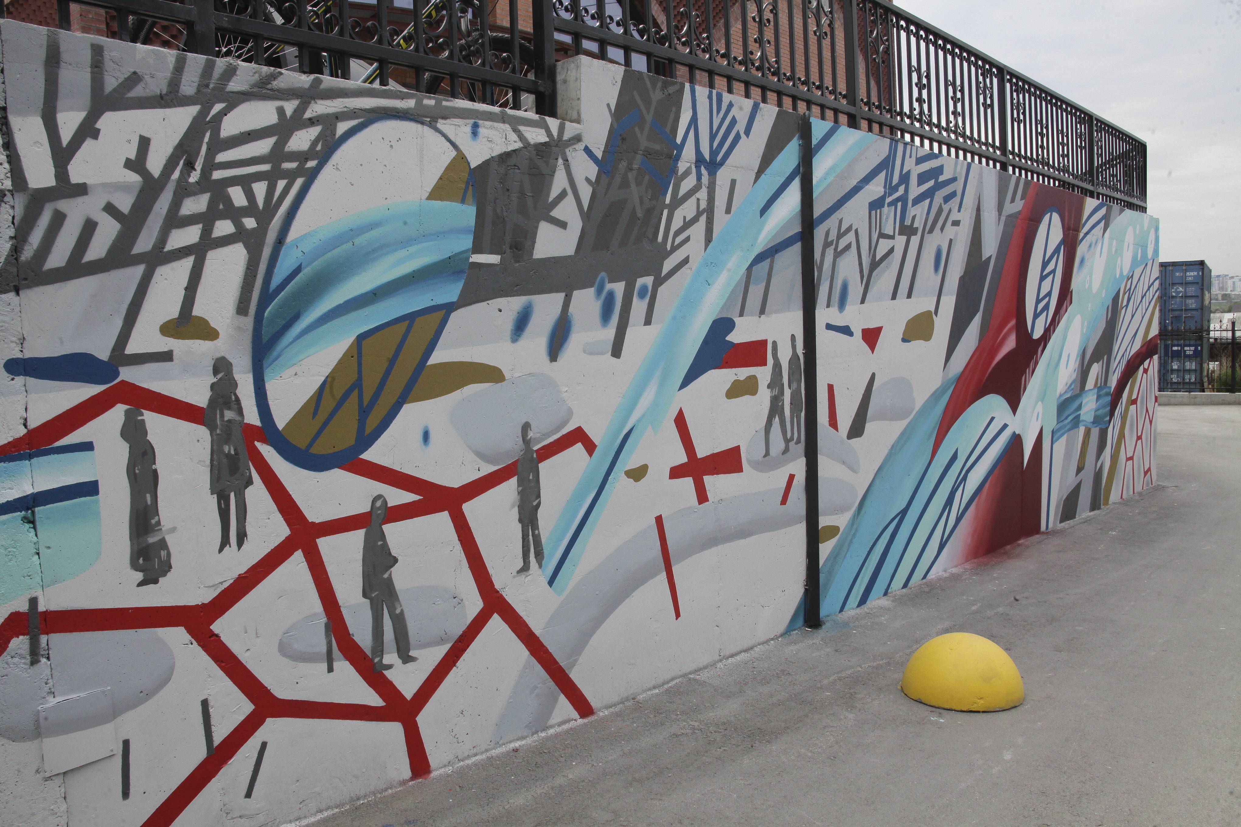 Всего художники создали 12 авторских работ. Это преимущественно надписи. Но среди них есть и мурал команды новосибирской художницы Янины Болдыревой. Они вместе с друзьями нарисовали, по её словам, «что-то про распад или сборку, людей и природу, как элементы для этой сборки, а также про взаимодействие абсолютно разных агентов, которое приводит к неожиданному результату».