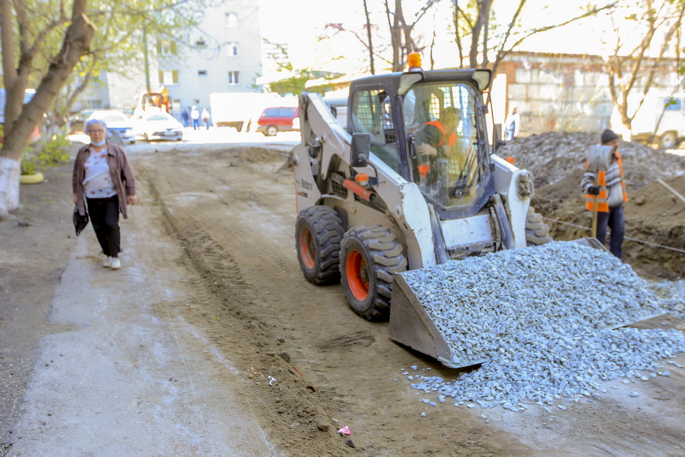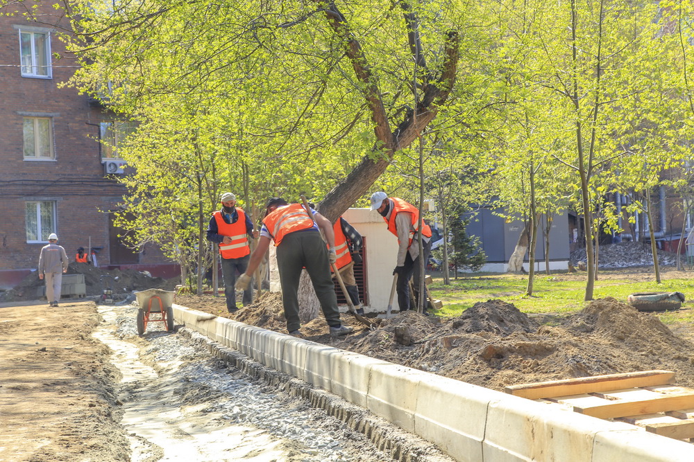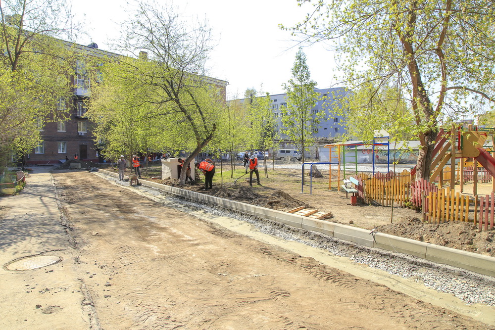 Этот двор отремонтировали по городской программе, она предусматривает благоустройство дорожек и проездов. Техника, рабочие, кучи земли и щебня — такая картина сейчас в трёх десятках дворов. Пять уже готовы. В этом году удалось приступить к масштабному благоустройству в апреле — жара наступила раньше обычного.