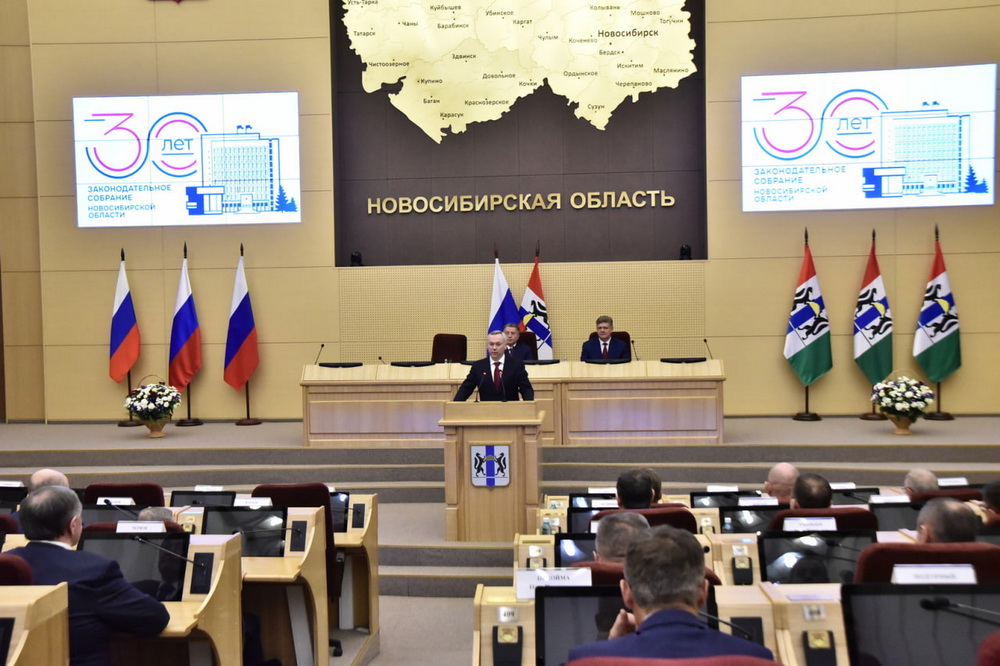Губернатор Андрей Травников поздравил депутатов, ветеранов и сотрудников законодательного собрания Новосибирской области с его юбилеем. Региональный парламент отмечает 30-летие со дня образования.