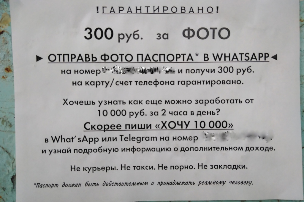 Свежие объявления о высоких и быстрых заработках массово расклеили на жилых домах в левобережье. В них обещают перевести на карточку или на номер телефона 300 рублей за фотографию вашего паспорта. Достаточно прислать его на номер WhatsАpp. А ещё в объявлении обещают научить, как за два часа в день заработать 10 000 рублей, не прикладывая для этого особых усилий.