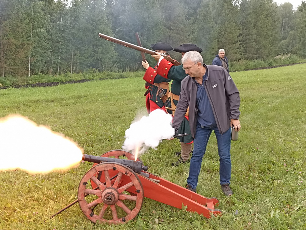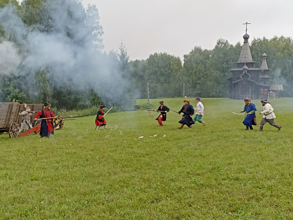 Чуть позже уже сборная команда реконструкторов с Урала, из Томска и Новосибирска разыграла историческое представление по вымышленному сюжету: оголодавшие служилые люди — казаки из сибирского острога, которым давно не платили жалование, — нападают на обоз с царским золотом, захватывают в плен купчину и требуют выкуп, но после нескольких боестолкновений с применением огнестрельного оружия выходят на мирное урегулирование конфликта с сопровождающими повозку русскими солдатами Преображенского полка и шведами. Кстати, шведы в Сибири в XVIII веке — это не фантастика. Царь Пётр после Полтавской битвы ссылал пленных офицеров в Тобольск.