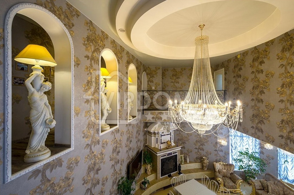 Коттедж в Матвеевке площадью 500 кв. метров. Есть банкетный зал для любого торжества, просторная зона отдыха с сауной и огромным бассейном, зал для бильярда, 10 уютных спален. Во дворе — большая крытая веранда, пруд и альпийская горка. Парковка на 8 автомобилей.