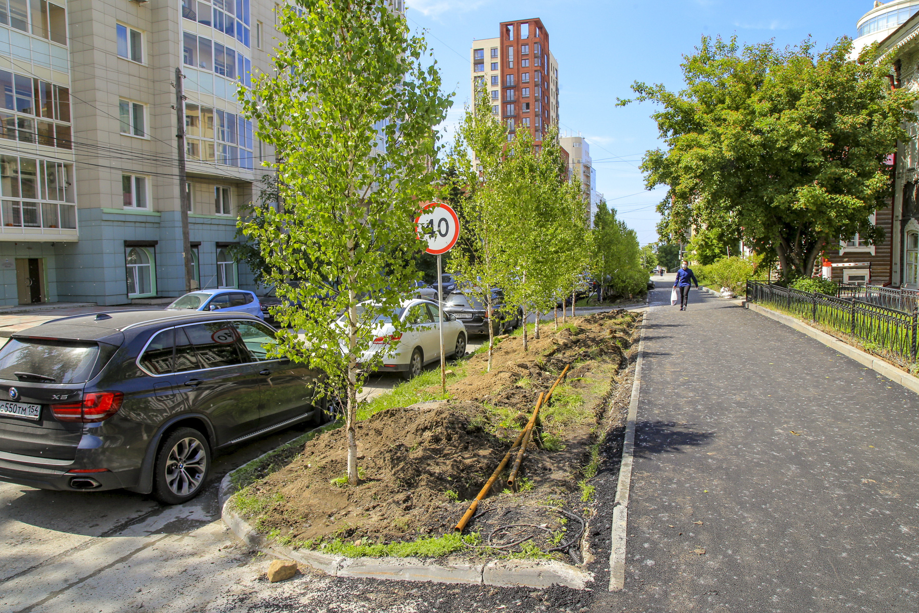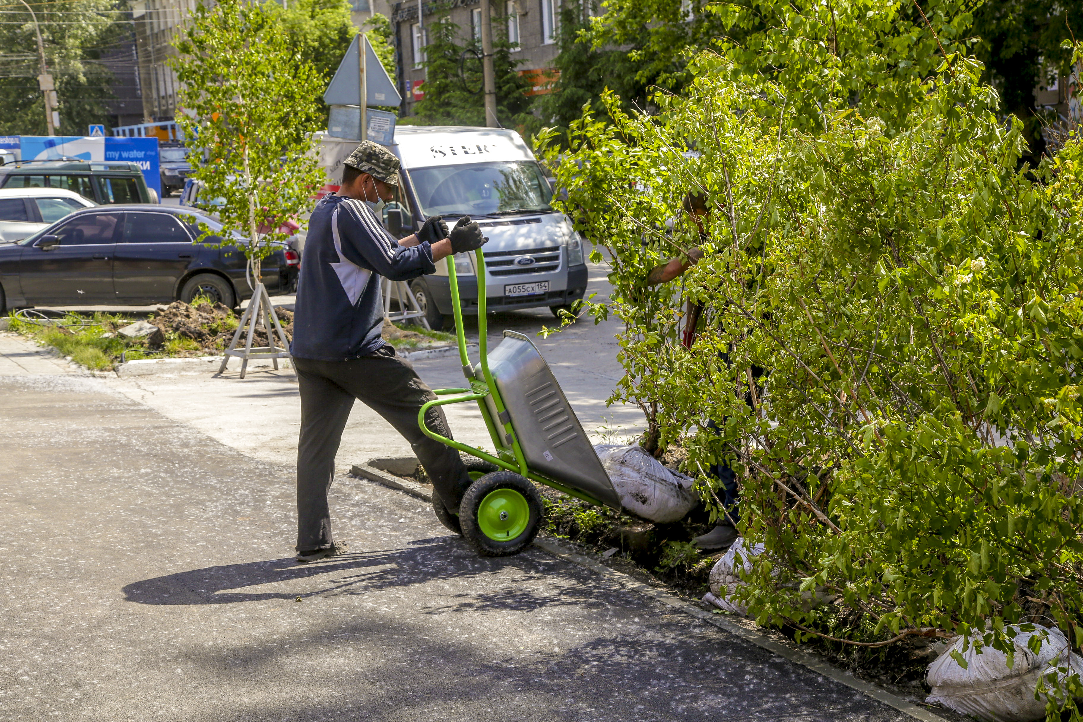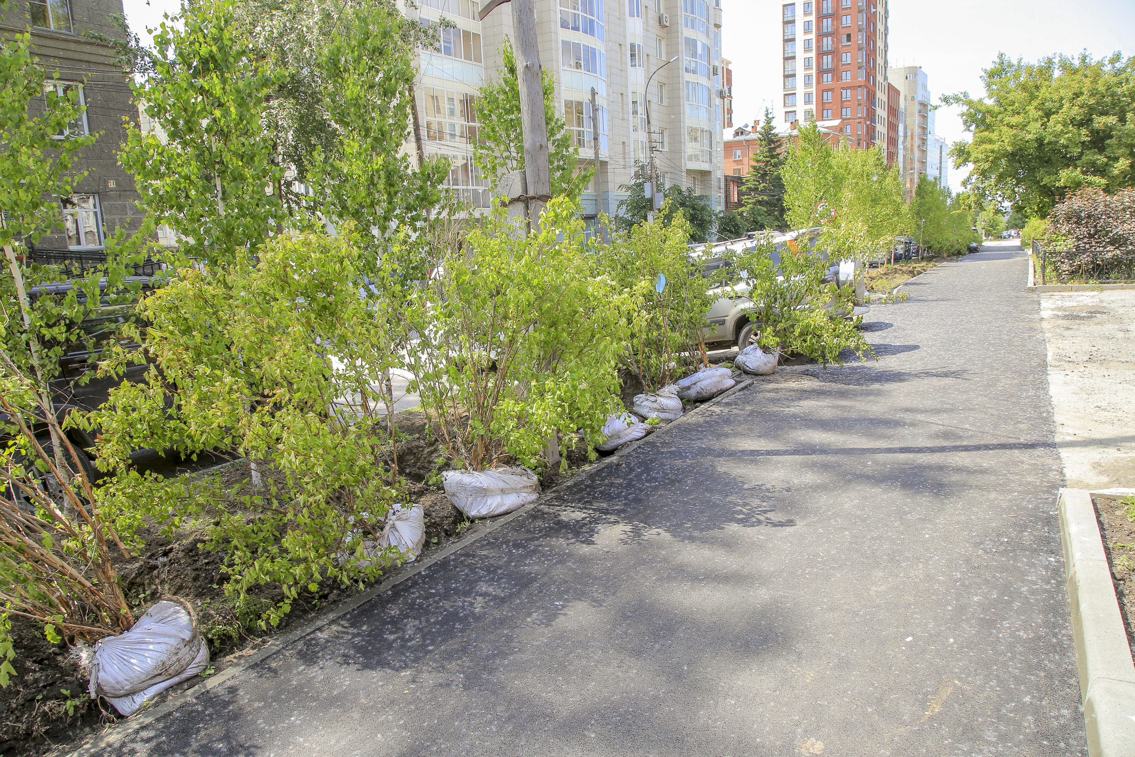 На улице Коммунистической в Центральном районе Новосибирска рабочие завершают высадку деревьев и кустарников.
