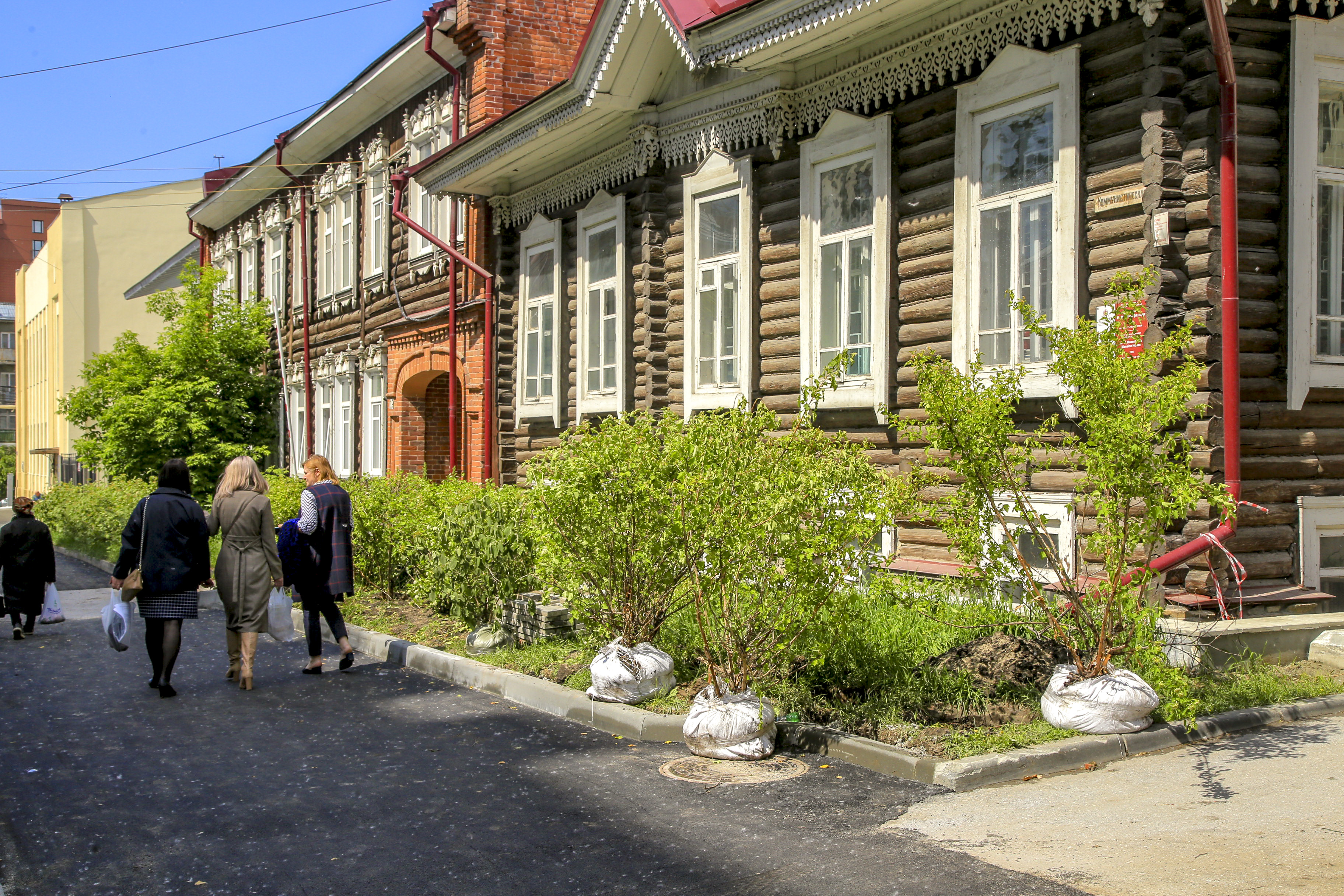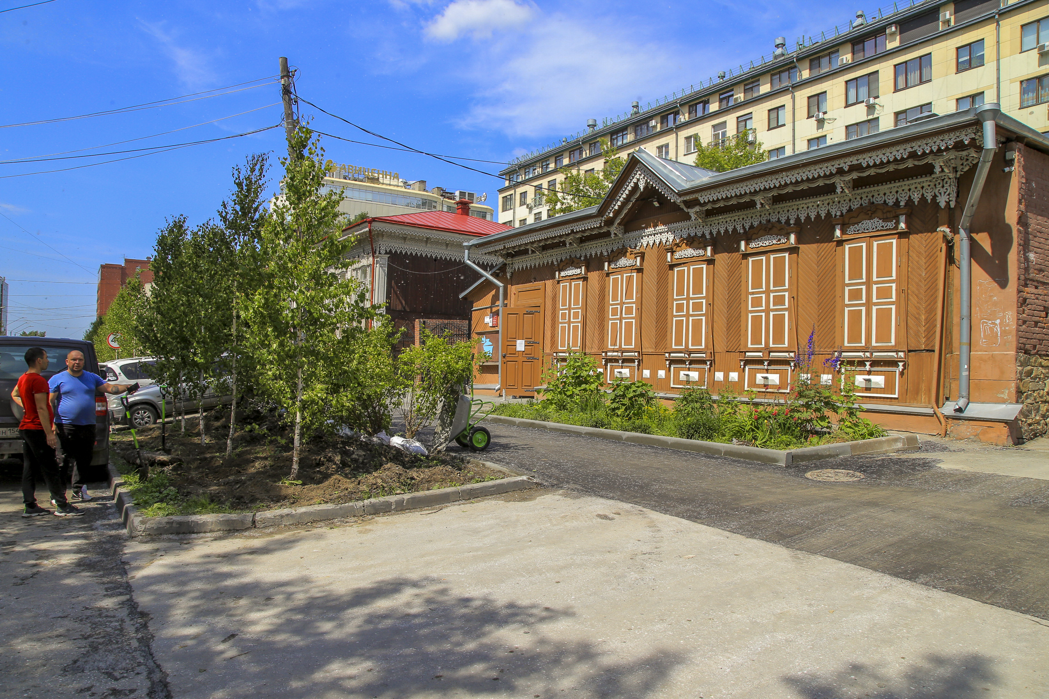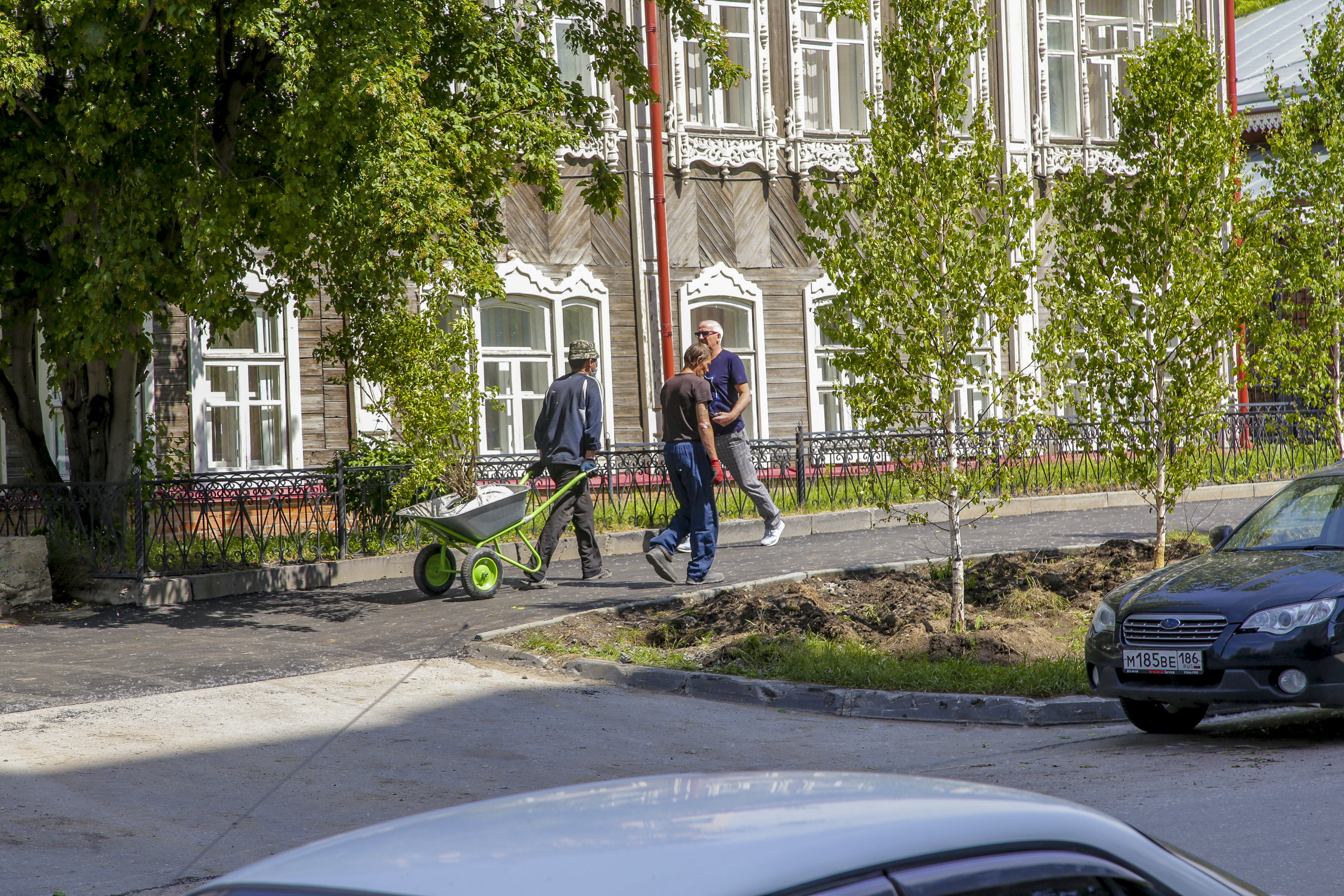На улице Коммунистической в Центральном районе Новосибирска рабочие завершают высадку деревьев и кустарников.