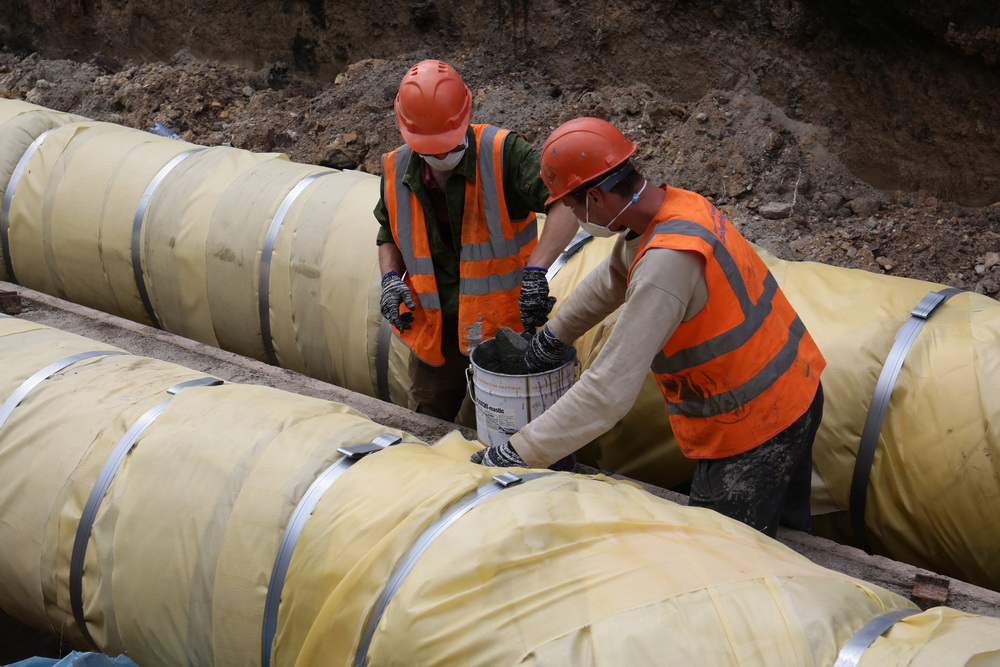 Гидроизоляцию швов защитного лотка делают, когда трубы уже полностью уложены. Работу подрядчики ведут поэтапно. Сначала меняют трубы, потом их теплоизолируют, а потом уже на готовых участках проводят гидроизоляцию лотков, в которые эти трубы и уложены, чтобы защитить их от внешних негативных влияний. Дальше то же самое произойдёт и с трубами, которые пока ещё не покрасили.