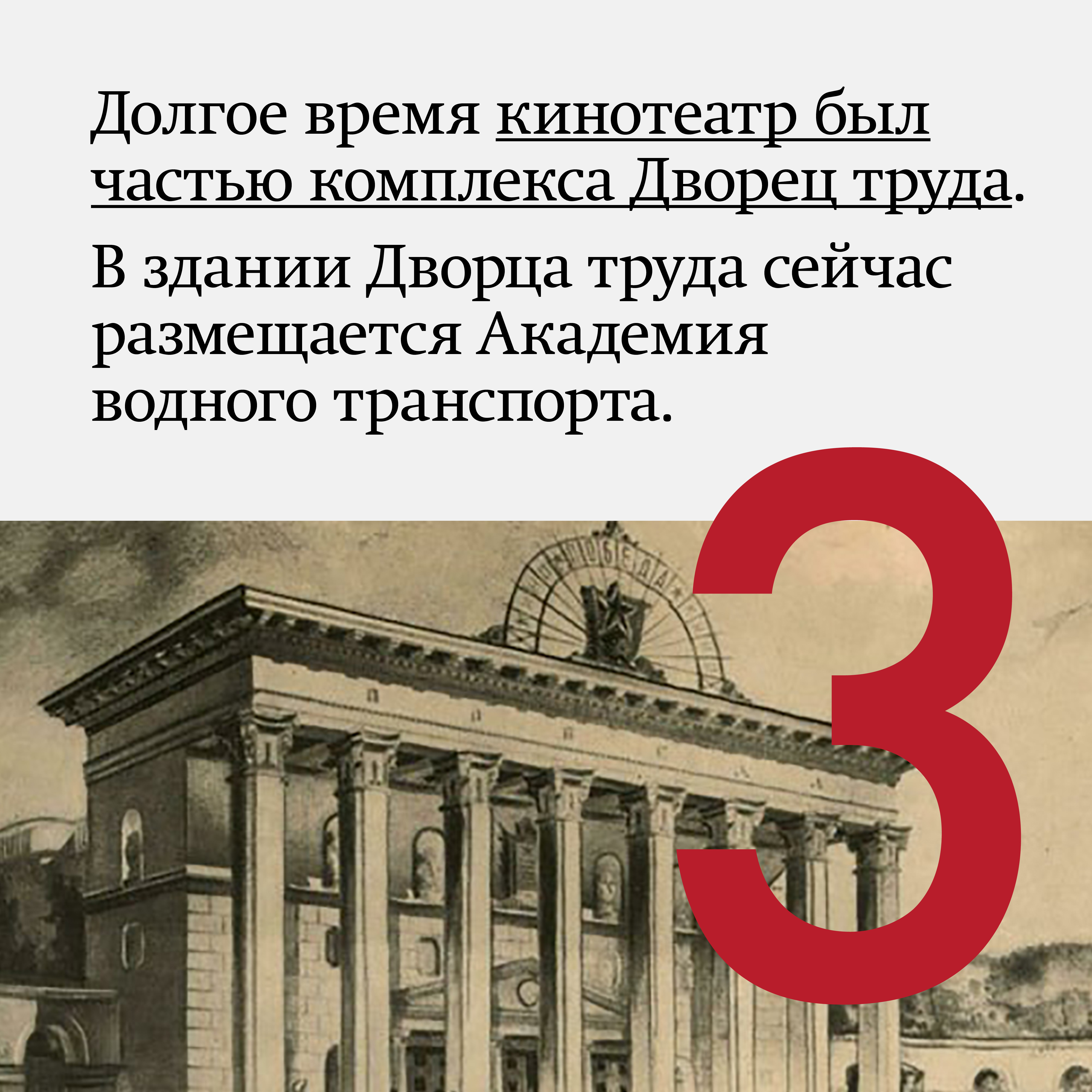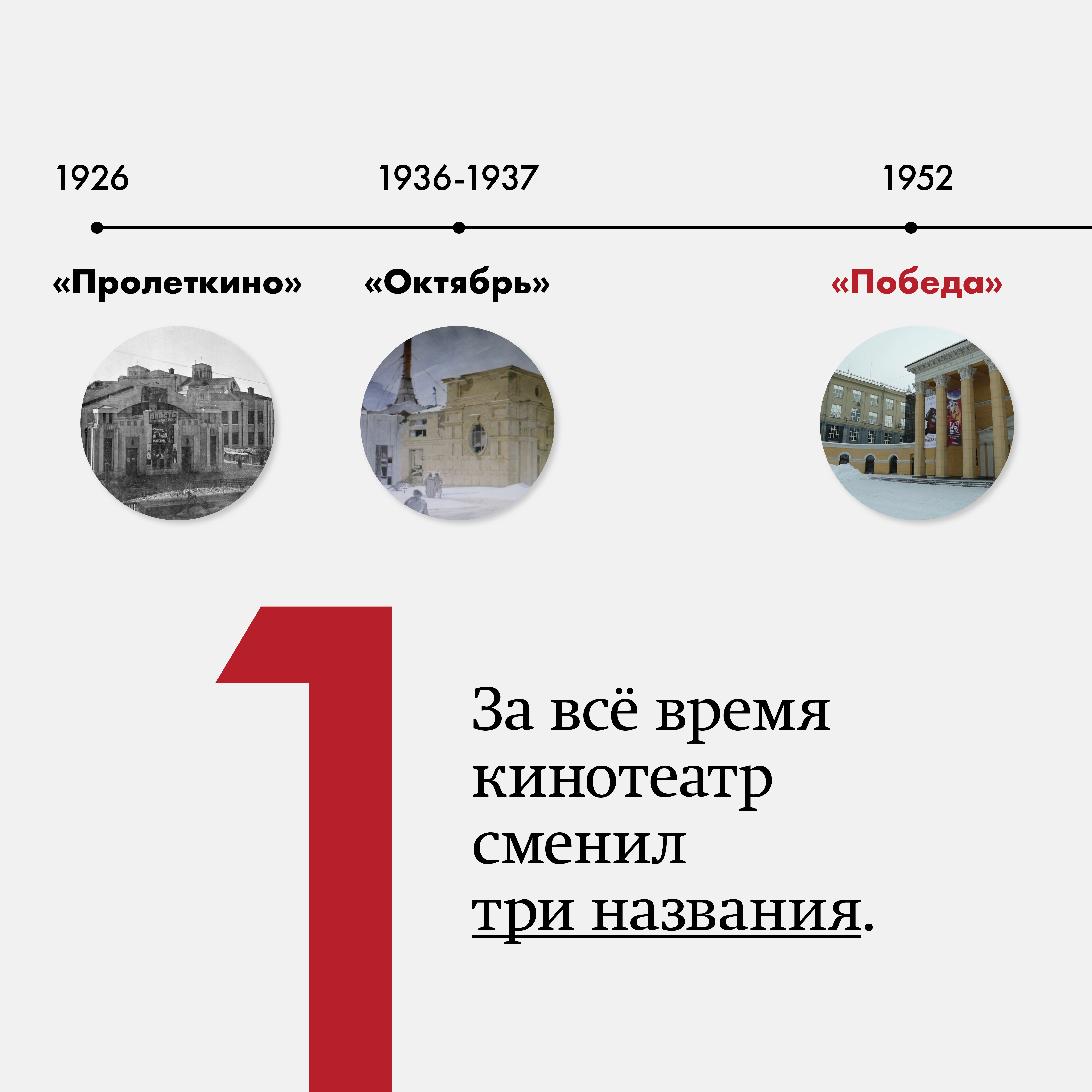 Во время войны в кинотеатре, как и на многих площадках подобного рода, располагалось оборонное предприятие. После этого здание пришло практически в полную негодность. Так оставлять было нельзя, поэтому кинотеатр переделали и дали ему новое название — «Победа».
