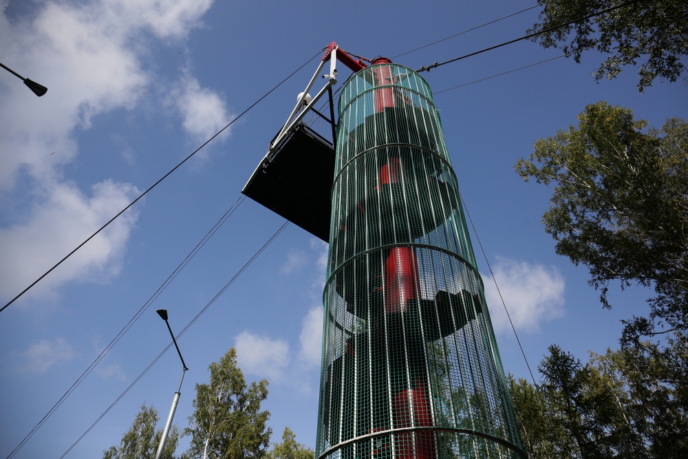 Для тех, кто не знает: тарзанка в Бугринке представляет собой 16-метровую башню, откуда, собственно, и начинается экстремальное путешествие. Двигаясь по тросу на скорости 70 км/час, можно пролететь не только над парком, но и под Бугринским мостом.