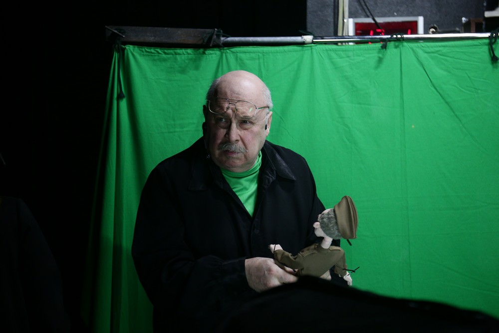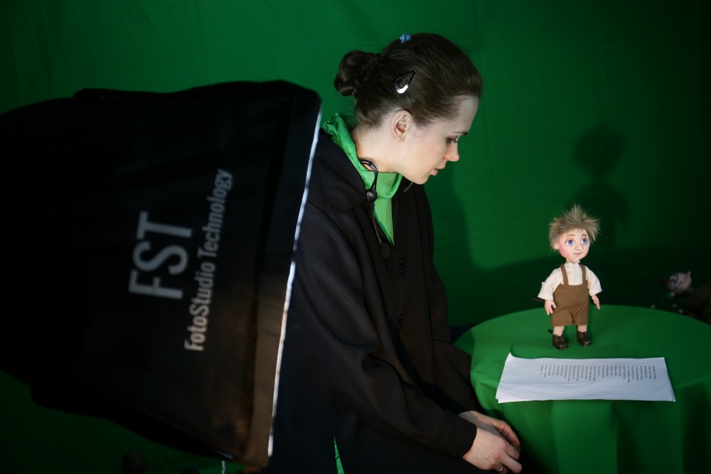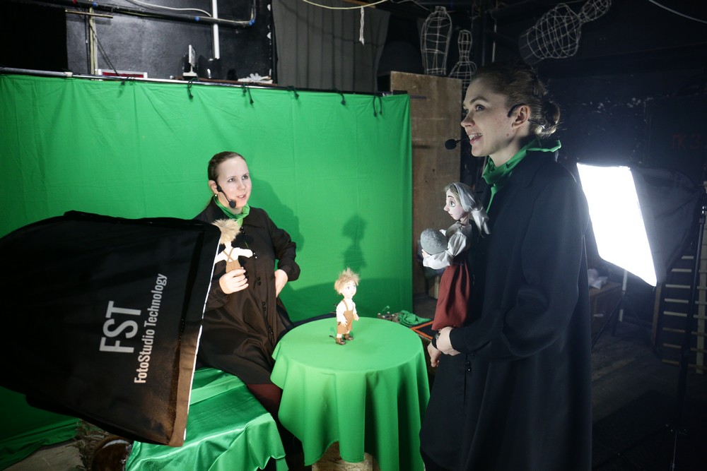 «Снимаем по технологии хромакей. Мы надеваем костюмы из специального зелёного материала, зелёные перчатки. И нас не видно. Снимаем онлайн, накладывается специальный фон, который нарисован художником, и мы на этом фоне играем», — рассказывает артист-кукловод Новосибирского областного театра кукол Ольга Елисеева.