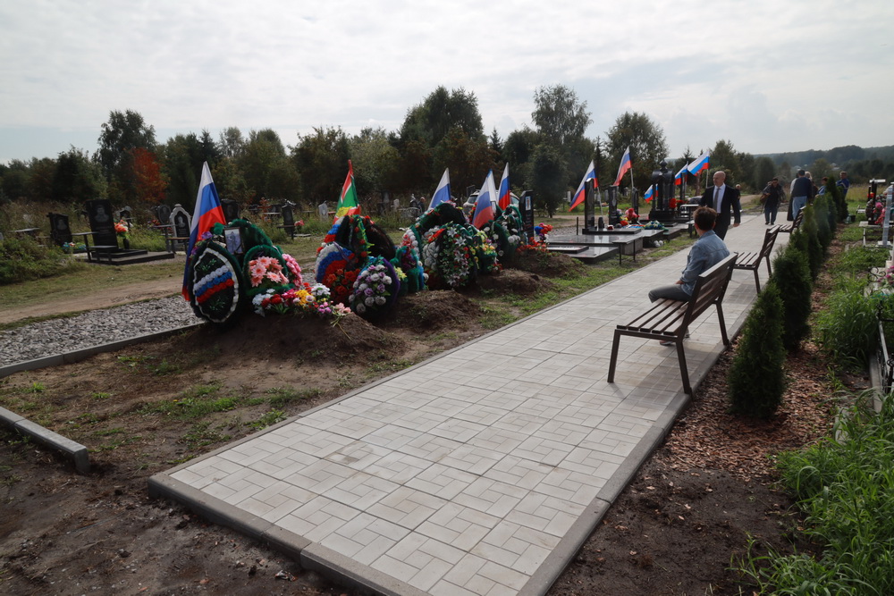 Воинские захоронения соединили тротуаром из светлой плитки с лавочками. Родственники погибших высадили 13 туй в память о каждом бойце.