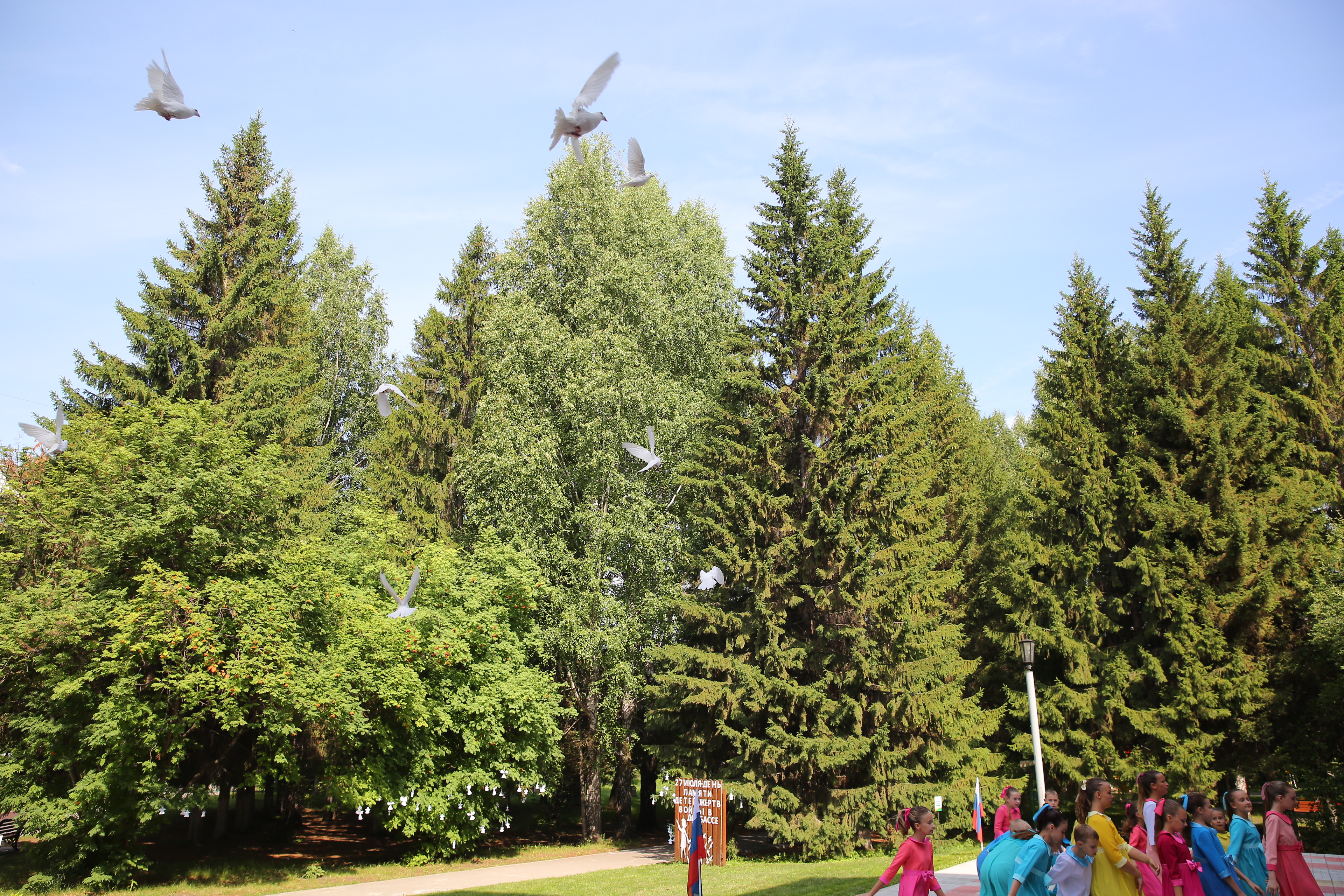 Десятки символических фигурок, сделанных детскими руками, появились на деревьях у центра социальной помощи семье и детям «Заря», а в небо взмыли белые голуби. Ребятишкам, живущим в мирном Новосибирске, нужно рассказывать о сверстниках, погибших от взрывов и пуль в Донбассе, но делать это стоит нестрашным языком метафор.