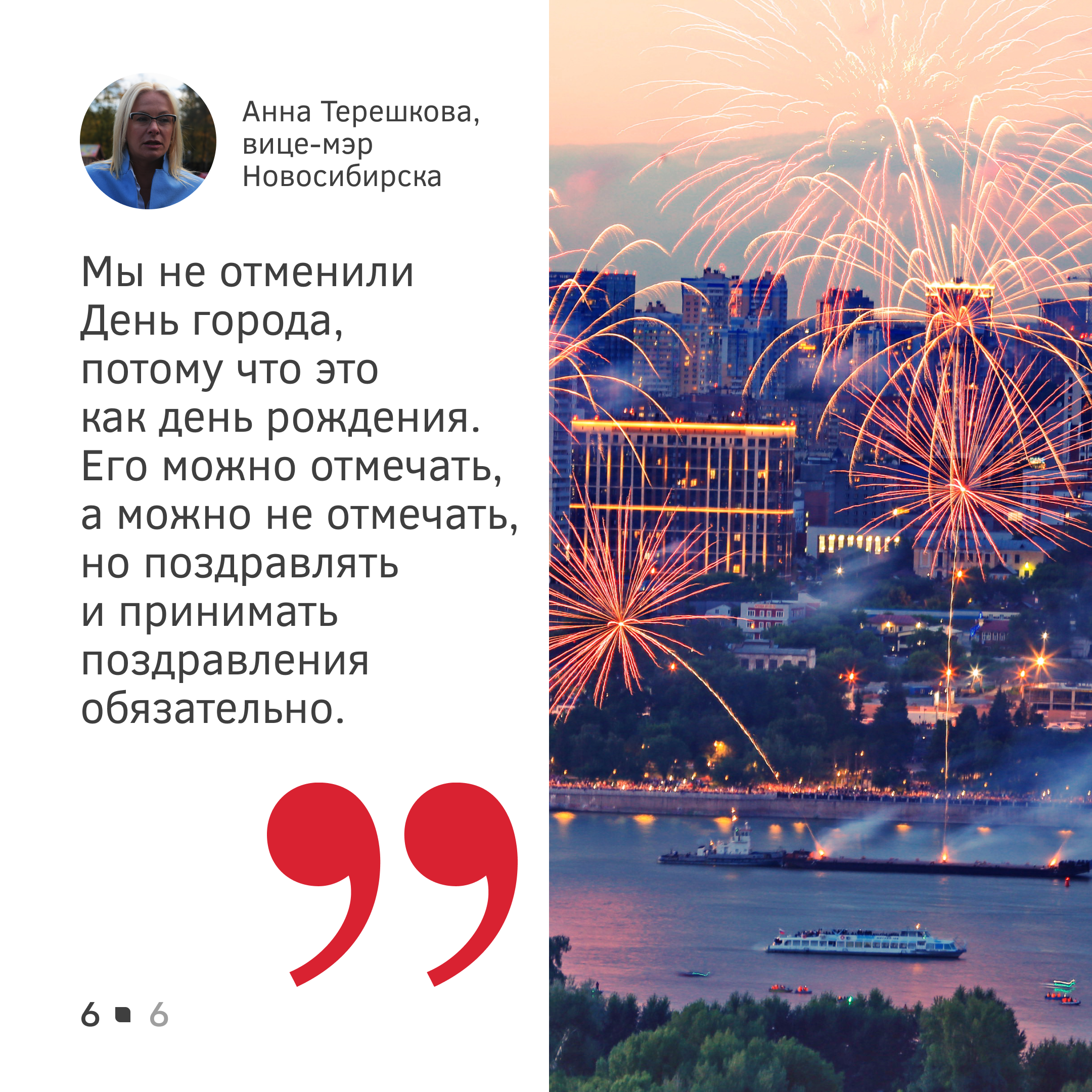 «Принято решение провести торжественное собрание, чтобы сказать спасибо людям, благодаря которым Новосибирск растёт и развивается. Все остальные массовые мероприятия, которые мы планировали, будут отменены. Мы не отменили День города, потому что это как день рождения. Его можно отмечать, а можно не отмечать, но поздравлять и принимать поздравления обязательно», — сообщила Анна Терешкова.