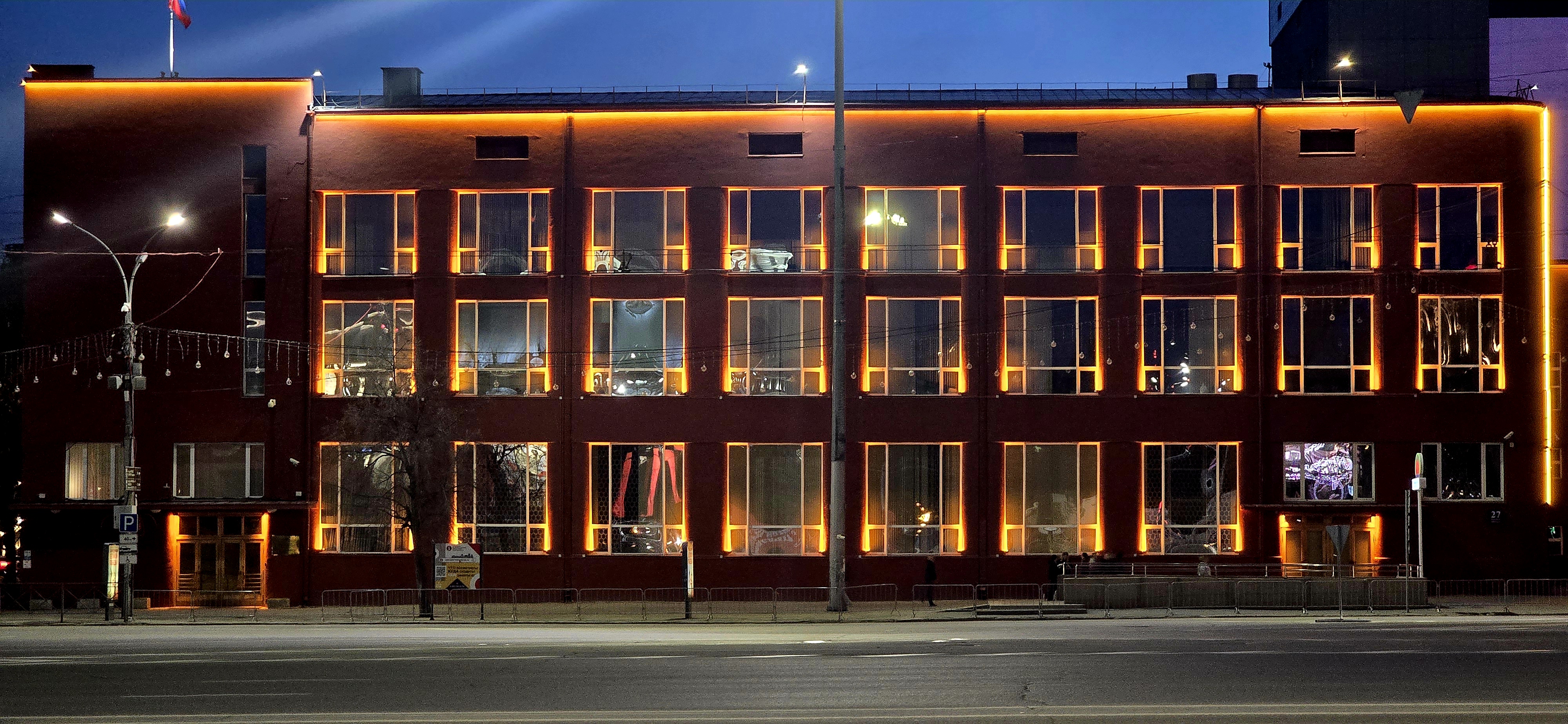 Здание на Красном проспекте, 27 построили в 1930 году по проекту архитектора Андрея Крячкова. Это памятник конструктивизма. К юбилею Победы на фасаде установили освещение тёплого оттенка, которое подчеркнуло строгие геометрические формы корпуса.