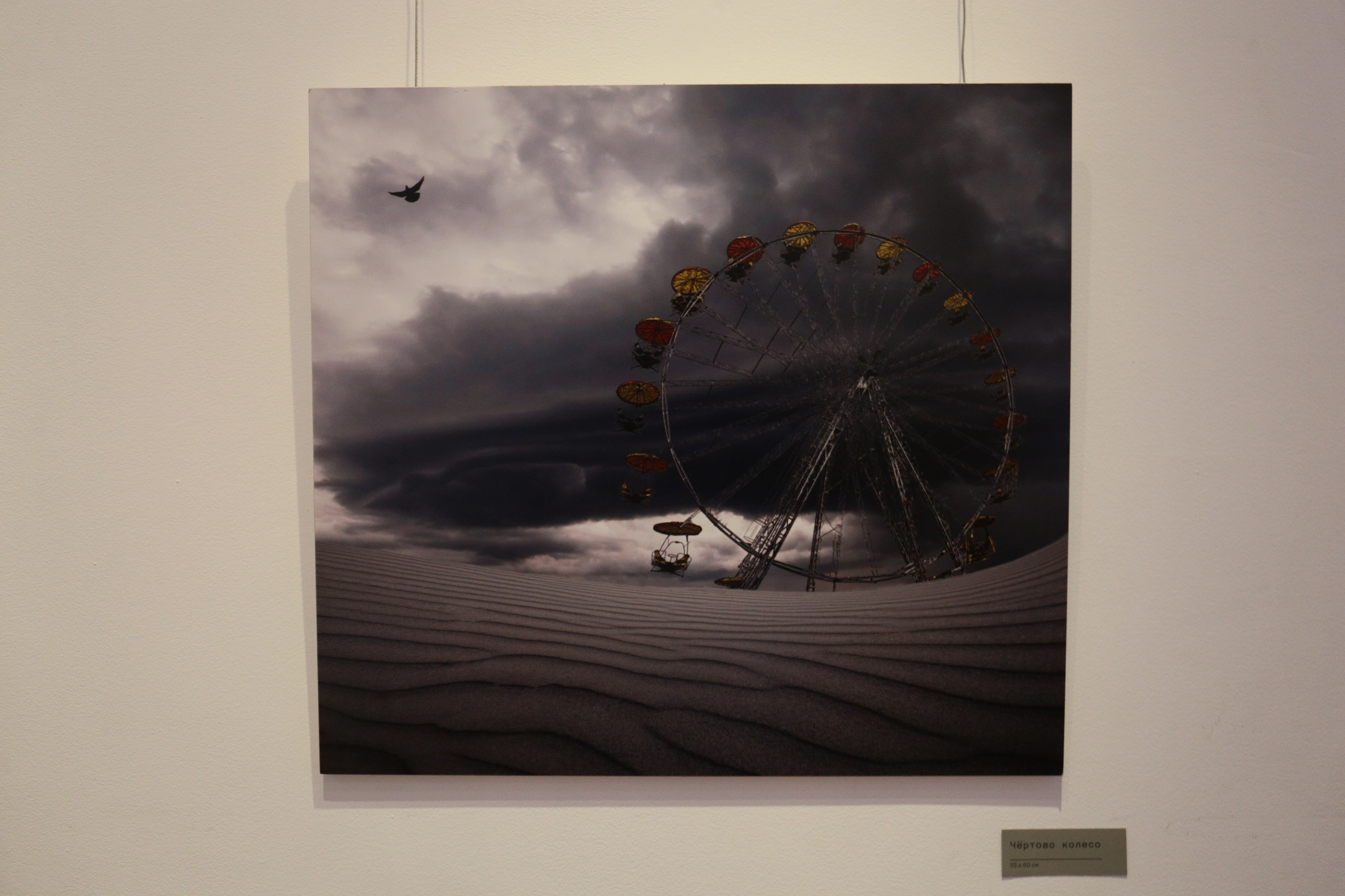 Из всех снимков на выставке дольше всего фотограф создавал работу «Чёртово колесо». Этот ассоциативный пейзаж он собирал из разных локаций. Птицы и небо фотографировал на даче, песок — на пляже, чёртово колесо — в Центральном парке. Сложнее всего было вырезать в фотошопе городской фон из исходной фотографии колеса.