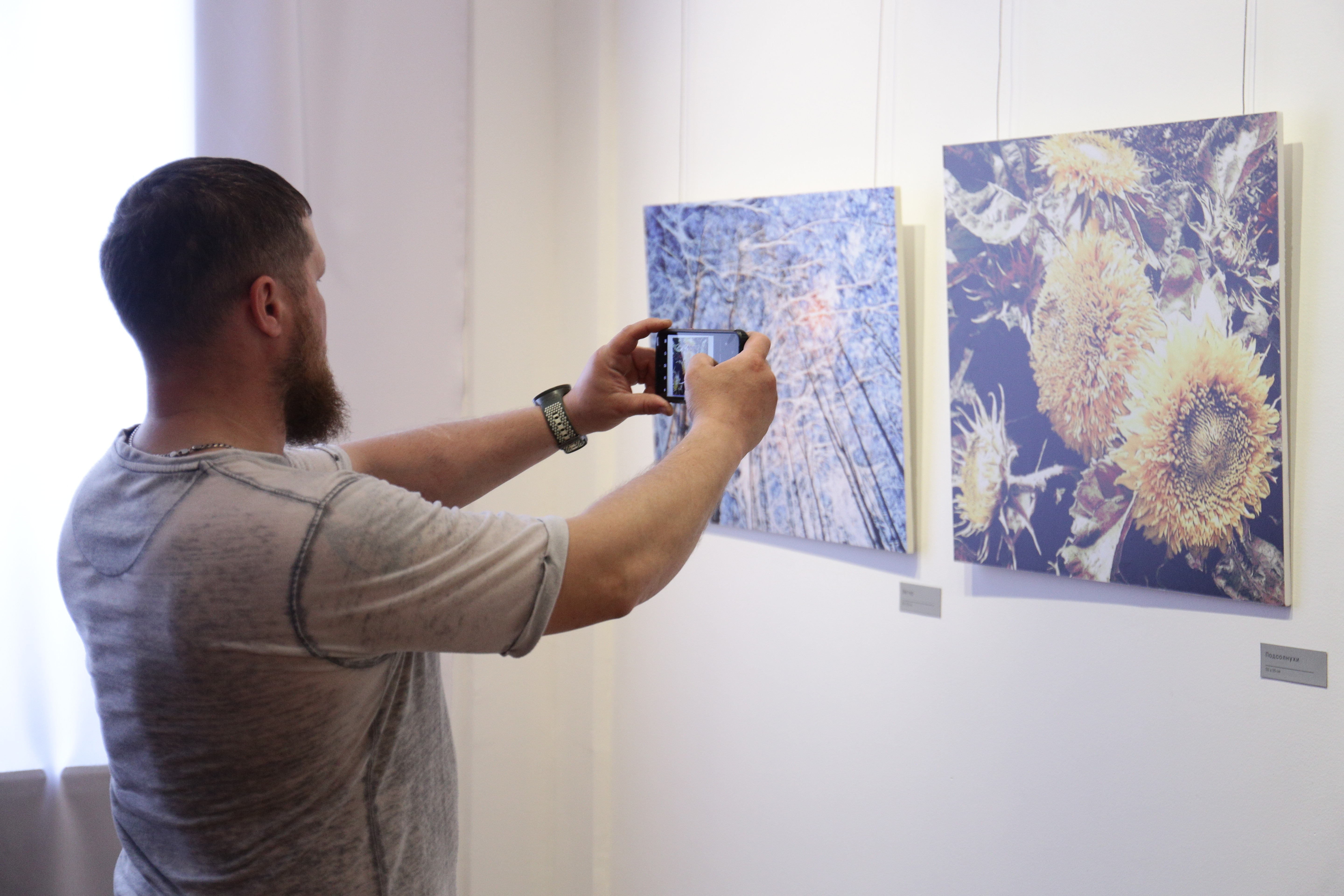 По другую сторону выставочного зала — работы друга, напарника Константина Ощепкова. Он снимает пейзажи и обнажённую натуру. Фотография для него — это возможность отдохнуть, отточить навыки, получить удовольствие от процесса. Один из экспериментов — инфракрасные пейзажи.