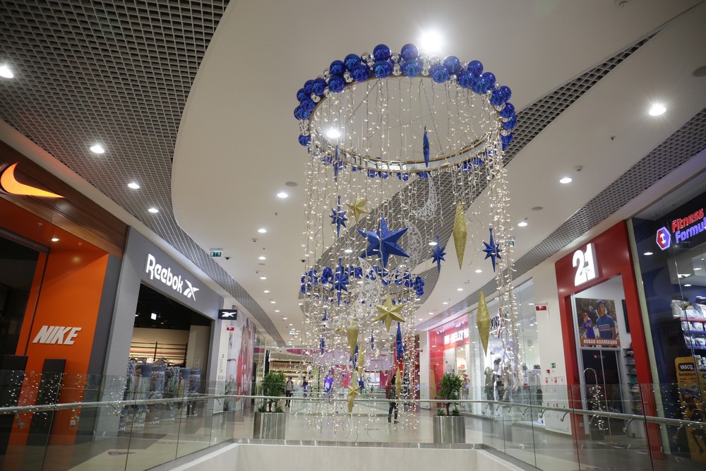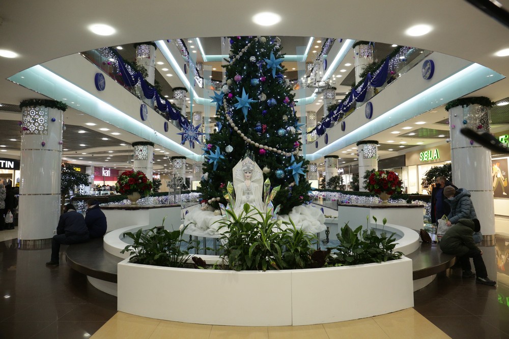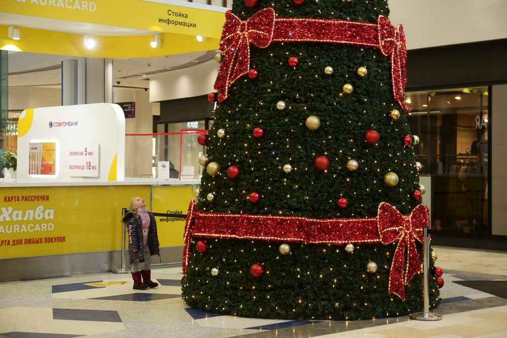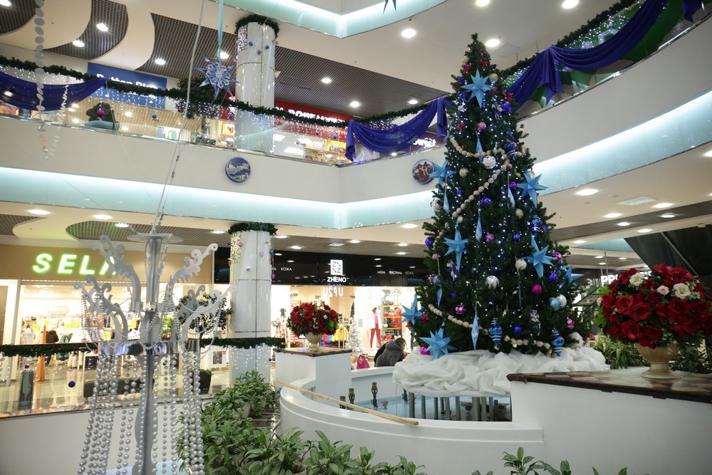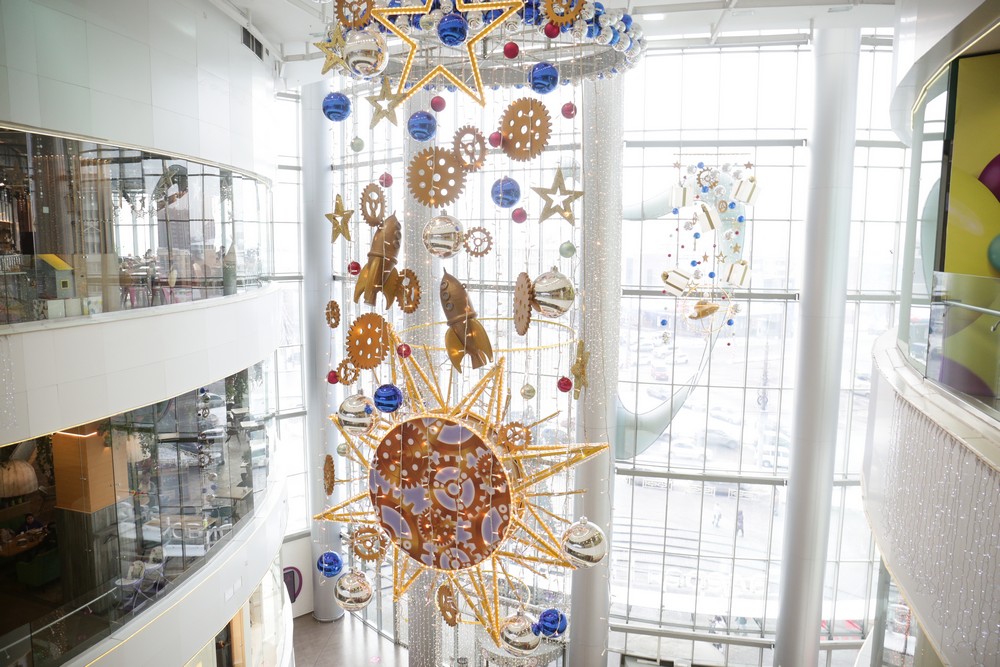 Галереи и атриумы торговых центров сейчас больше напоминают чудные декорации новогодних волшебных сказок. Тут всё сверкает и горит, а с высоких потолков свисают гигантские новогодние атрибуты — ёлки, сосульки, шары и коробки с подарками.