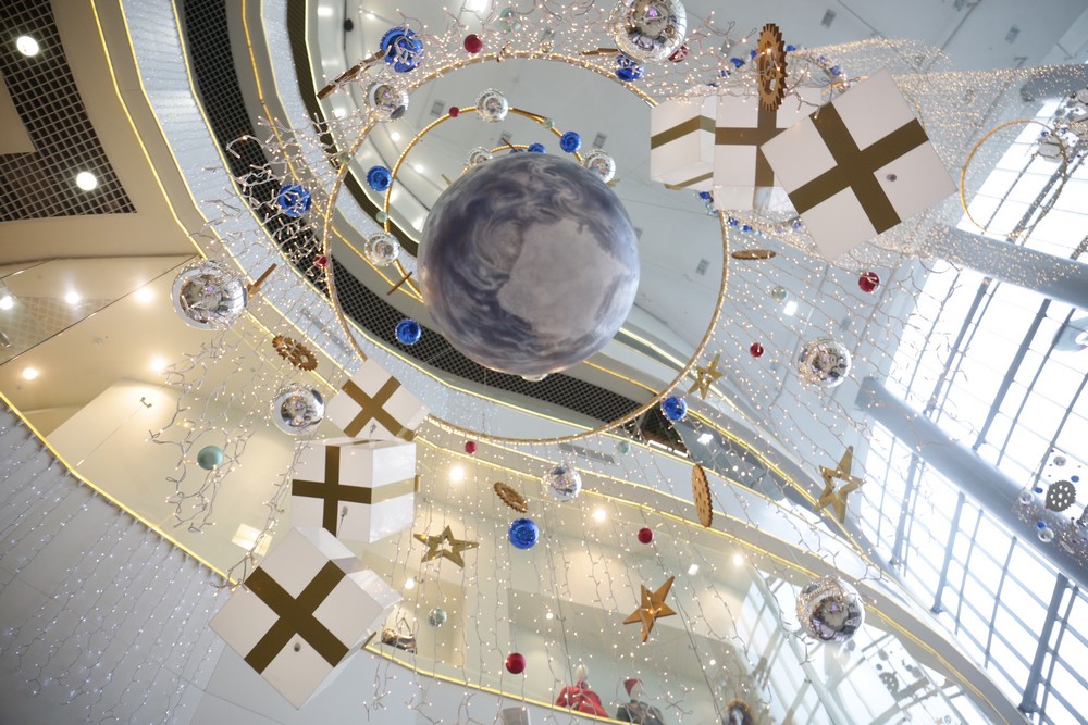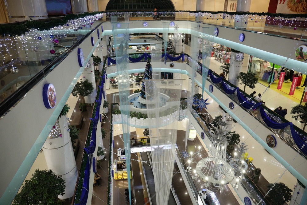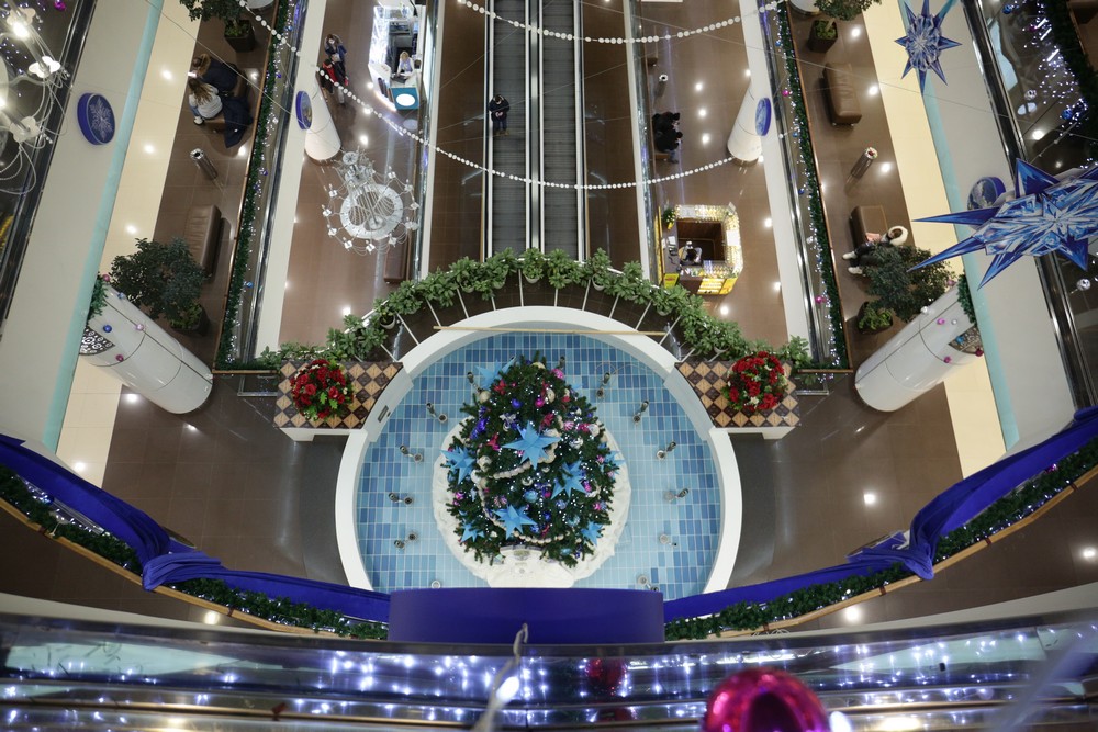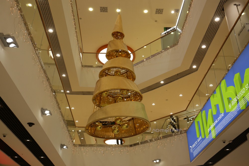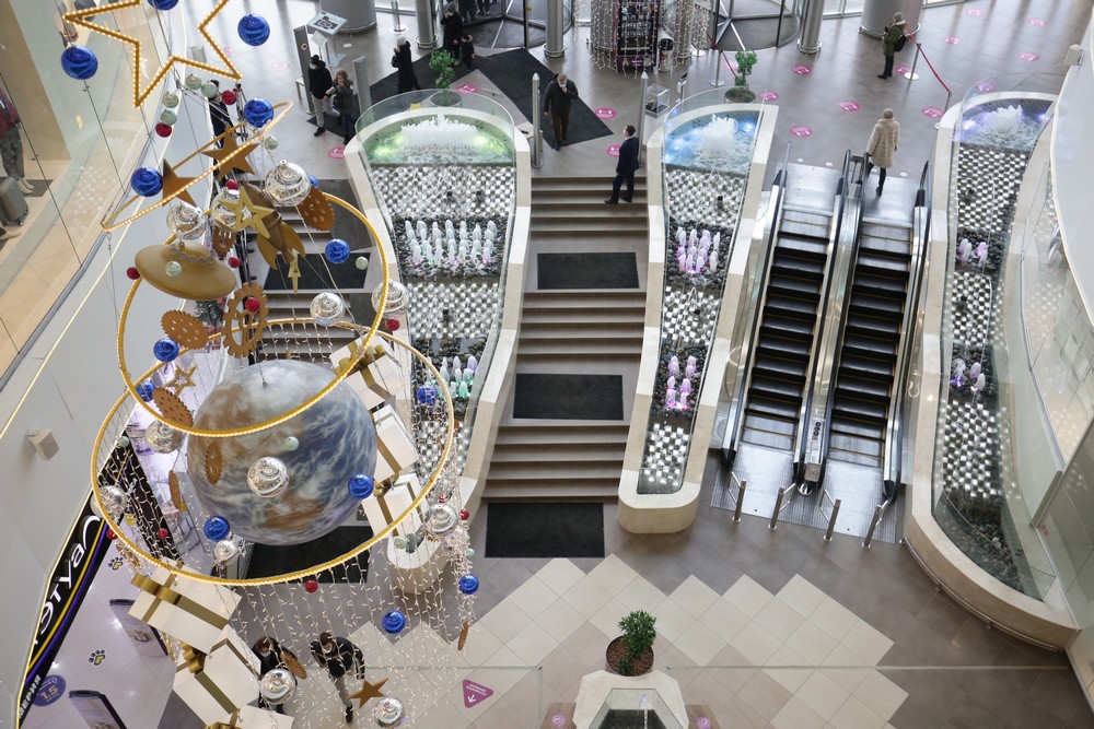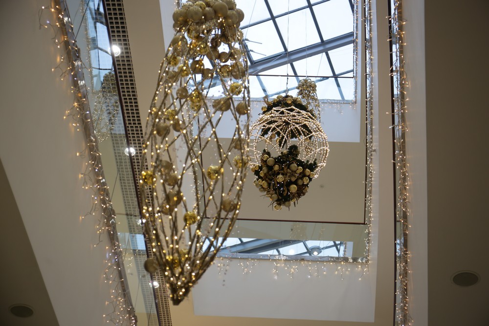 Галереи и атриумы торговых центров сейчас больше напоминают чудные декорации новогодних волшебных сказок. Тут всё сверкает и горит, а с высоких потолков свисают гигантские новогодние атрибуты — ёлки, сосульки, шары и коробки с подарками.