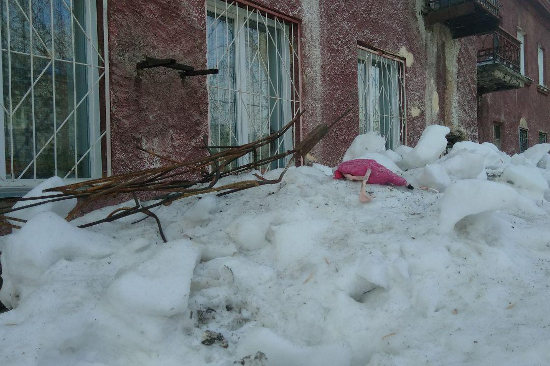 Здесь мы видим, что на крышах есть снег и красивые сосульки, которые могут упасть на голову ребёнка. Здесь выход — установить собственника. Помимо того, что нужно вывезти снег... Сейчас мы видим, что местами снег лежит большой уплотнённой кучей. Его просто так не вывезти, сначала нужно раздолбить, а уже потом погрузить и увезти. Чтобы соседние дома не пострадали. Здесь просто нужно налаживать диалог.