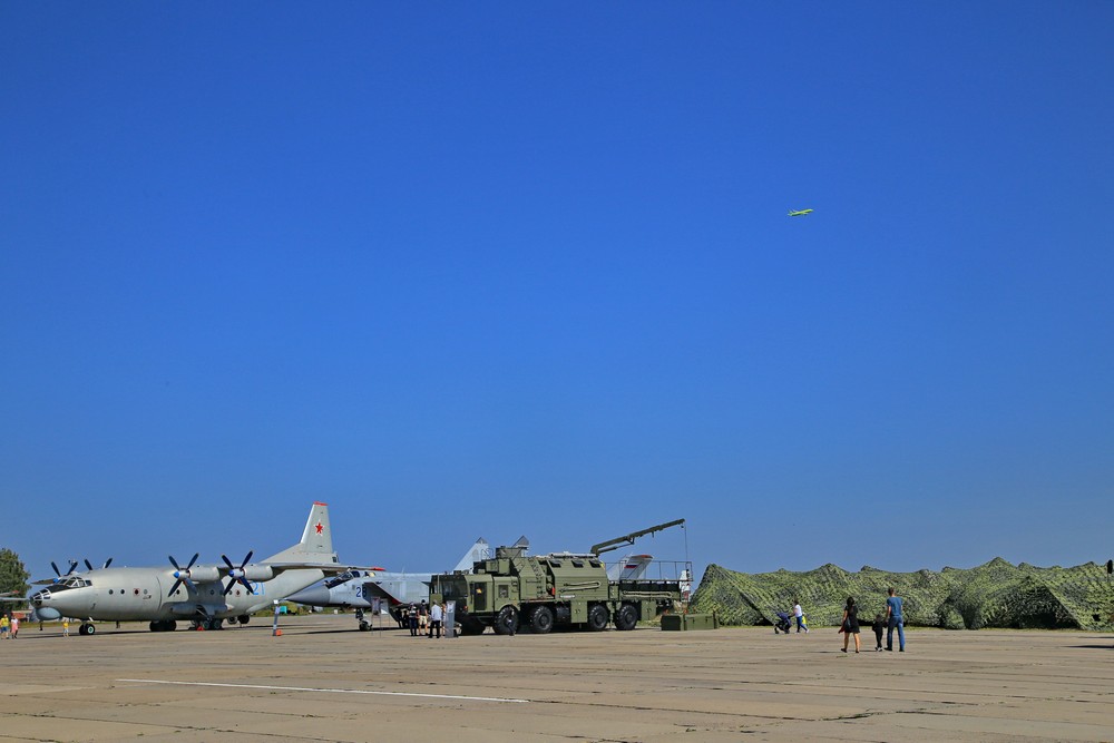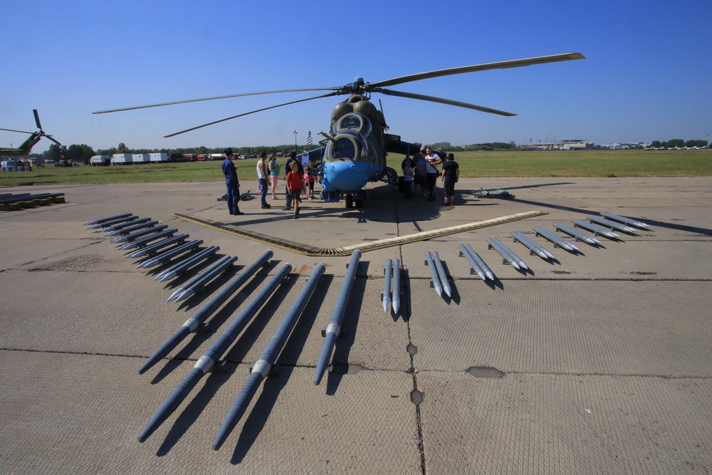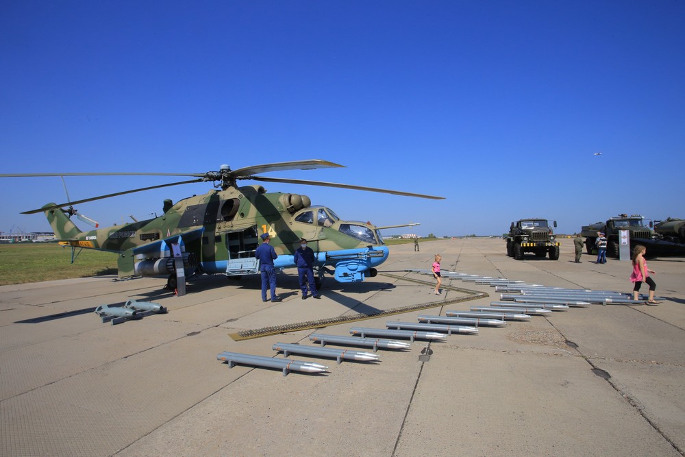 Ми-24 — летающий танк, или, как его ещё называют, «крокодил». Вертолёт харизматичный во всех отношениях: и с точки зрения технической эстетики он, безусловно, красив, и с точки зрения огневой мощи и лётных качеств. В кабину не пускают — правила безопасности и секретности. Ну, зато по бронированному боку этого зверя можно похлопать.