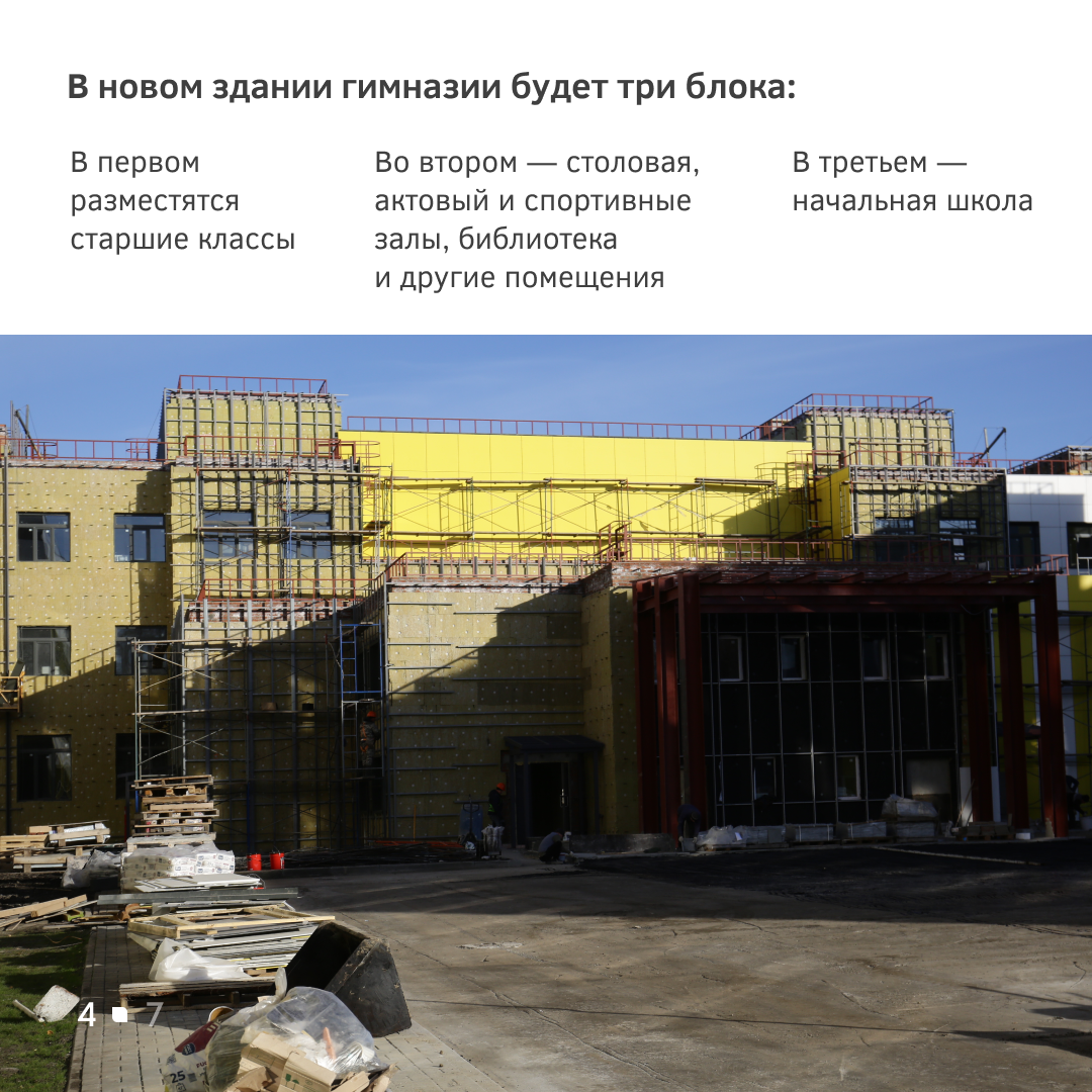 В новом здании гимназии будет три блока. В первом разместятся старшие классы, во втором — столовая, актовый и спортивные залы, библиотека и другие помещения, а в третьем — начальная школа. Подрядчику осталось завершить благоустройство и закончить внутреннюю отделку в блоке «Б». Два блока — «А» и «В» — уже готовы полностью. Появление таких больших школ позволит обучать детей в одну смену.