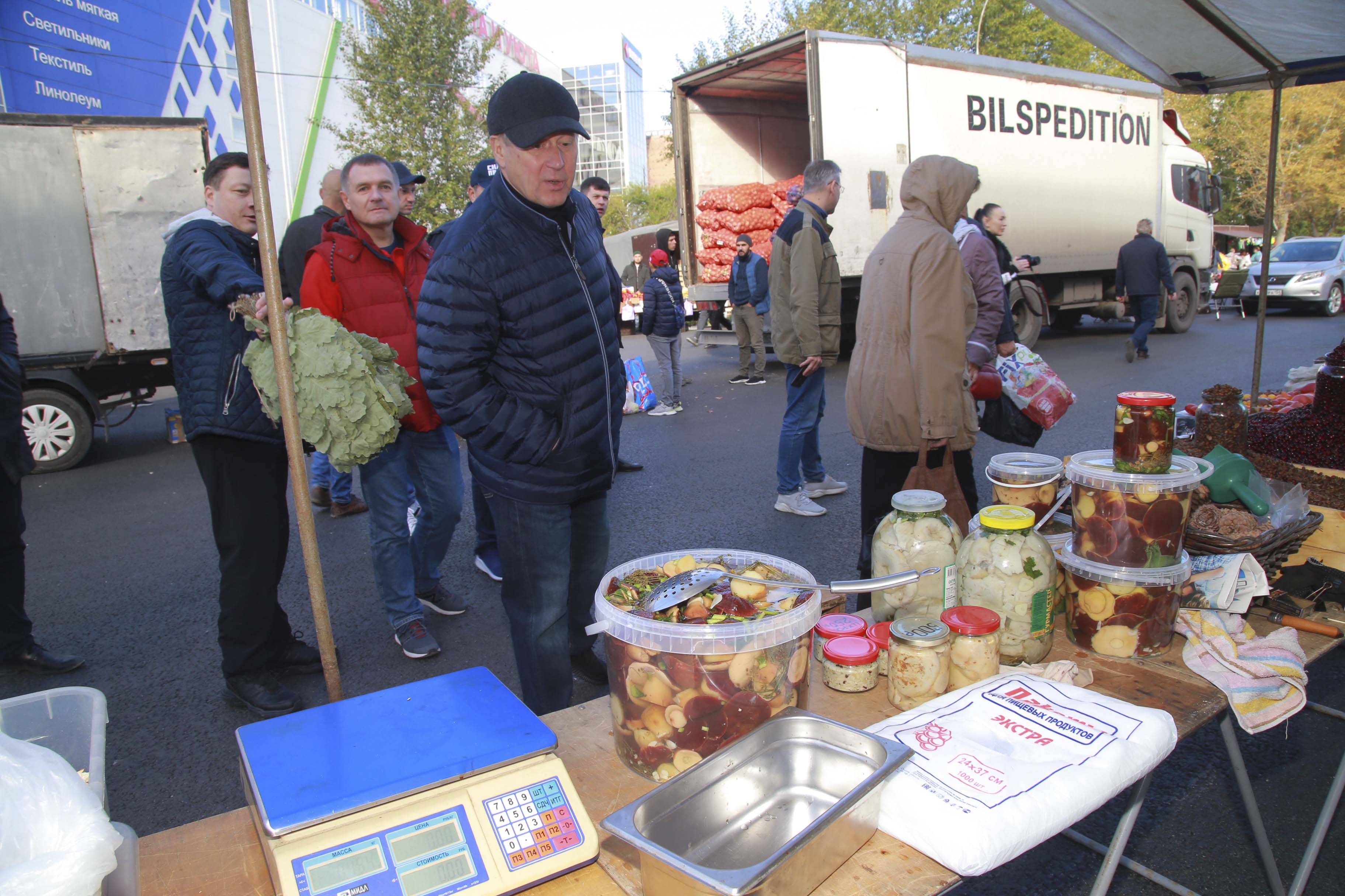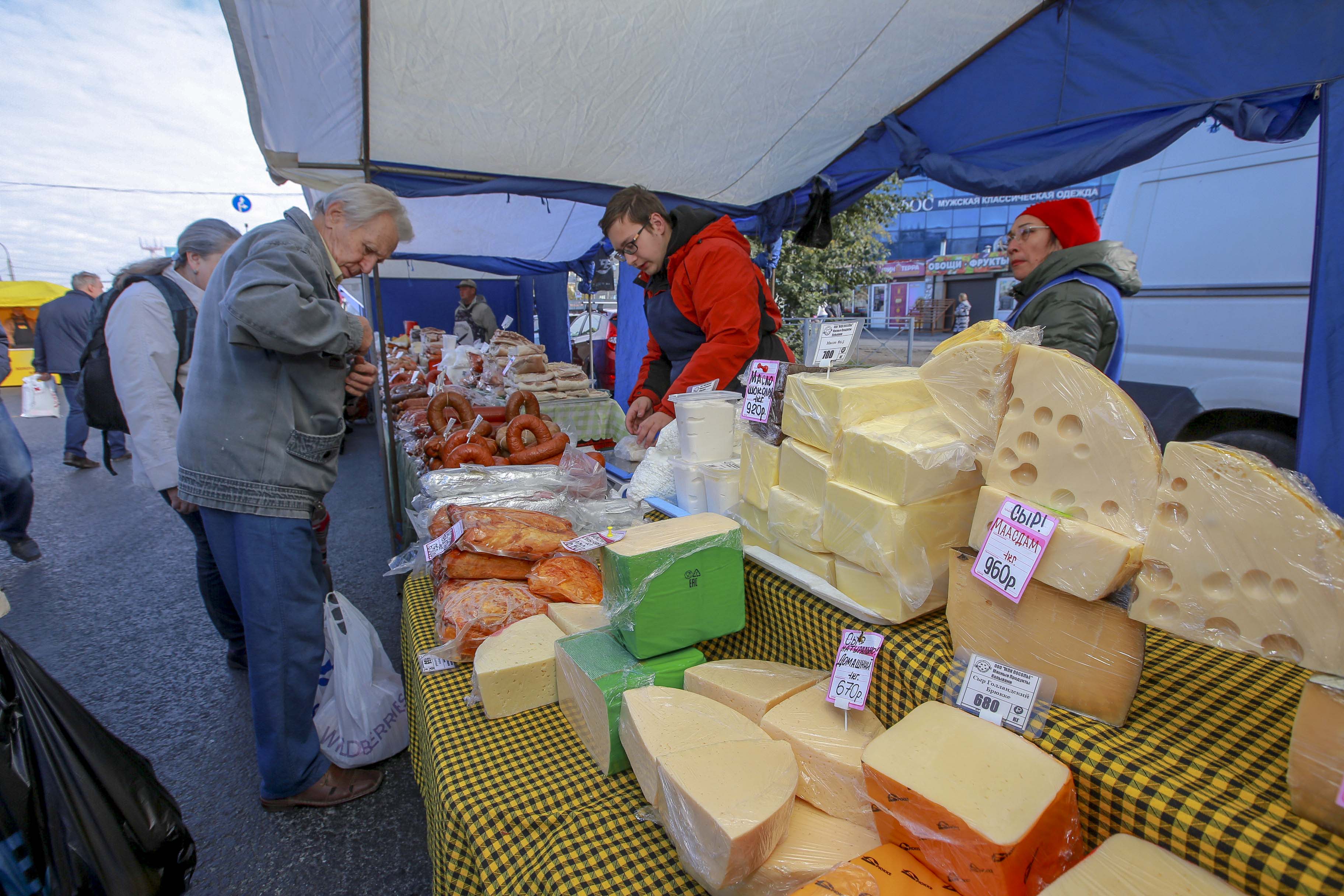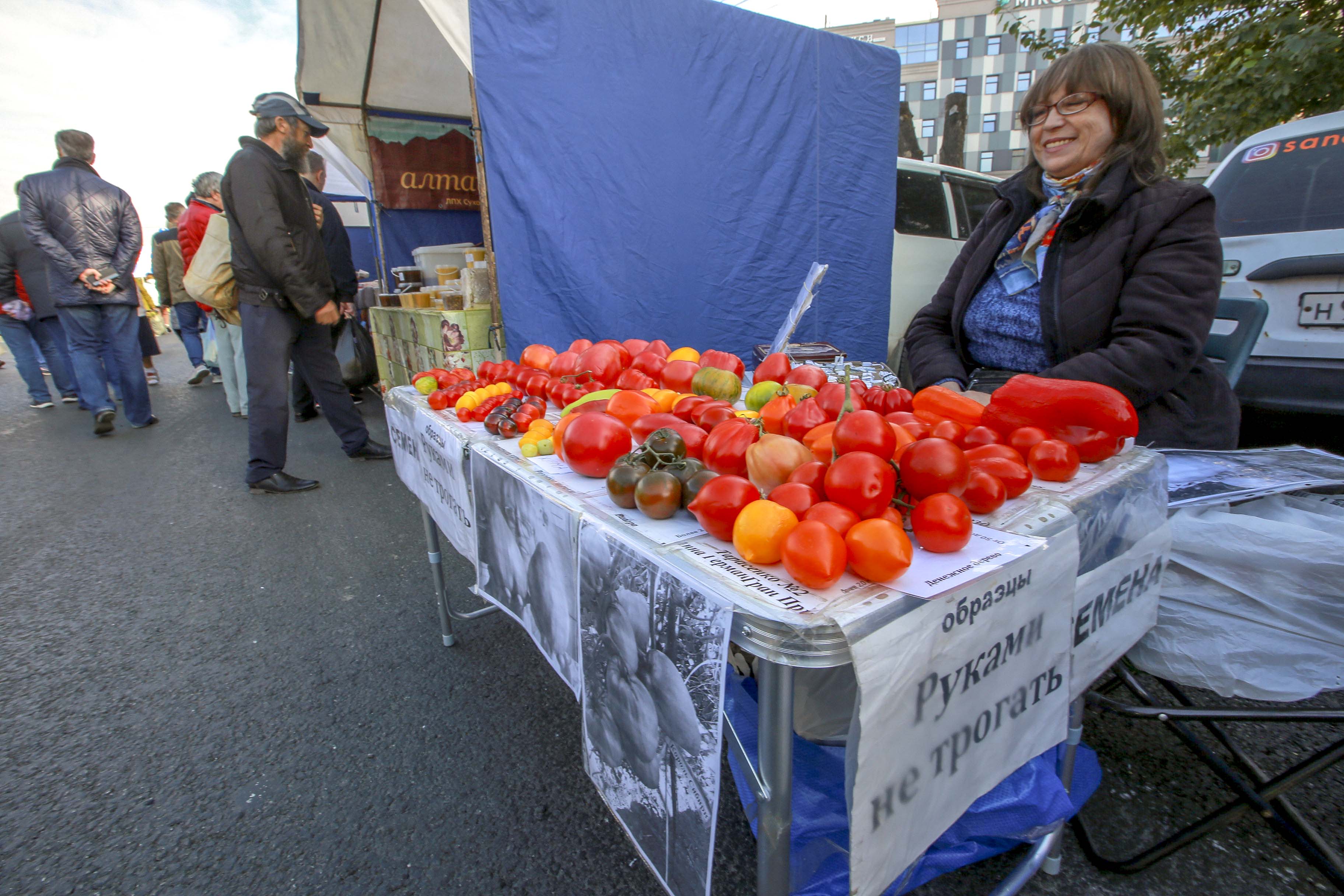 Горы сыра и колбас разных сортов, грибы, ягоды и домашние маринады. И, конечно, свежий урожай. Редкие сорта помидоров, образцы которых нельзя трогать руками, картофель и морковь по цене ниже рыночных. Покупатели здесь появились уже с утра.
