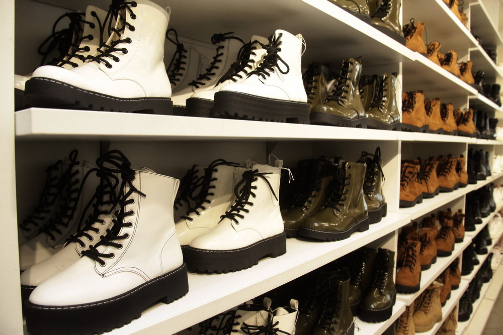 На втором месте по популярности — ботинки на шнуровке (дешёвые аналоги бренда «Мартинс»). Продавцы признаются, что чёрных моделей осталось уже очень мало, но зато всё ещё есть белые, горчичные и оливковые.