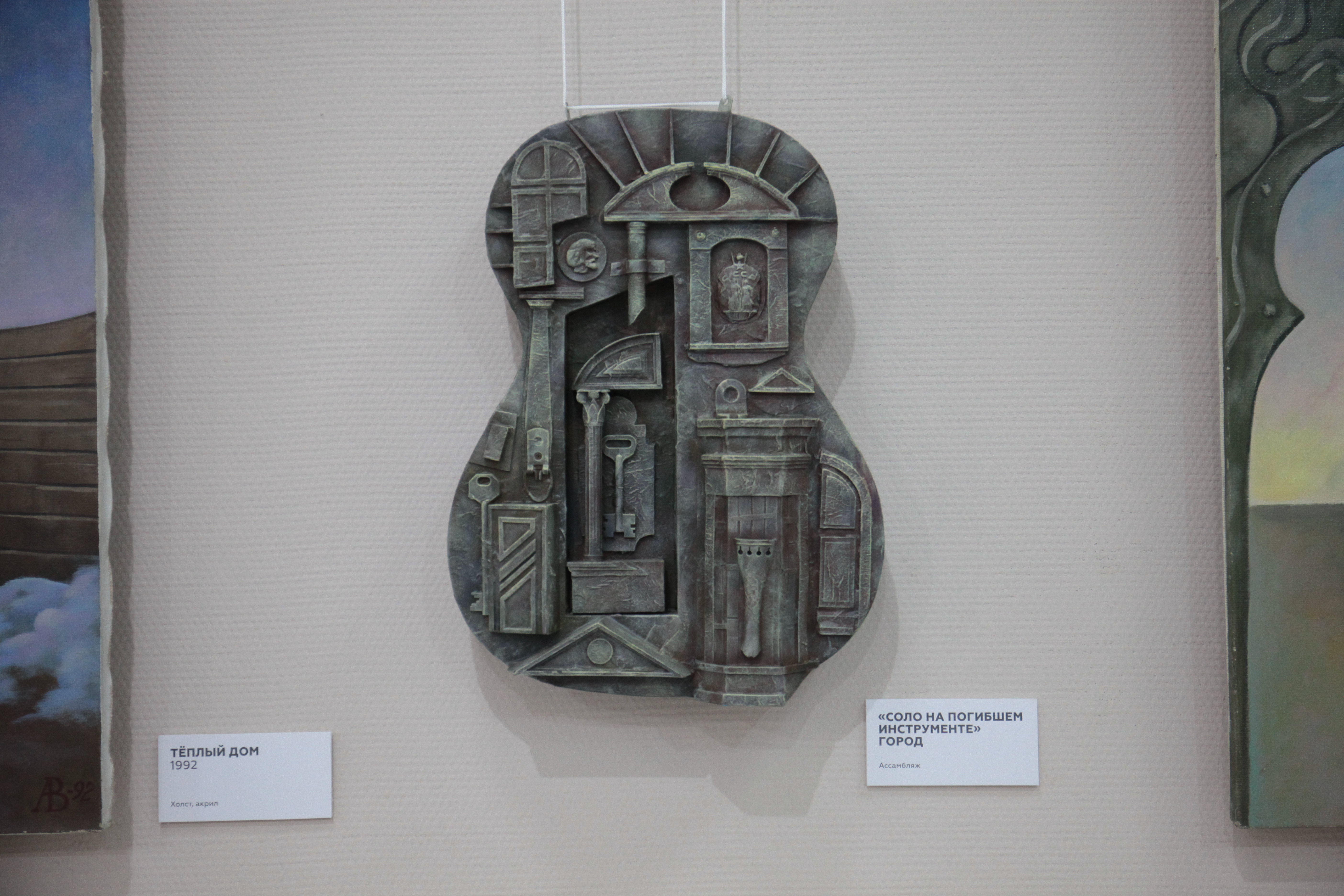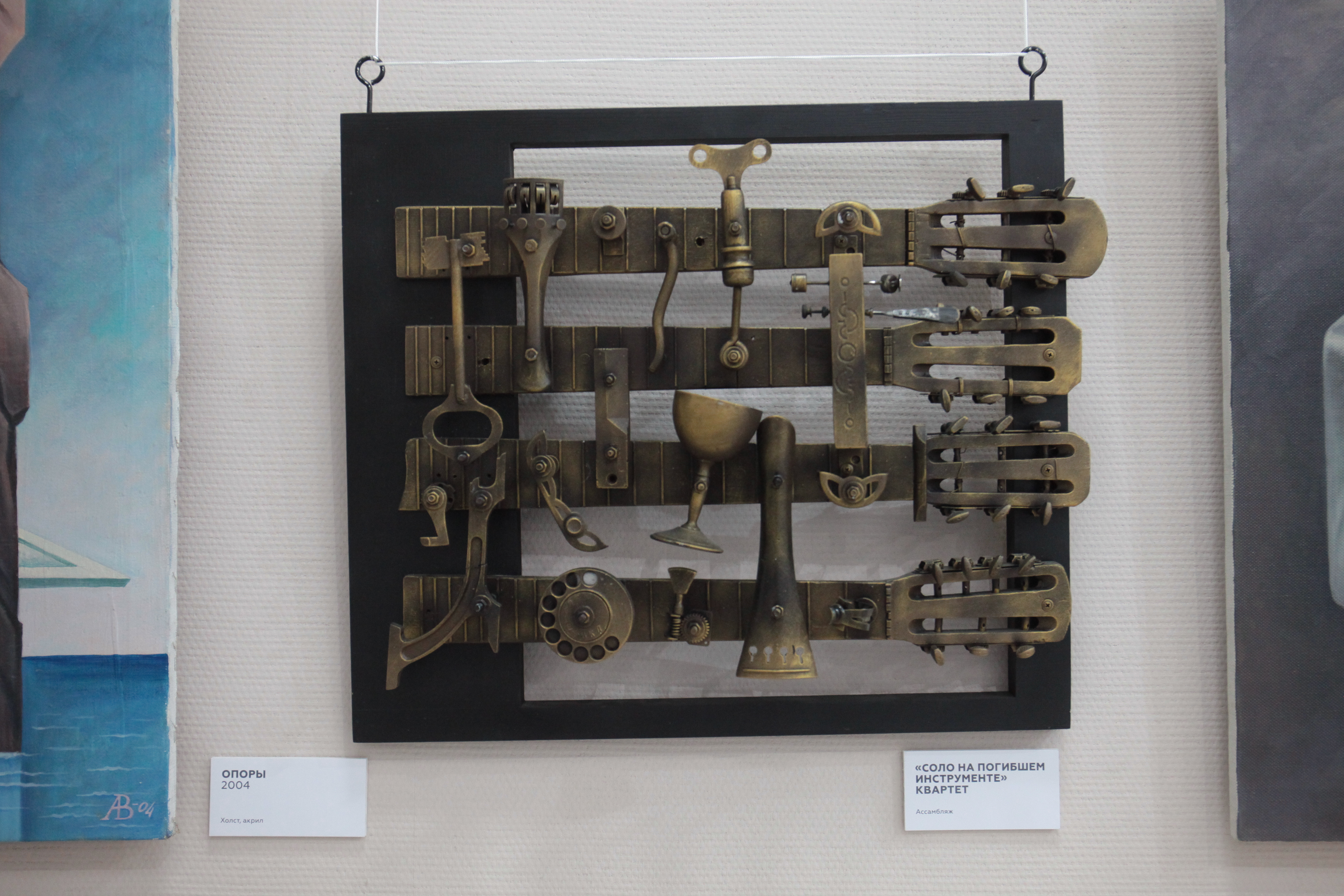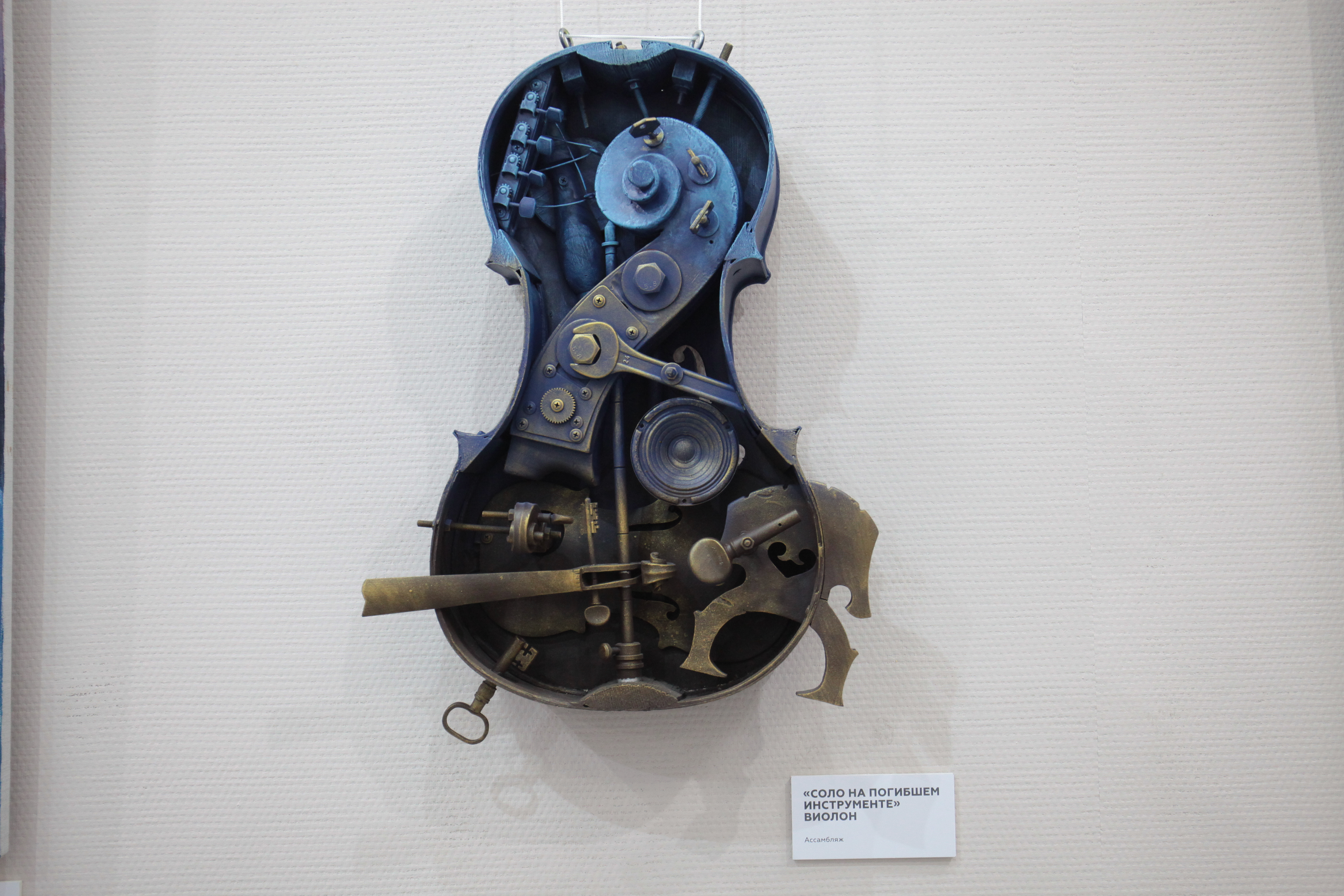 «Ассамбляж — это же производное от театра, декорационного искусства. То есть здесь всё практически объединено, но в разных техниках. Часть инструментов, которые здесь, была выброшена на помойки, часть отдана в силу того, что уже свой век отжила. Друзья, зная мои пристрастия, дарят на день рождения какие-нибудь старые, разломанные музыкальные инструменты. Вот я из них делаю такие композиции», — рассказал художник Владимир Авдеев.