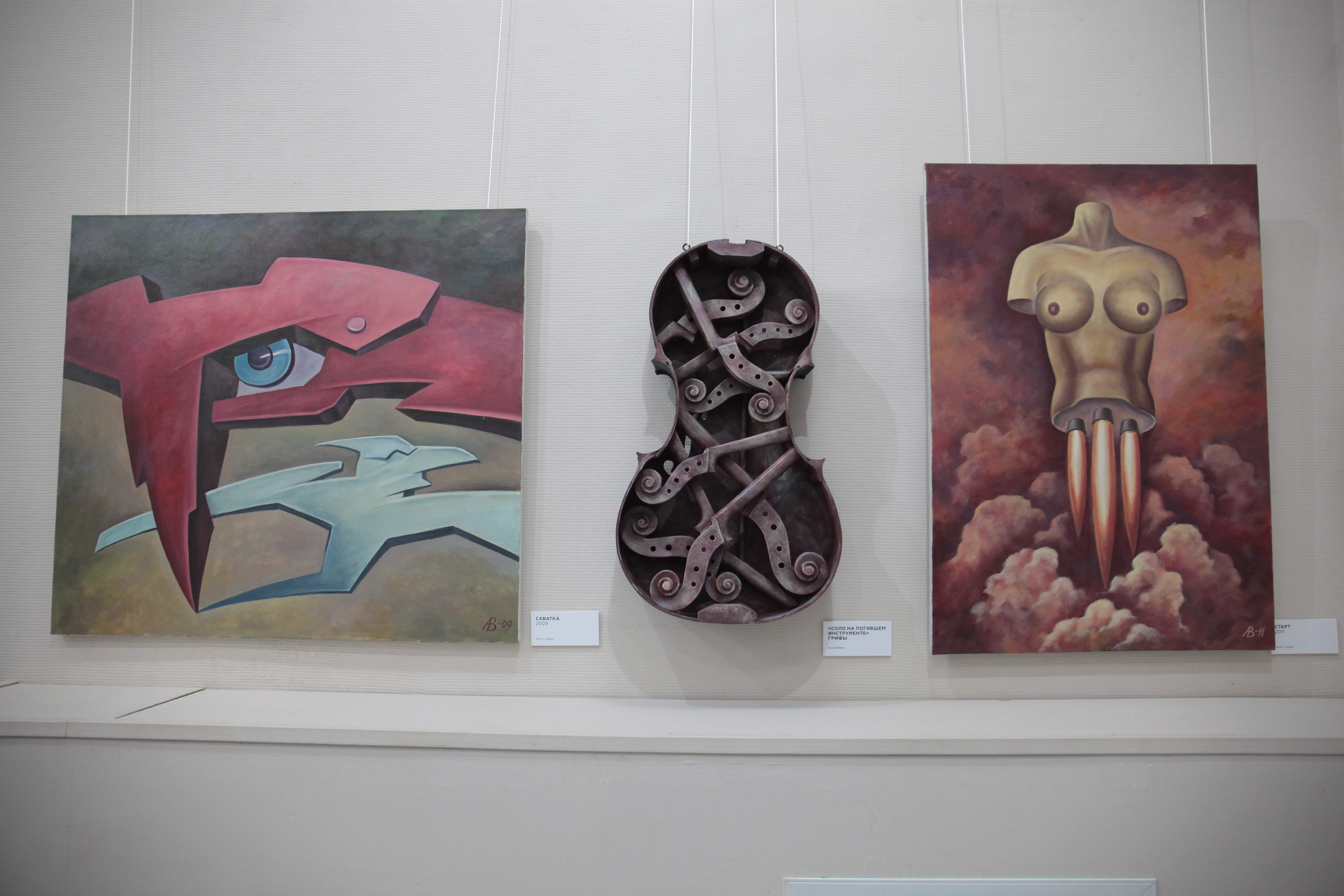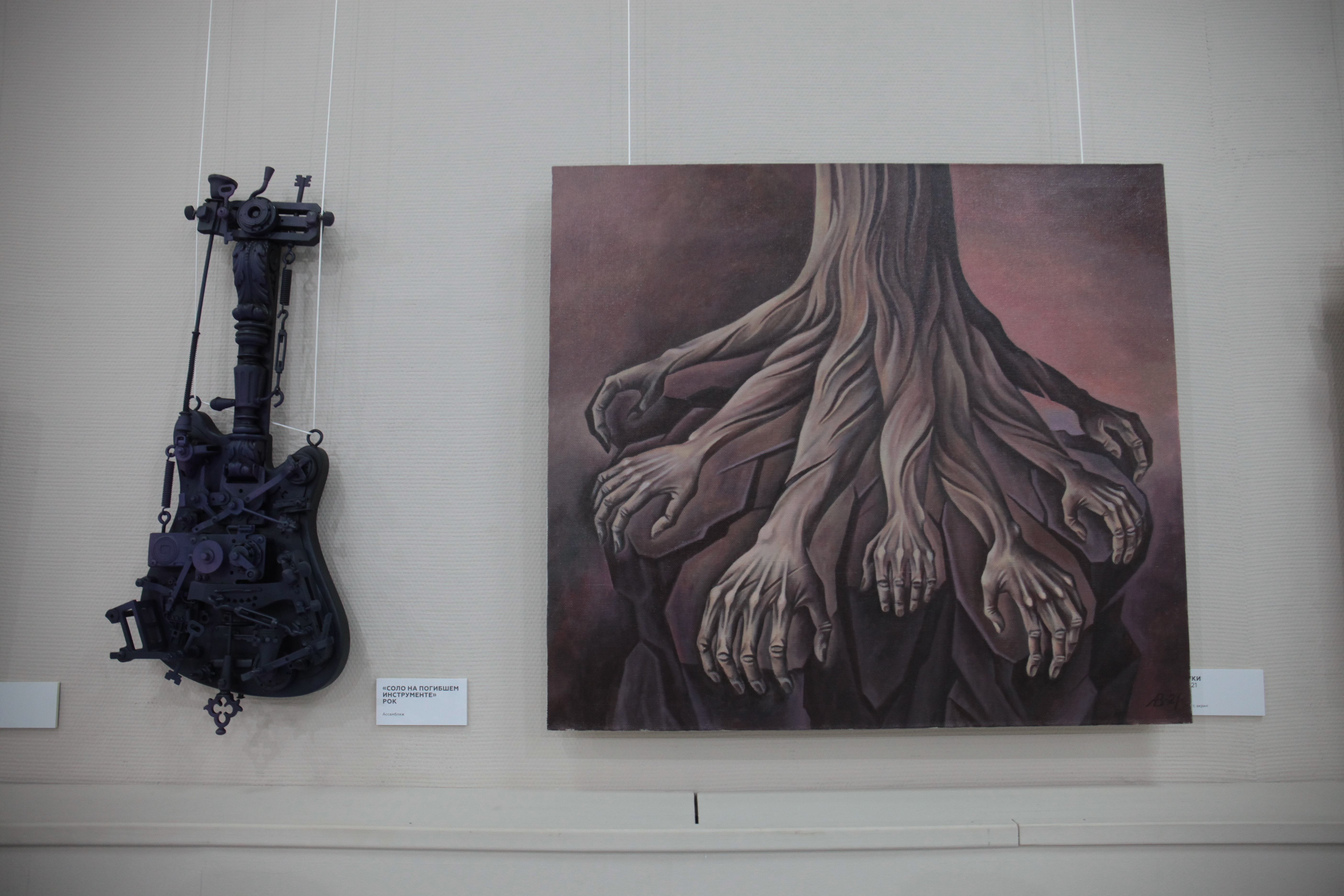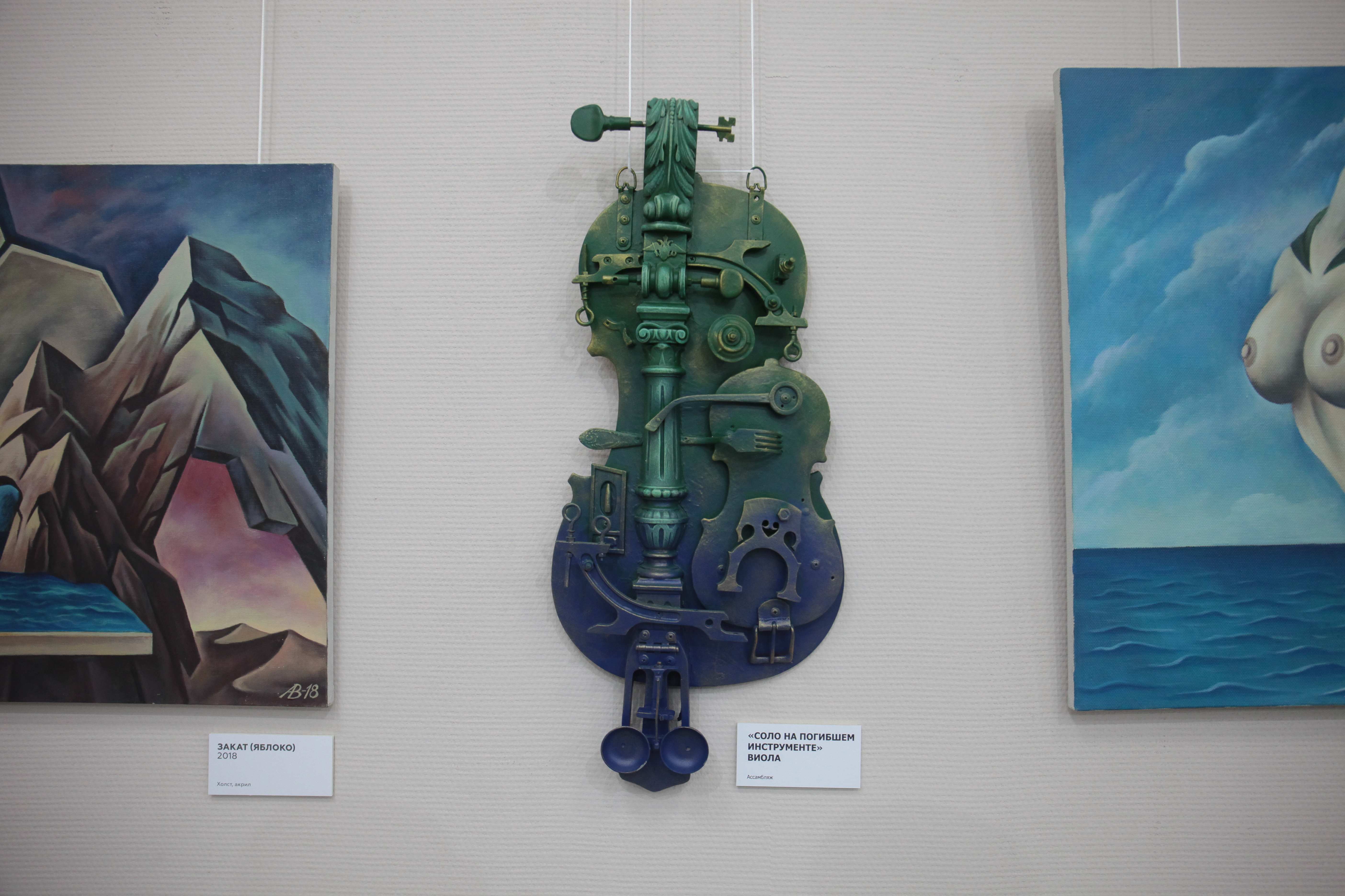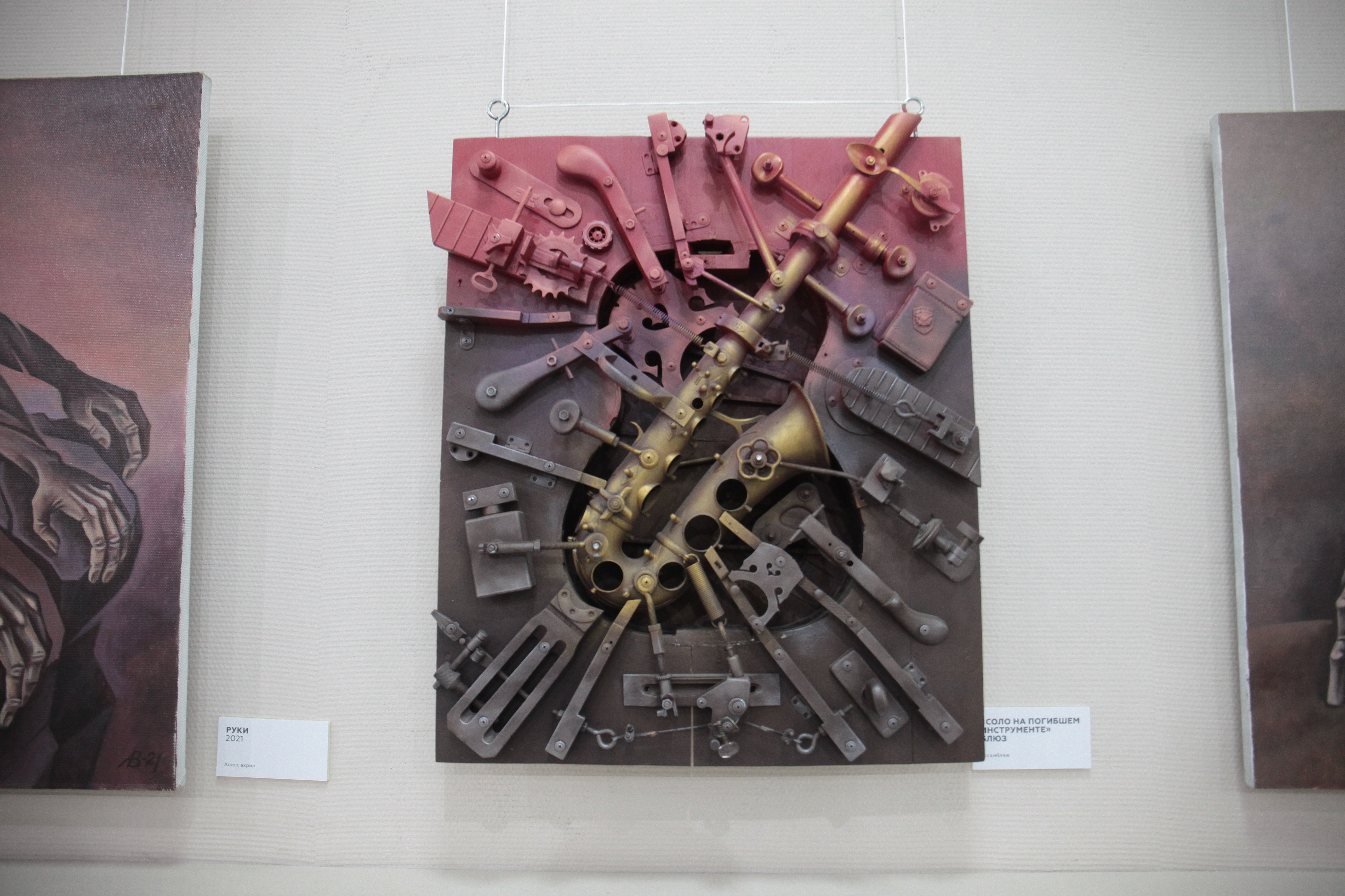 «Ассамбляж — это же производное от театра, декорационного искусства. То есть здесь всё практически объединено, но в разных техниках. Часть инструментов, которые здесь, была выброшена на помойки, часть отдана в силу того, что уже свой век отжила. Друзья, зная мои пристрастия, дарят на день рождения какие-нибудь старые, разломанные музыкальные инструменты. Вот я из них делаю такие композиции», — рассказал художник Владимир Авдеев.