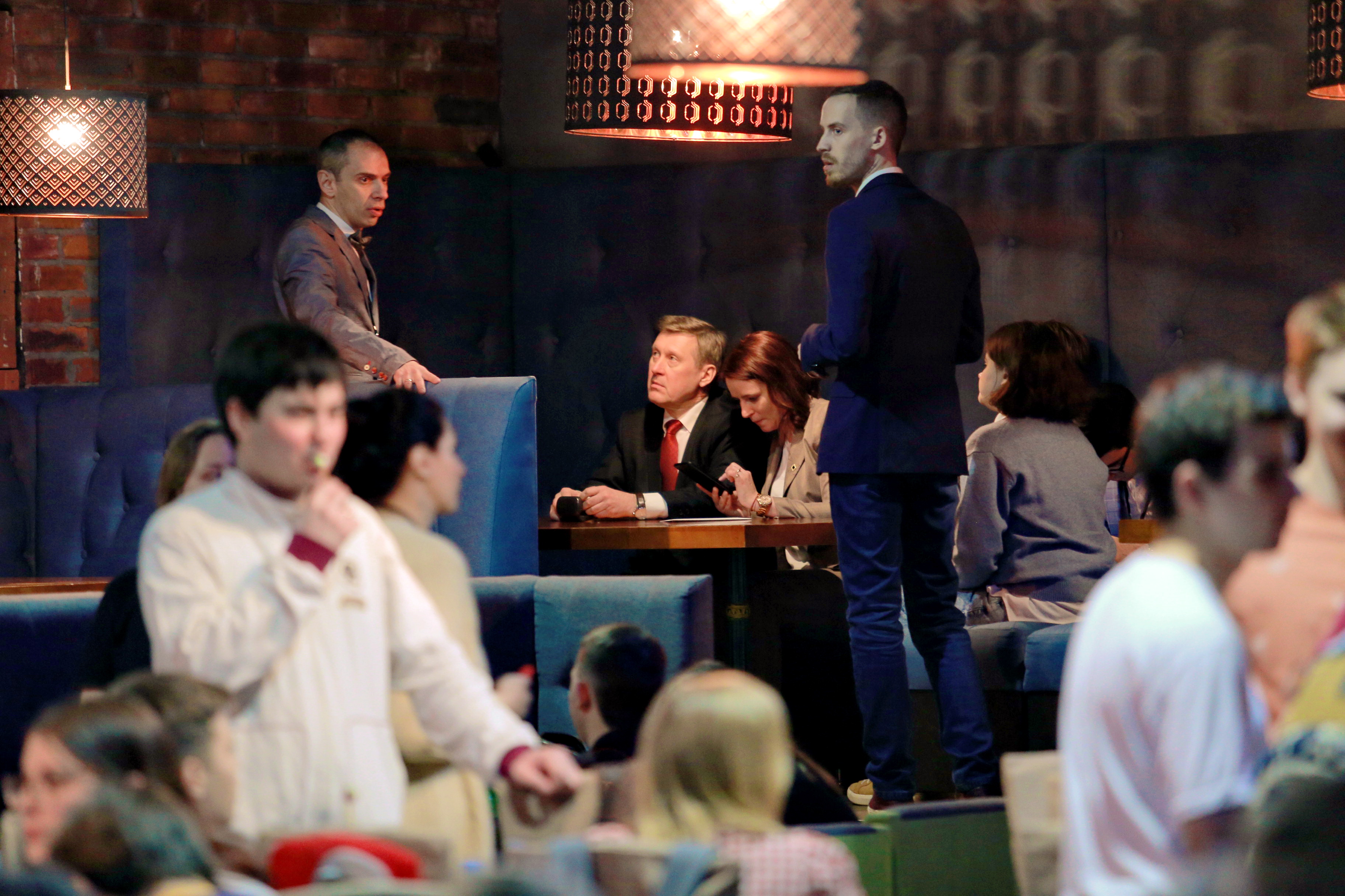 Первый вопрос знатокам задаёт мэр Новосибирска Анатолий Локоть. Почётные гости, среди которых члены элитарного клуба «Что? Где? Когда?», не оплошали. Ответили правильно, в минуту уложились. Некоторые не первый раз приезжают в Новосибирск.