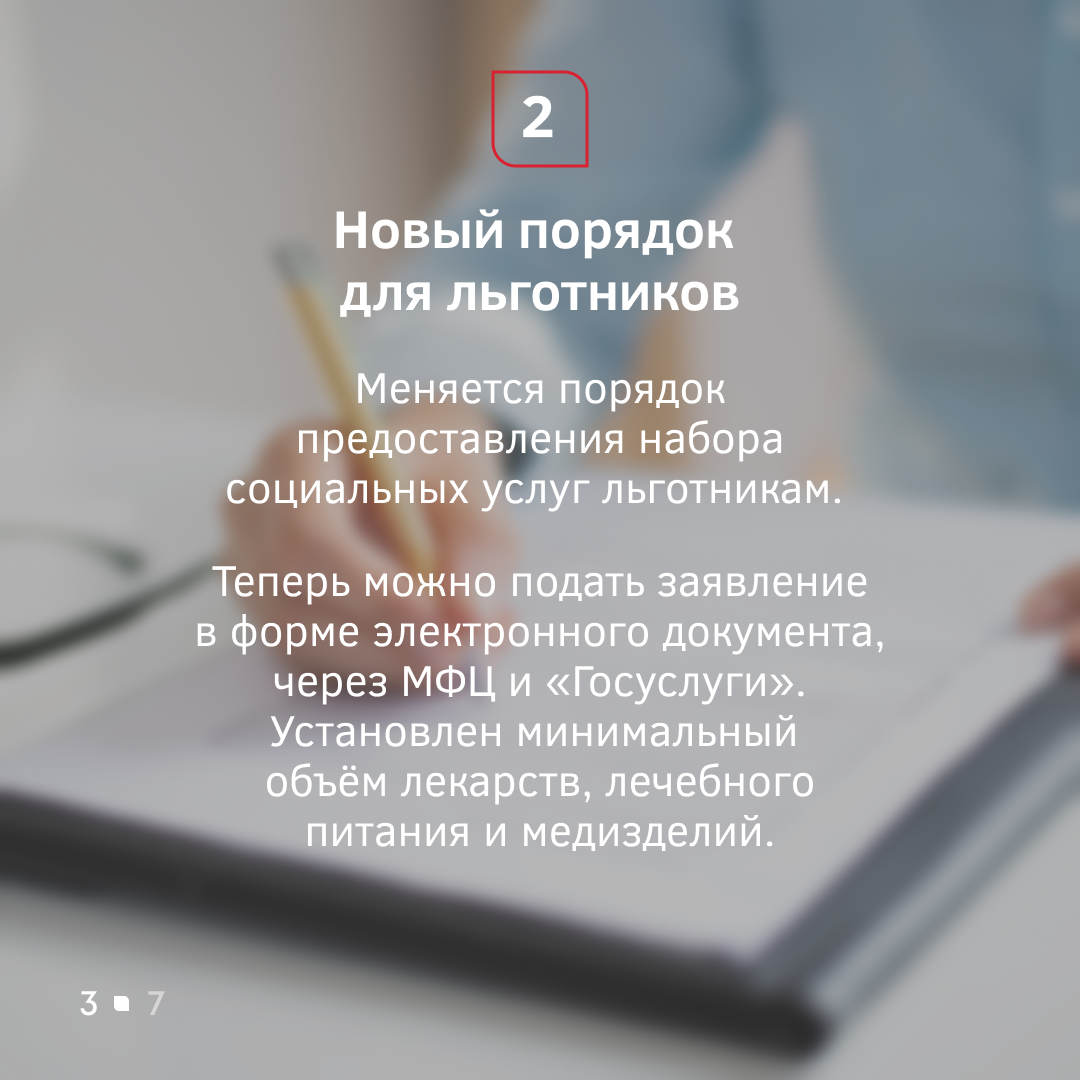 В сентябре льготники смогут получать социальные услуги в новом порядке. Оформить заявление можно через портал госуслуг и МФЦ. Кроме этого, ветераны боевых действий, жители блокадного Ленинграда и многие другие граждане смогут получать бесплатные медикаменты и лечебное питание.