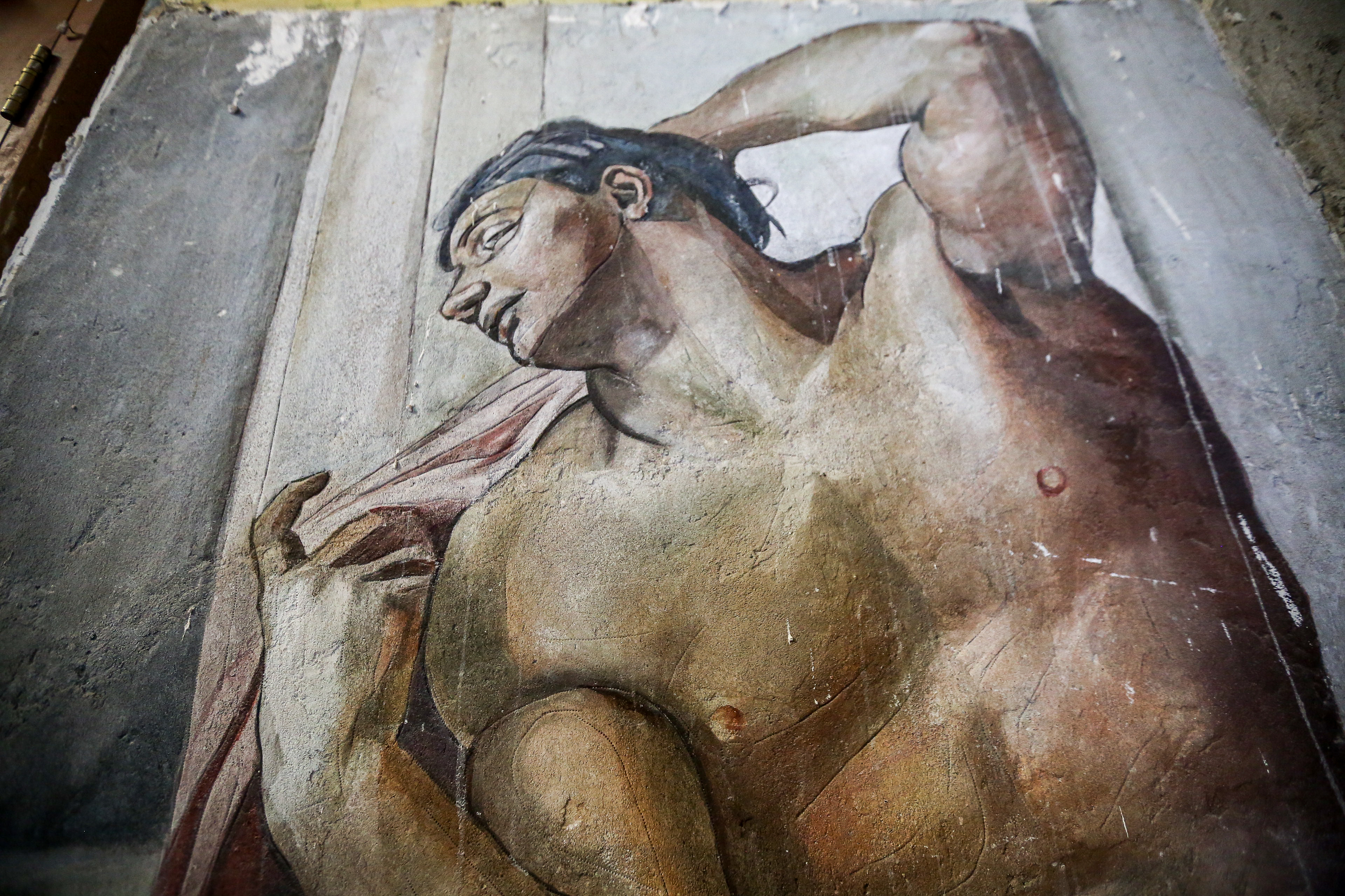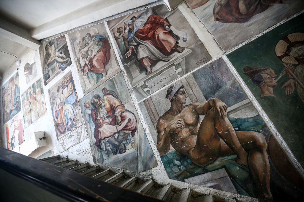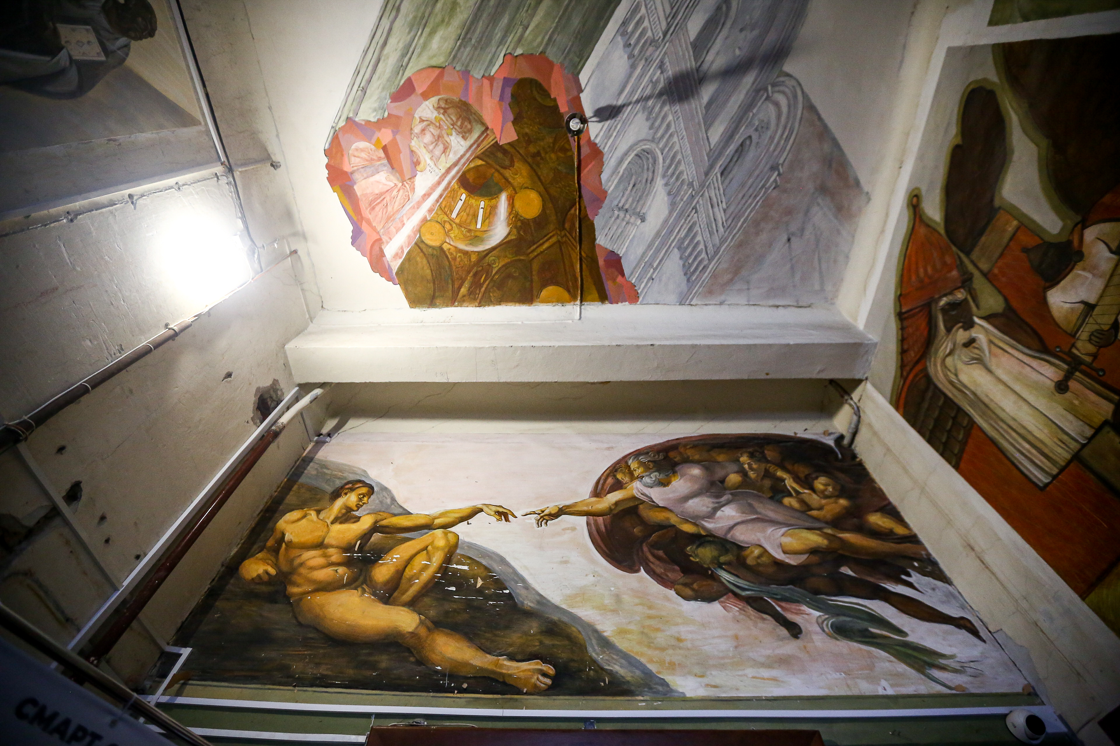 В экспозиции есть как учебные копии известных шедевров, так и оригинальные авторские работы. Пожалуй, самой впечатляющей стал список фрески Микеланджело Буонарроти «Сотворение Адама». Она находится на пятом этаже южной лестницы, под самым потолком. Если повезёт, то полотно можно увидеть с улицы.