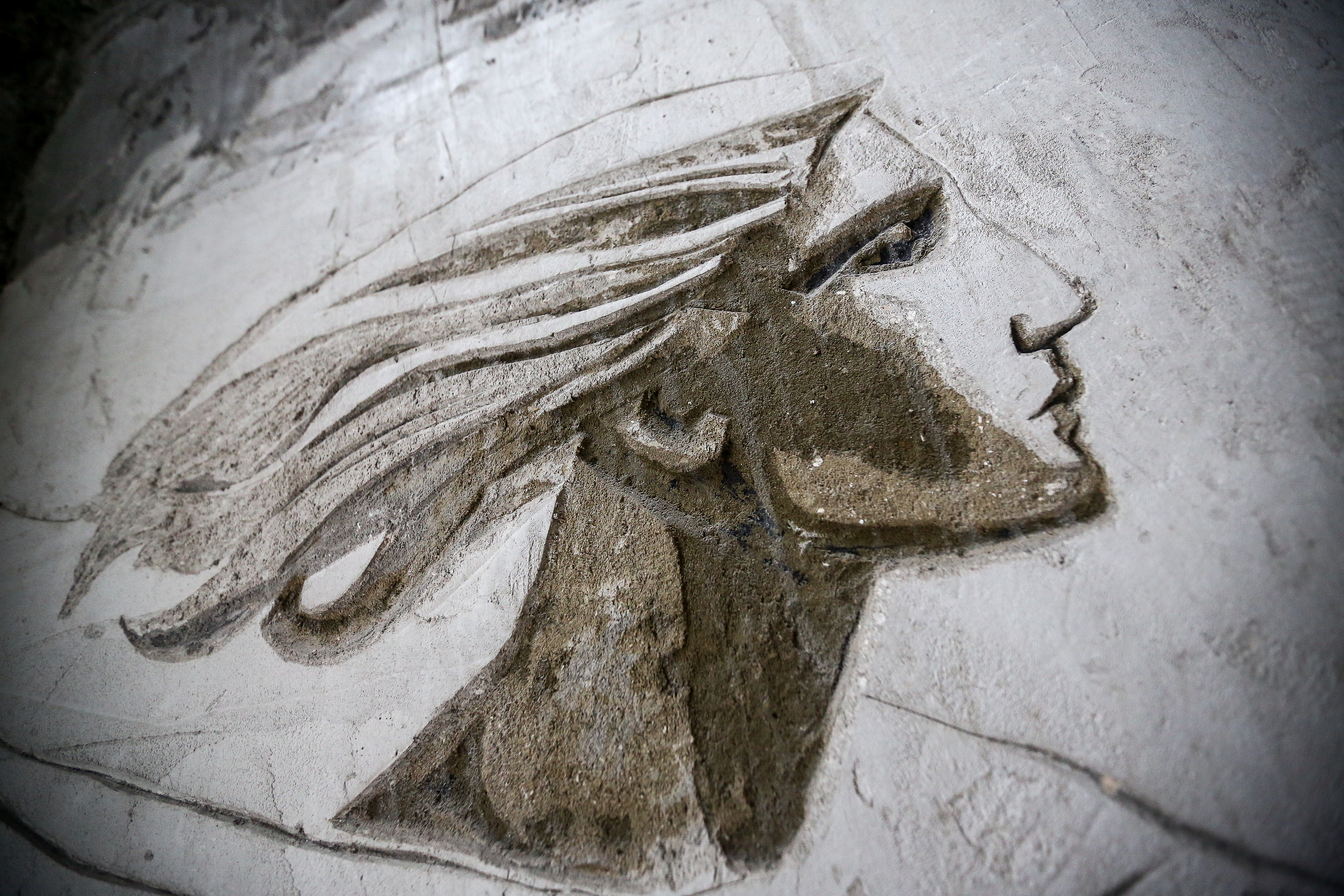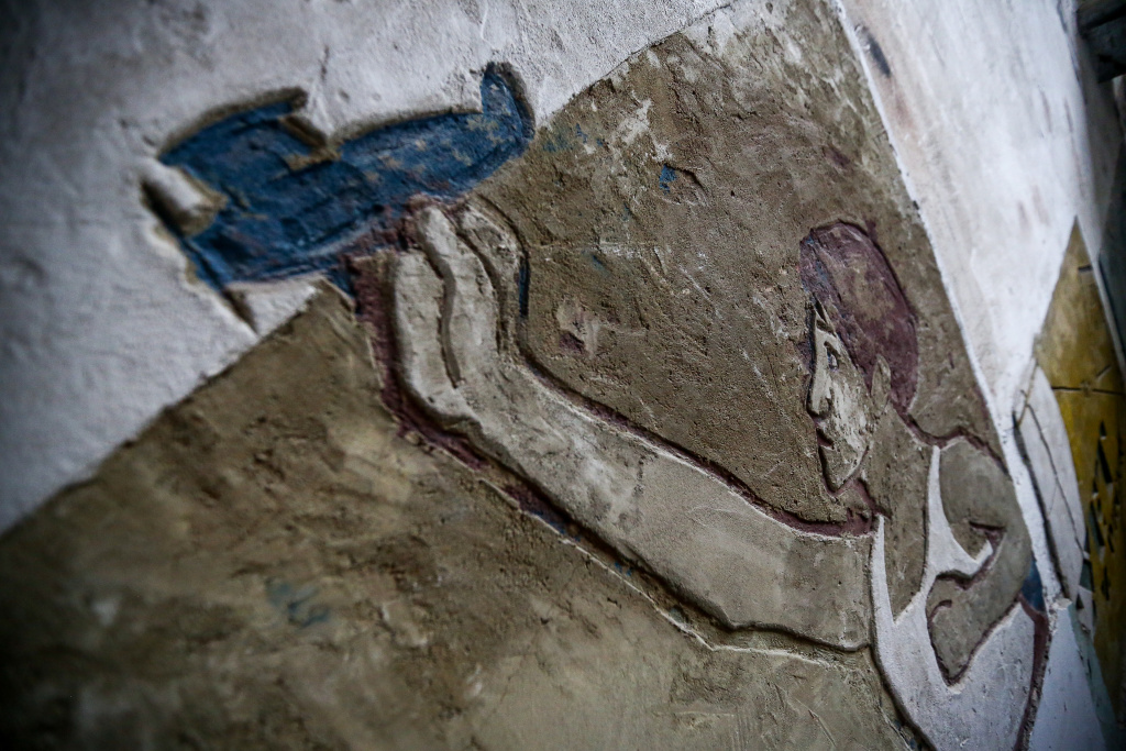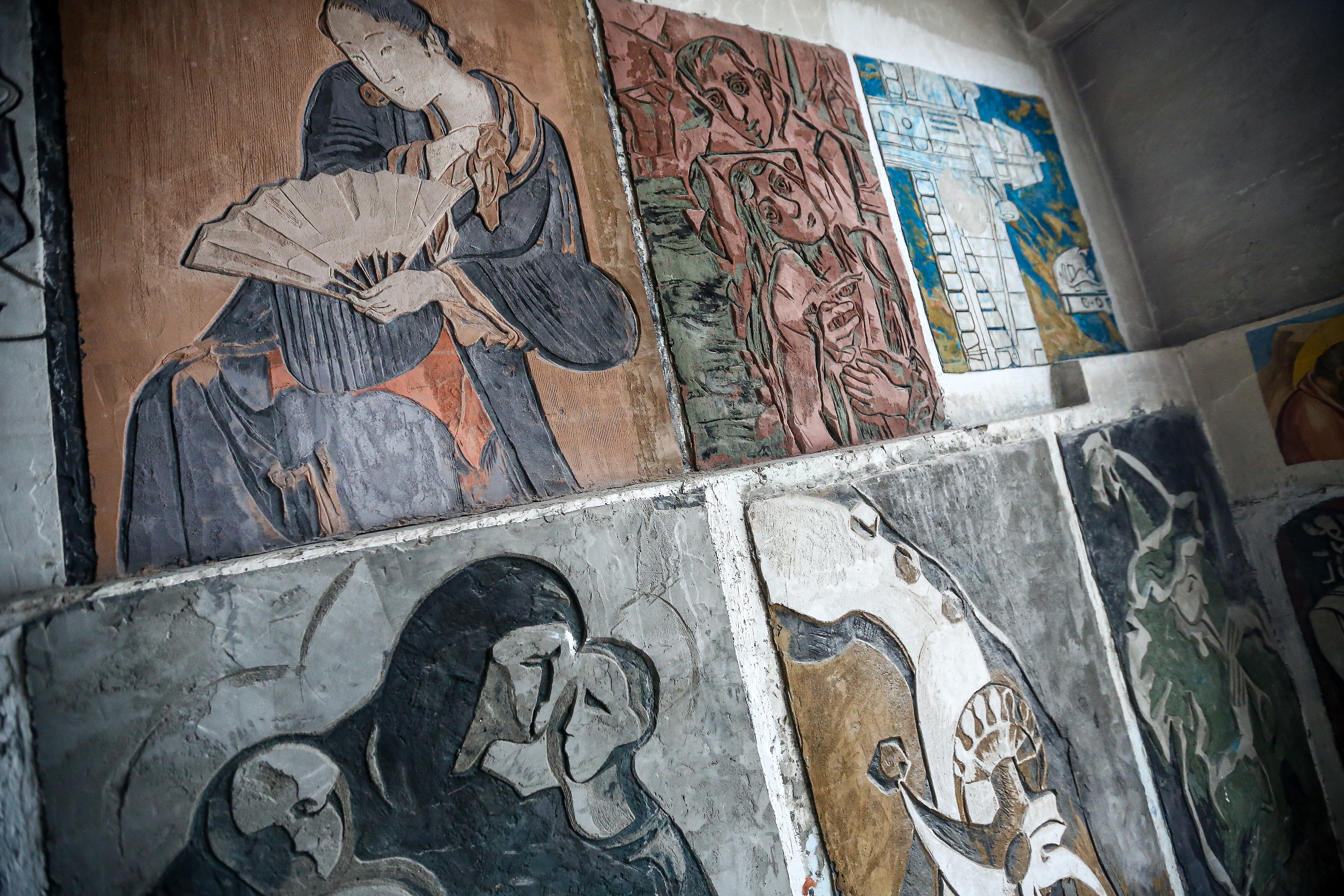 Довольно много экспонатов выполнено в технике сграффито. Это что-то среднее между росписью и рельефом. Автор сначала наносит на стену несколько слоёв грунта, а затем процарапывает изображение. Эта техника появилась в средние века в Италии. Второе рождение пережила на рубеже 19-20 веков, в эпоху ар-нуво. В СССР пользовалась популярность для декора.