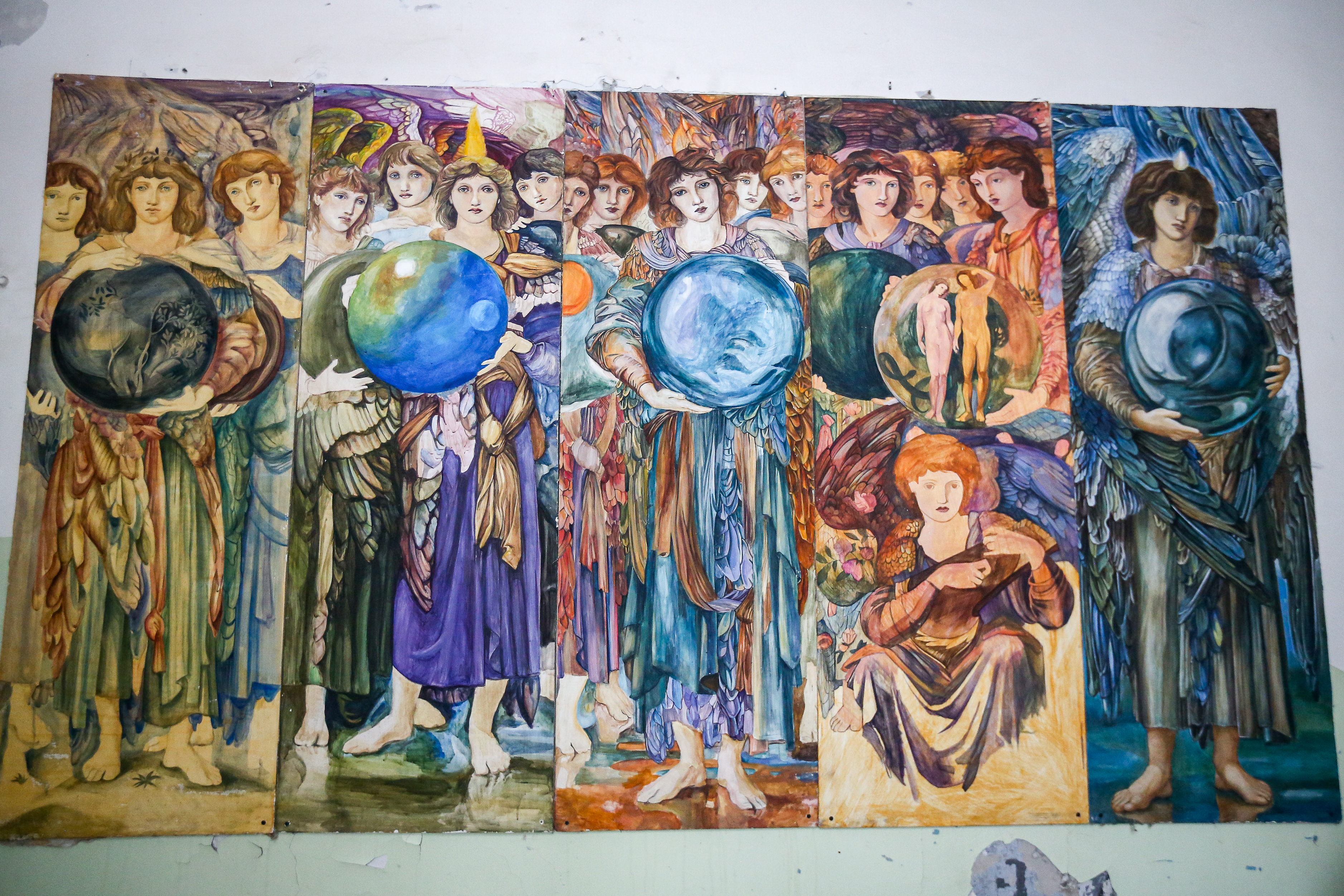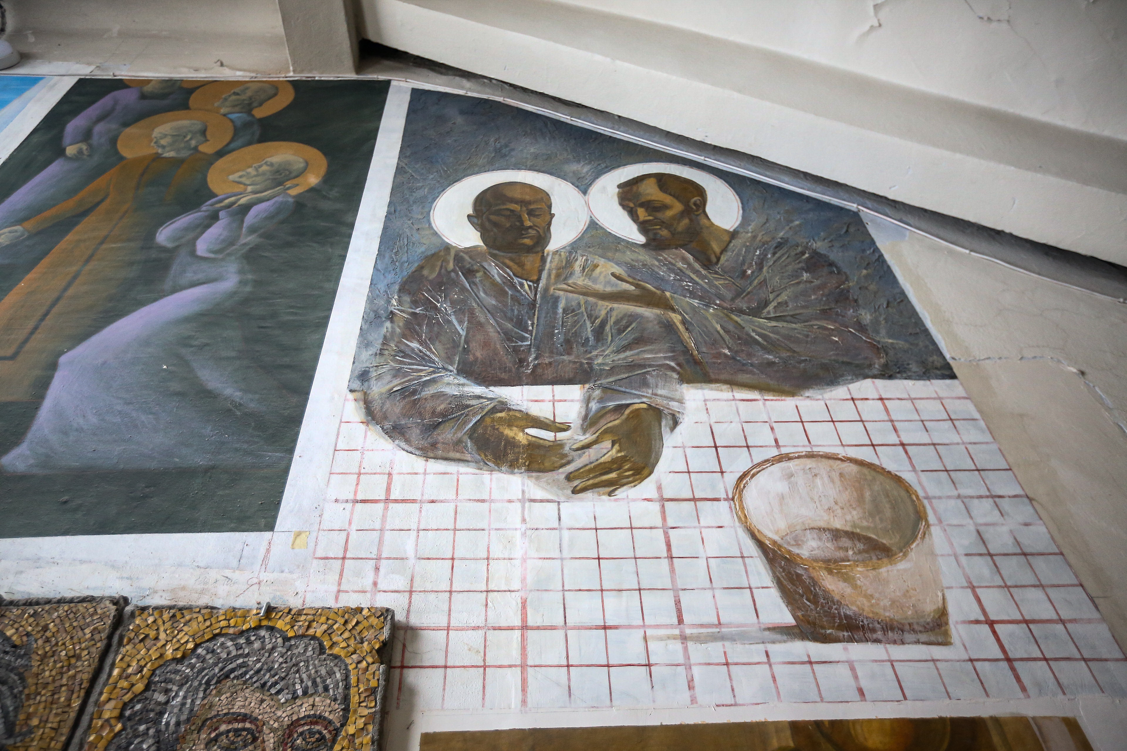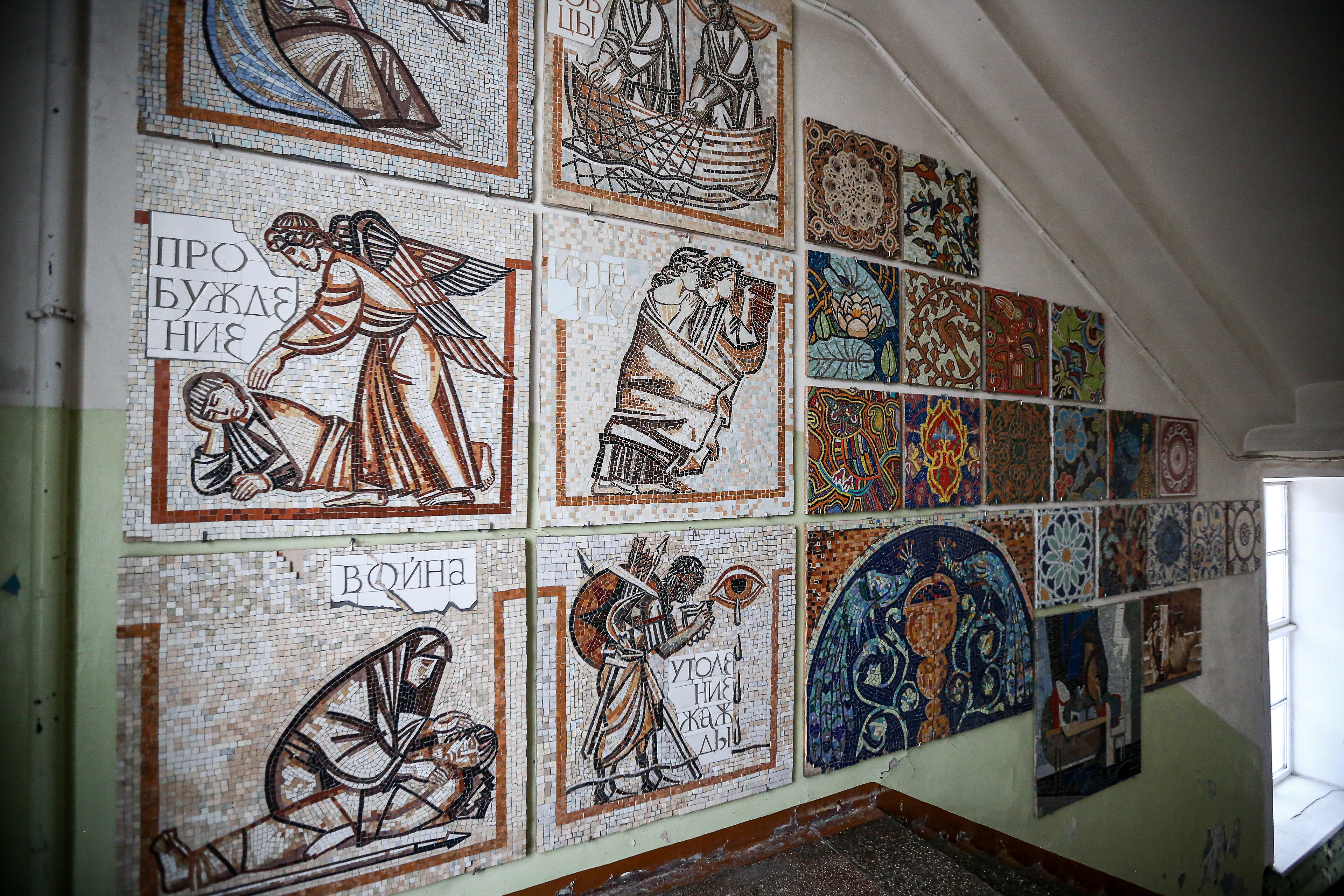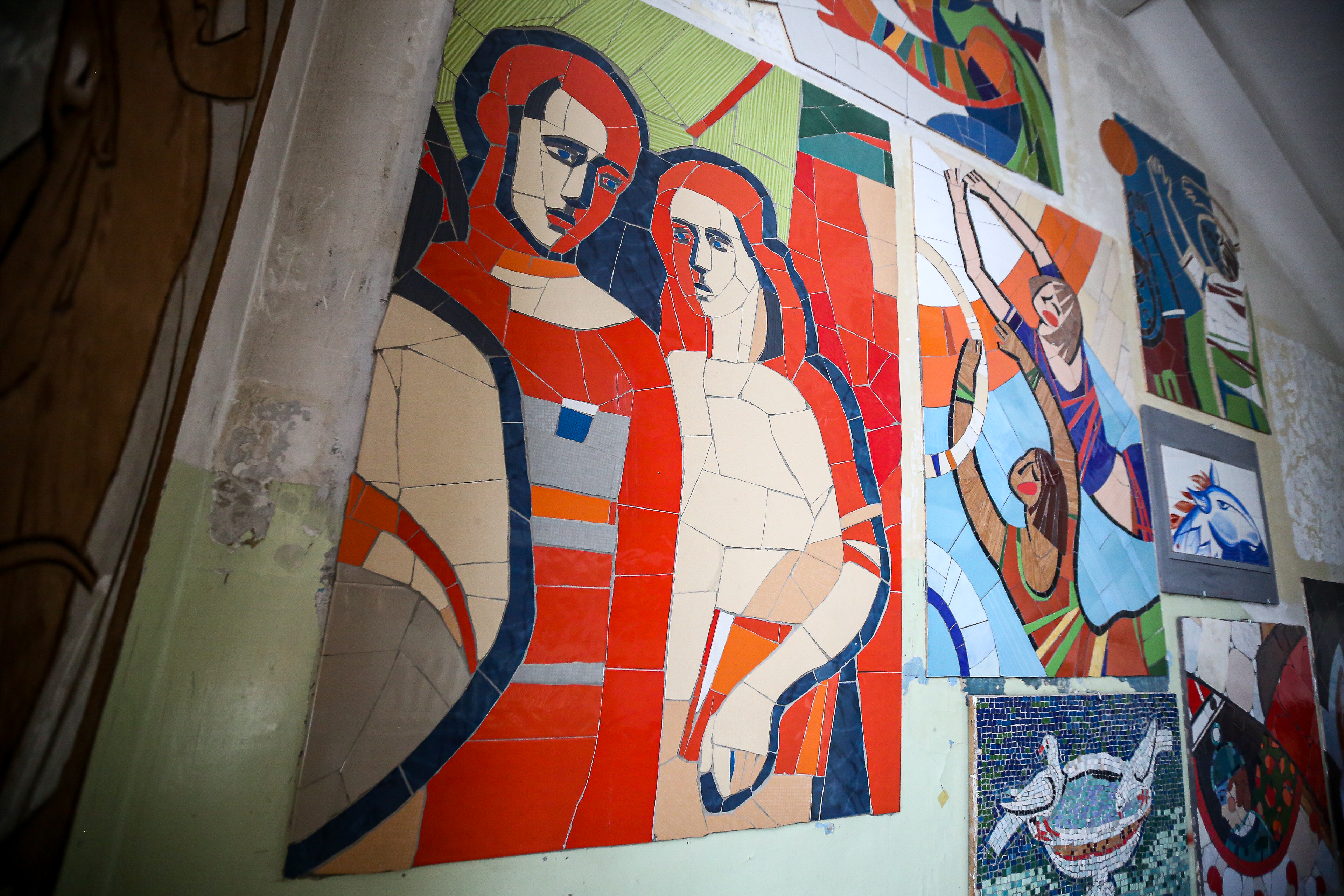 Уже много лет студенты направления «Монументальное искусство» выполняют на стенах боковых лестниц свои дипломные работы. Там можно увидеть самые разные техники и сюжеты — от классических античных до современного арта. Это такой тренировочный полигон для художников-монументалистов. Не все полотна на момент нашего визита были завершены авторами.