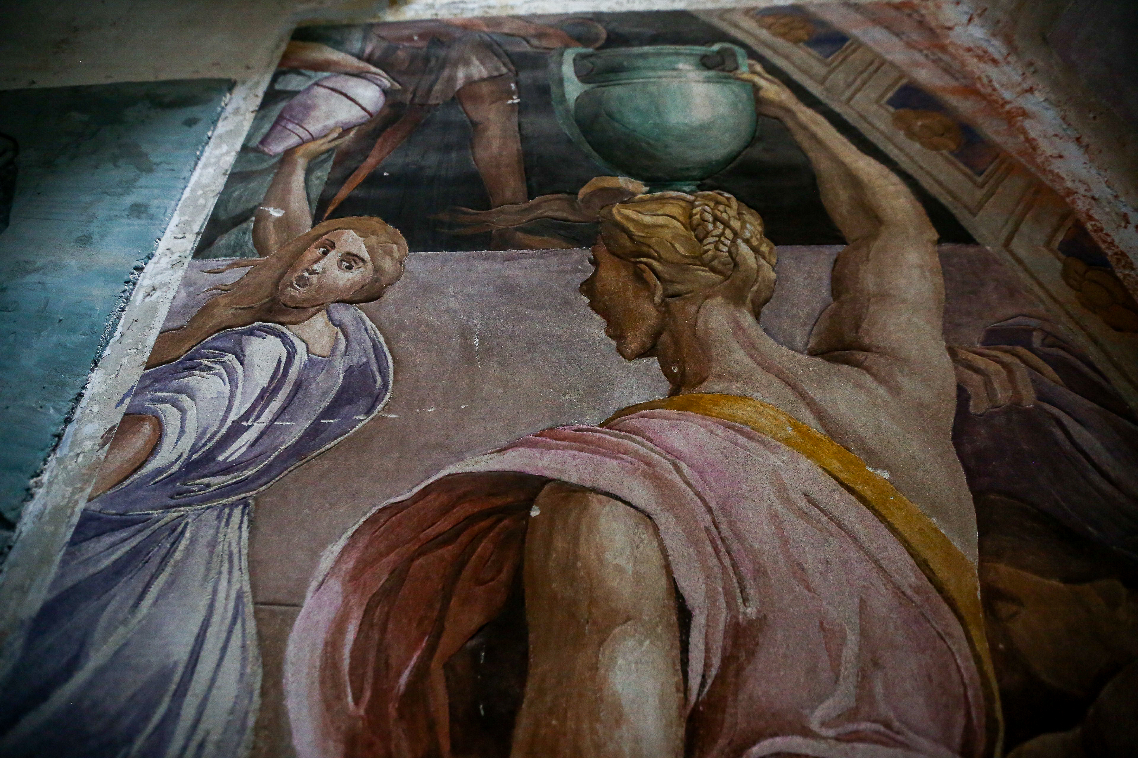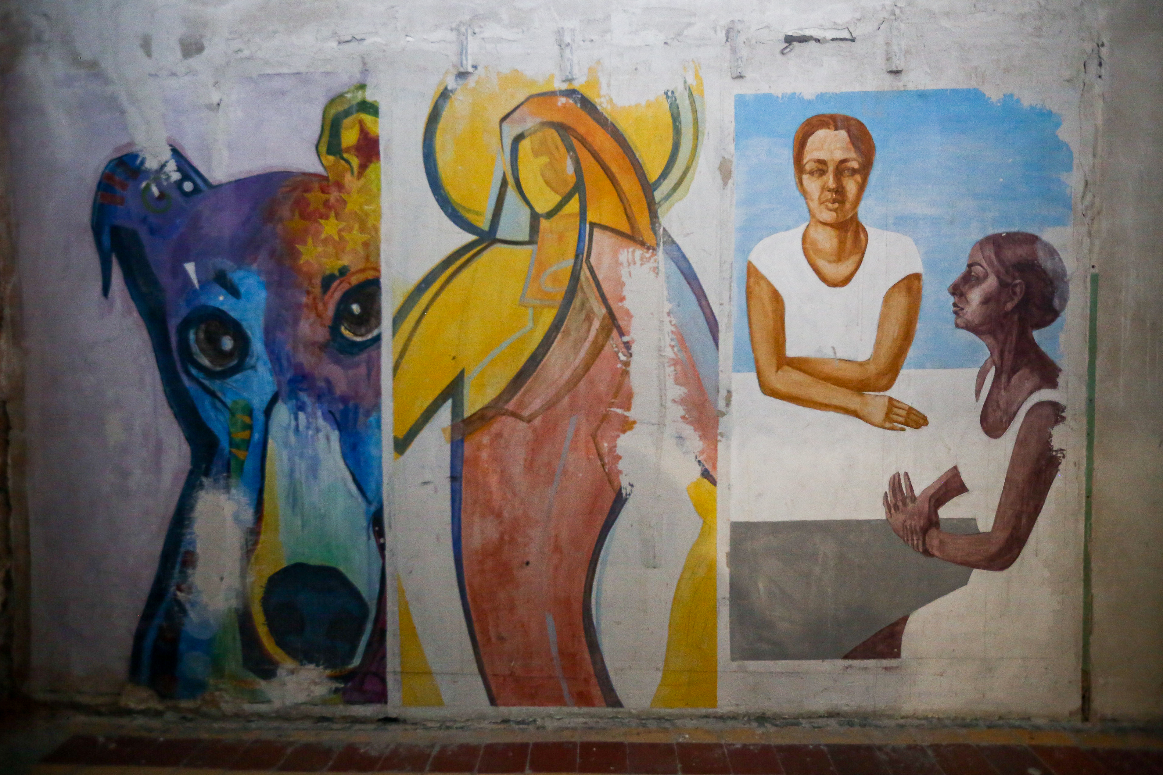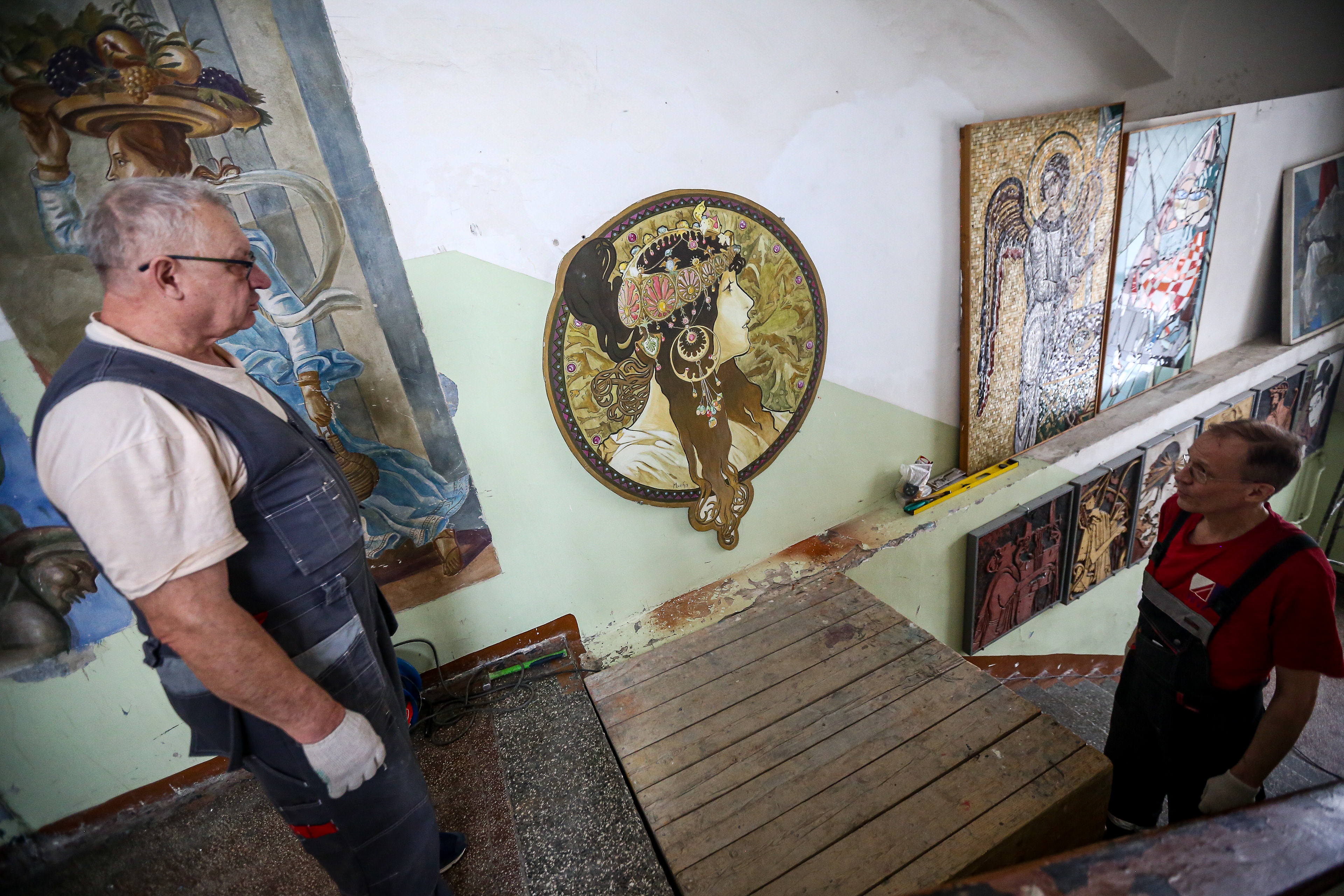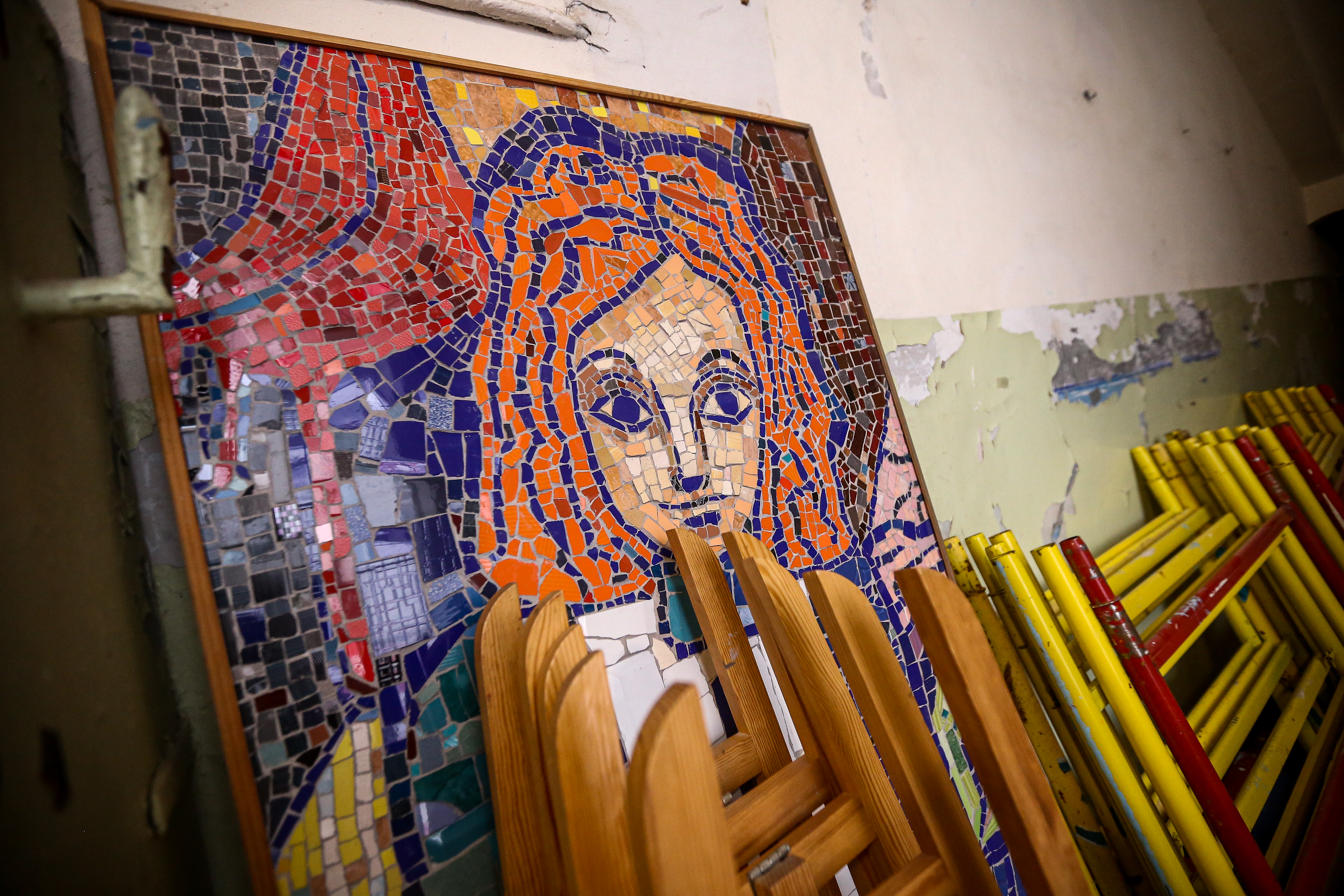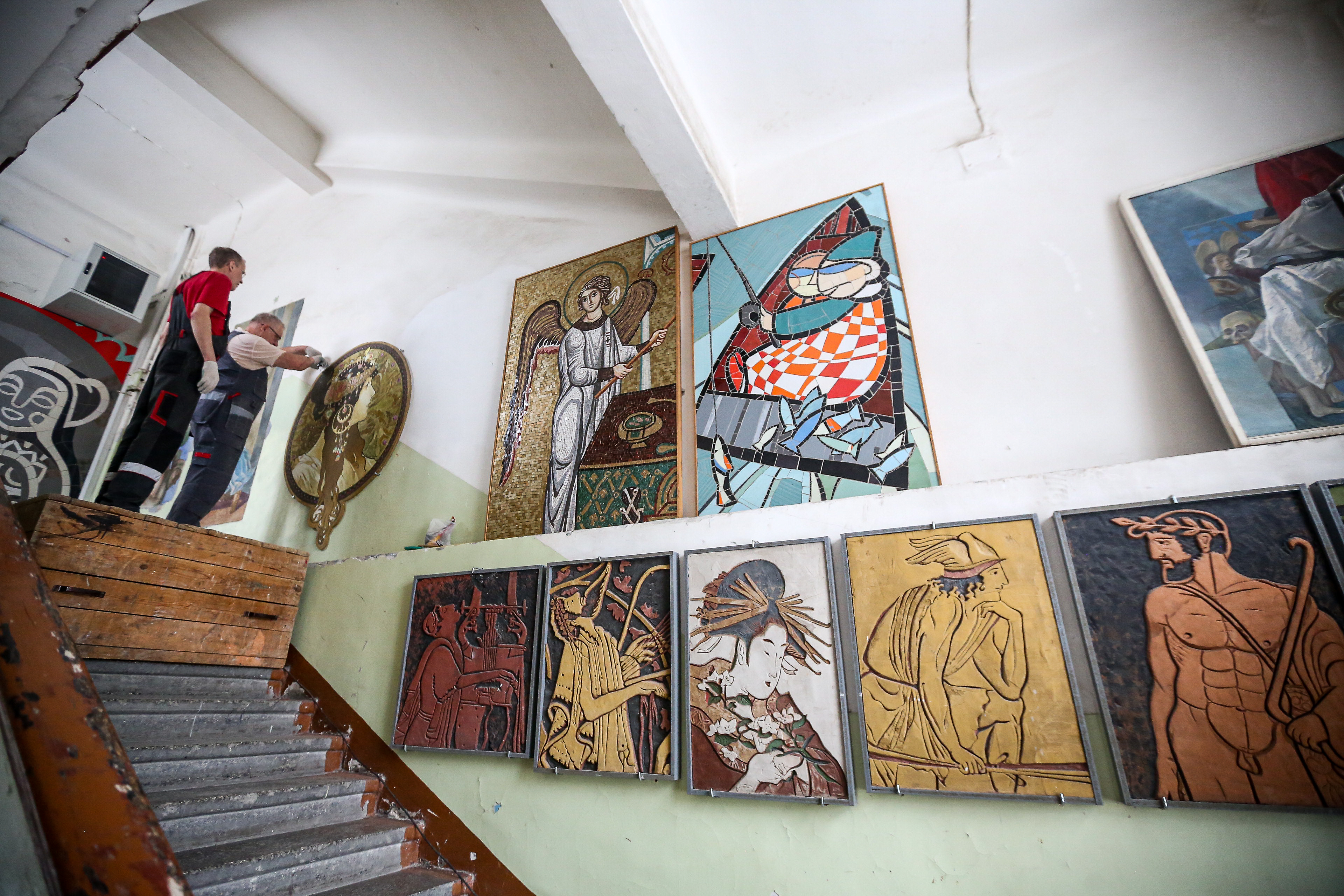 Уже много лет студенты направления «Монументальное искусство» выполняют на стенах боковых лестниц свои дипломные работы. Там можно увидеть самые разные техники и сюжеты — от классических античных до современного арта. Это такой тренировочный полигон для художников-монументалистов. Не все полотна на момент нашего визита были завершены авторами.