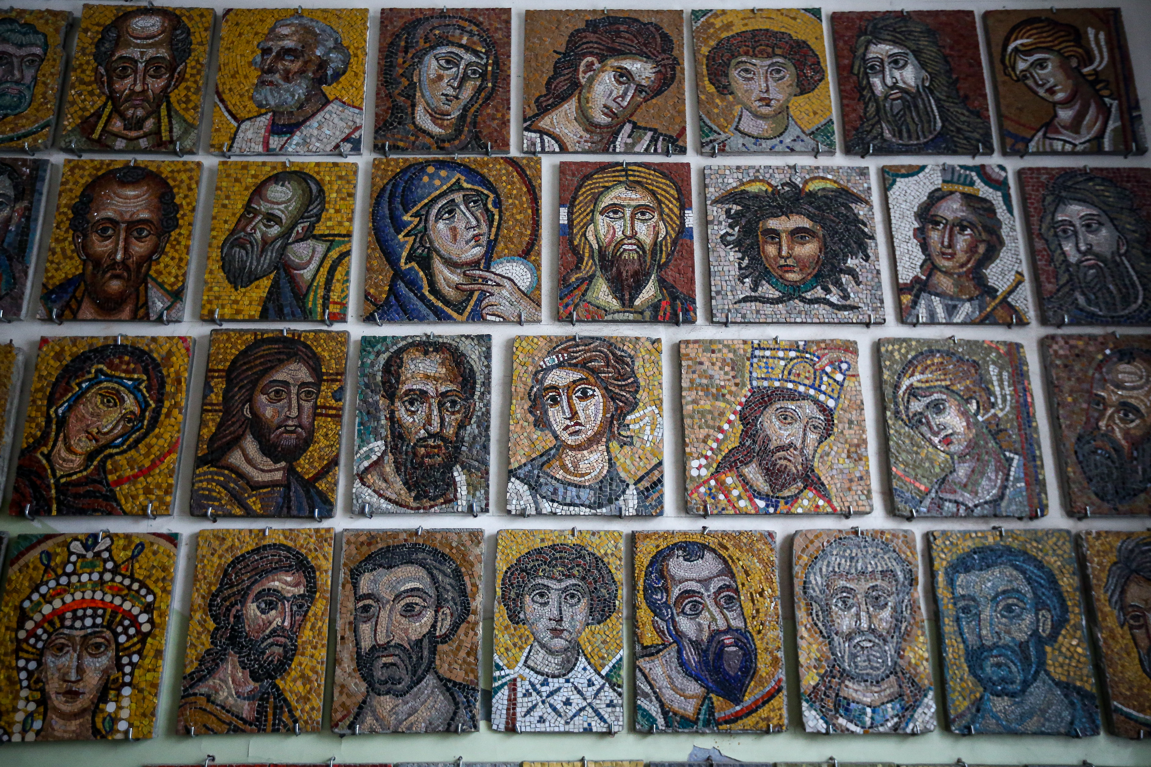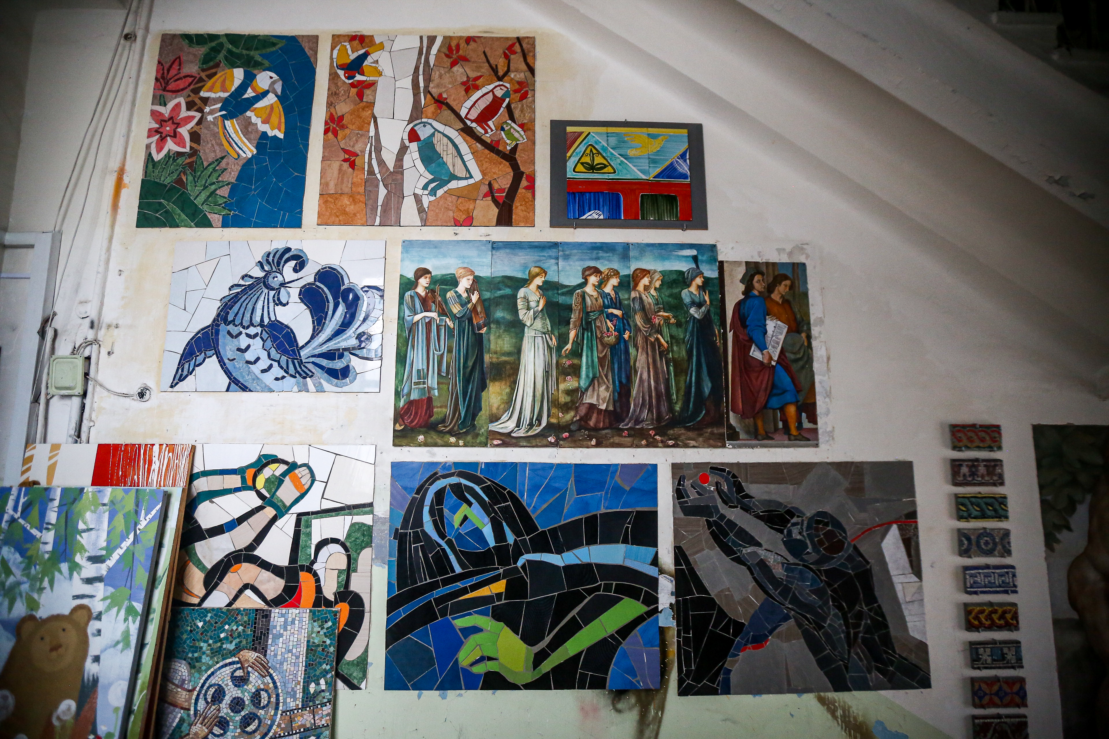 Много среди работ византийских мозаик. Художники собирают из кусочков разноцветной смальты как копии известных полотен, так и авторские сюжеты — натюрморты, пейзажи, портреты. Здесь же можно увидеть и произведения из более крупных элементов — кусочков керамической плитки и кермогранита.