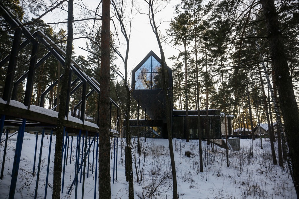Новосибирский архитектор Юрий Куликов построил себе дом в коттеджном посёлке «Европейский» на берегу Оби. Несмотря на внушительные размеры, здание на первый взгляд не кажется большим. Оно маскируется с помощью глубокого графитового цвета, множества зеркальных и стеклянных поверхностей. «Новосибирские новости» сходили в гости к архитектору и узнали, каково это — жить в таком необычном доме на мощных опорах, и какие секреты он хранит.
