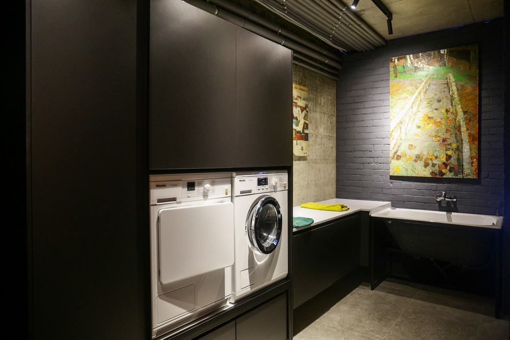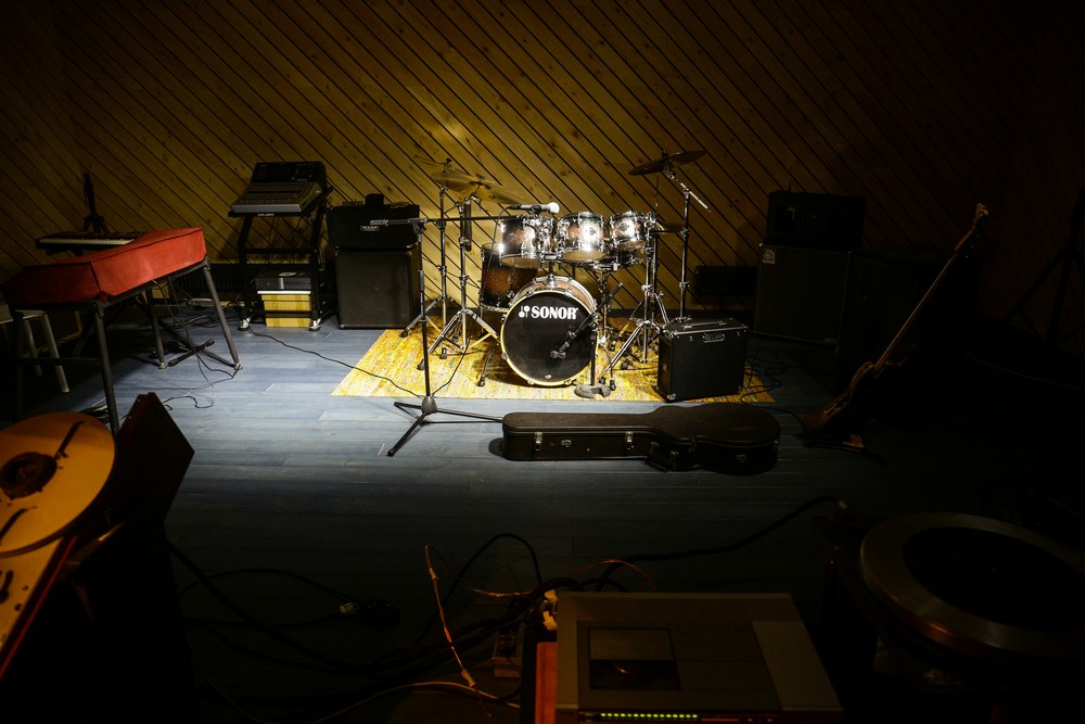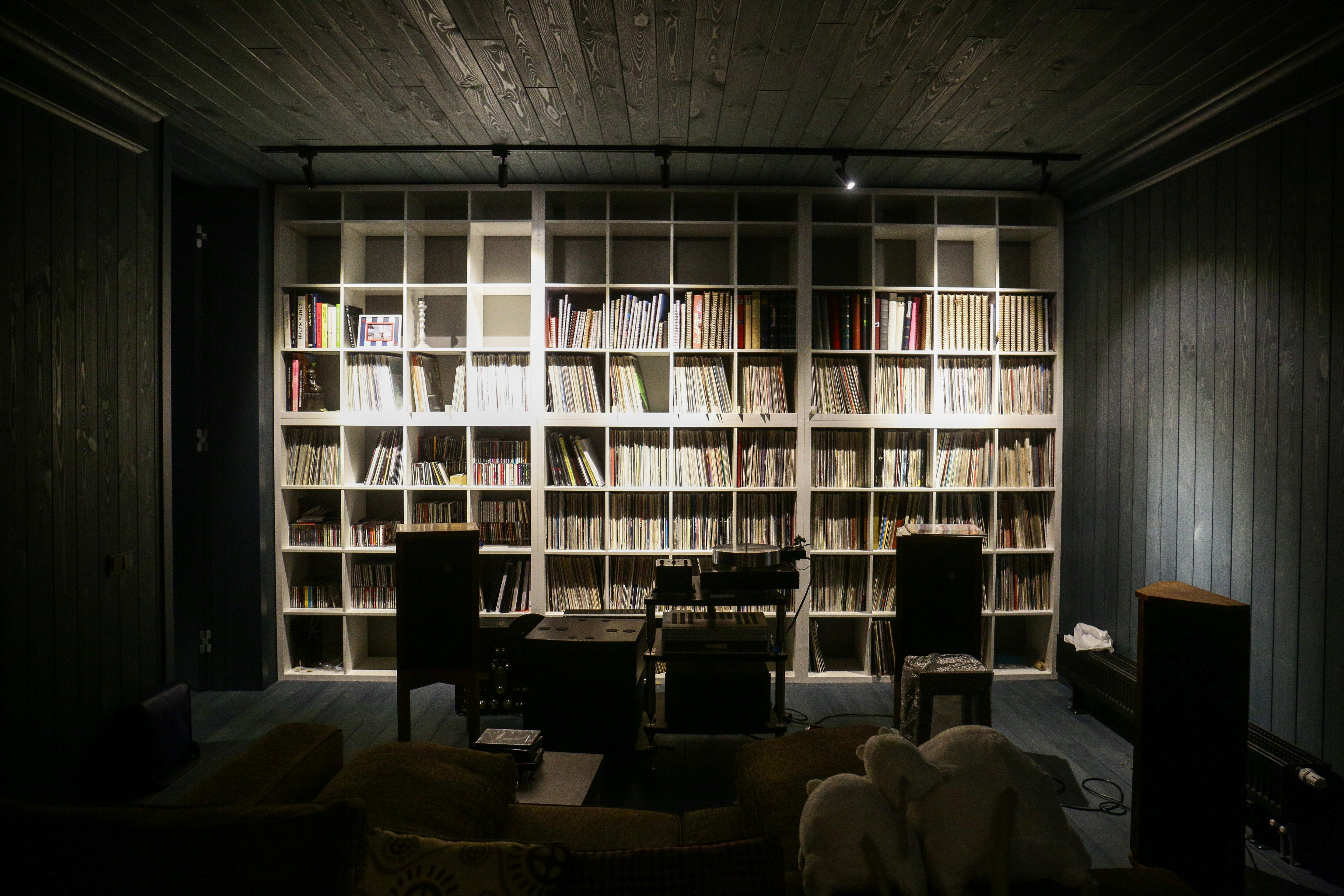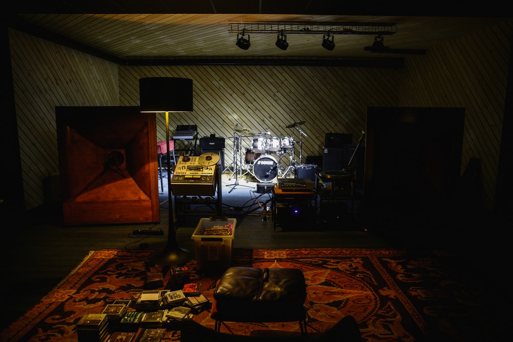 Больше всего времени архитектор проводит на нижнем уровне дома, где расположены кухня, прачечная и музыкальная гостиная. Здесь хозяин установил мощную аудиоаппаратуру для прослушивания музыки с любых носителей, в том числе советских пластинок 1950-60-х годов. Тут же есть барабанная установка и другие музыкальные инструменты.