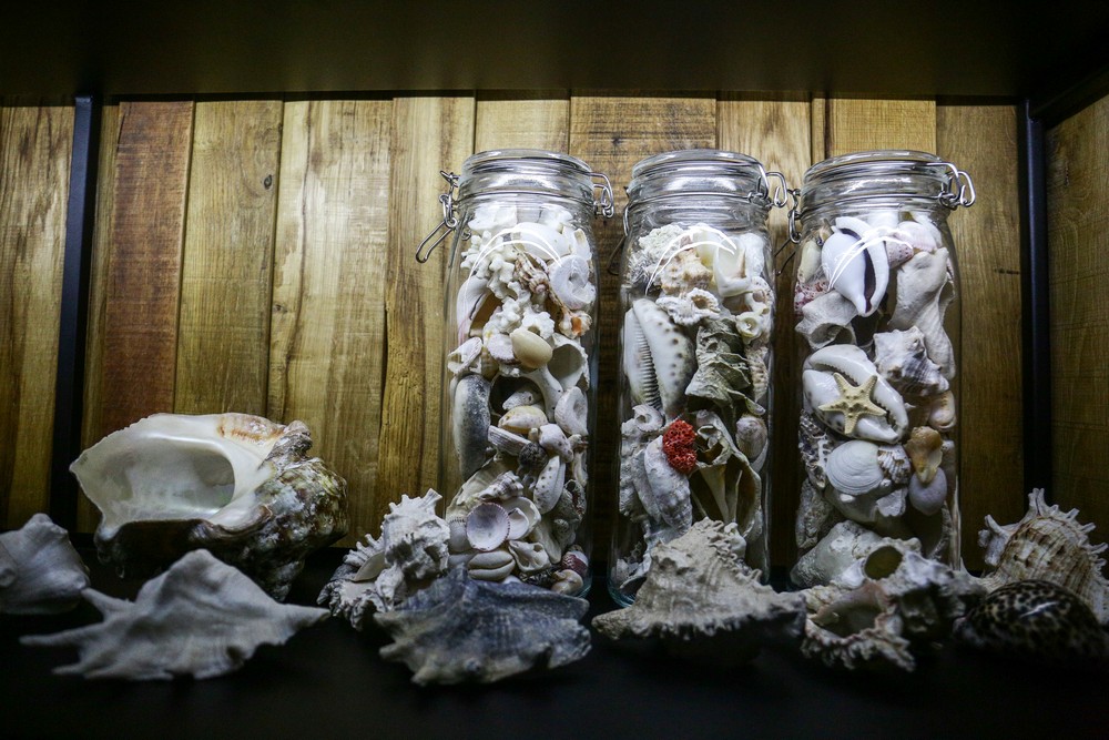 Отдельный шкаф отведён под коллекцию ракушек. Все они подписаны — с Маврикия, с Занзибара, с Мальдив, из Крыма и Сочи. Есть и банка с ракушками из Оби.