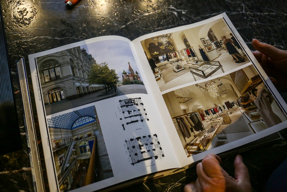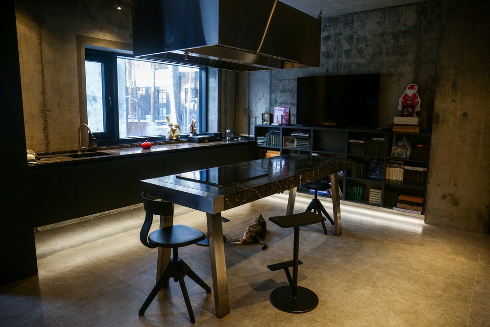 Кухня небольшая, в тёмных тонах, со столом-островом посередине. По периметру — шкафы с духовкой, холодильником, стеллажи с книгами, в том числе коллекционными. Ещё одна страсть архитектора — книги французского модного дома Луи Виттон (Louis Vuitton).