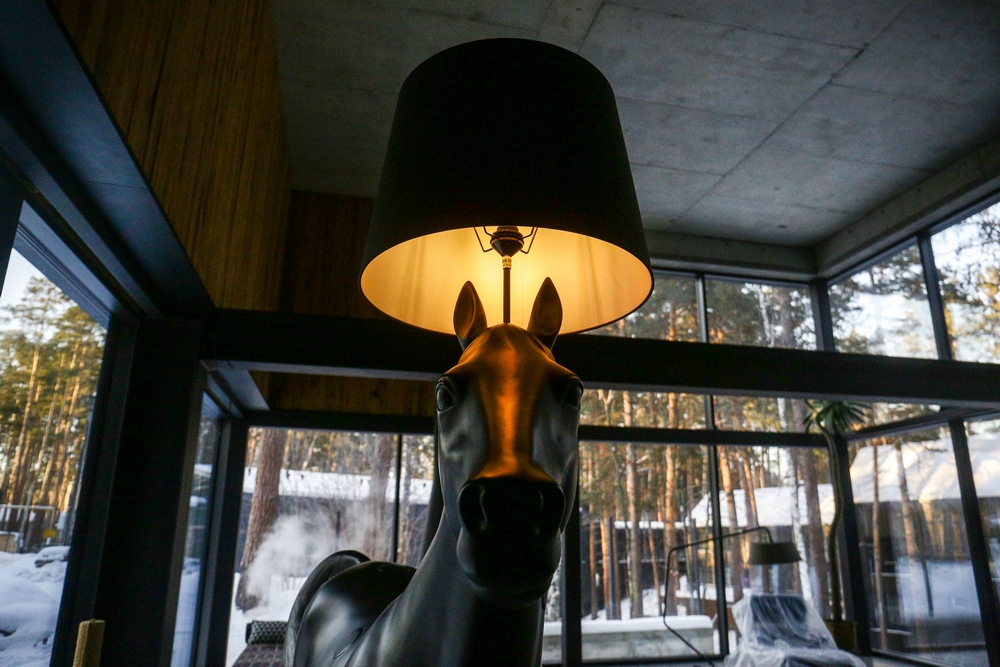 Так, в гостиной вас встречает статуя коня в натуральную величину. Не сразу поймёшь, что торшер. Но если приглядеться, то увидишь, что на голове скакуна держится абажур. Юрий пояснил, что конь не предназначен для того, чтобы на нём сидеть. Все попытки залезть на него хозяин пресекает на корню.
