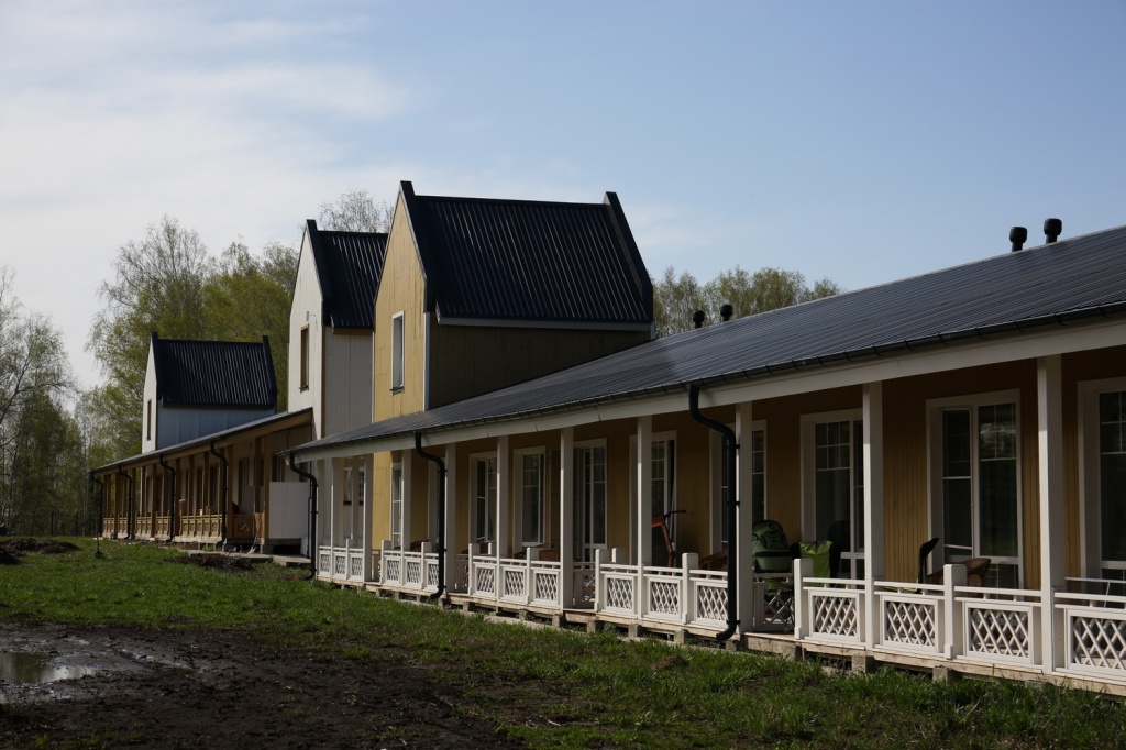 В самой «Деревне Мира» уже построили около двух десятков домов. Есть не только жилые дома на одного, двух или четырёх хозяев, есть и специальные таунхаусы, квартиры в которых можно арендовать и попробовать пожить деревенской жизнью. У жильцов такого дома — общая терраса, где они, собственно, и встречаются. Там можно уютно устроиться в плетёных креслах.