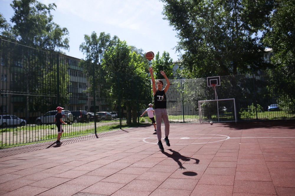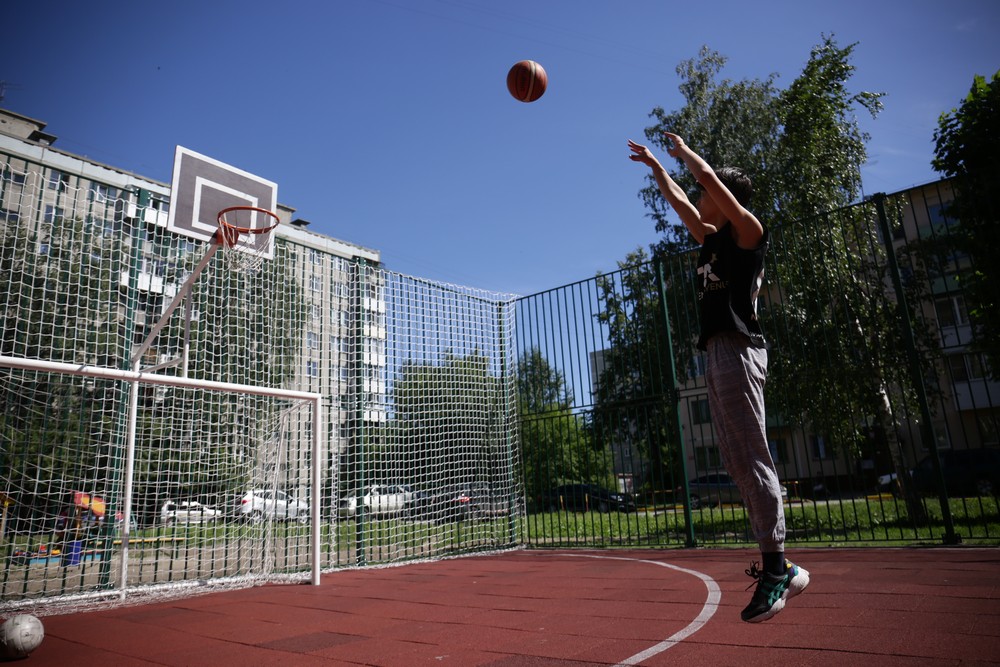 Артур играет в баскетбол непрофессионально, но занимается регулярно. Отрабатывает бросок из-за головы прямо во дворе — на новой спортивной площадке. Раньше приходилось играть в зале или искать свободные кольца по городу. Теперь место для любимого занятия — практически под окнами дома.