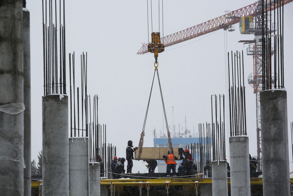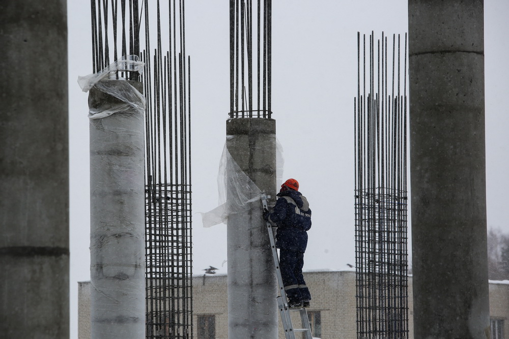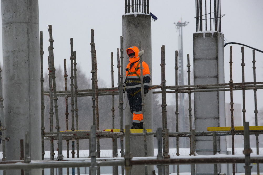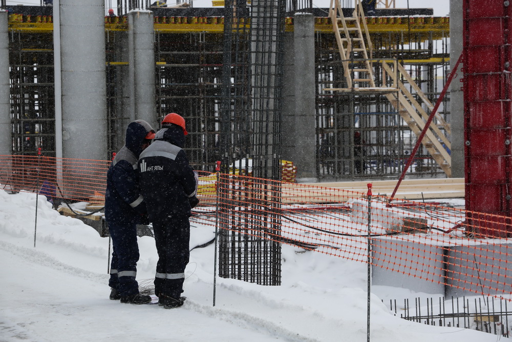 Пока в одной части стройплощадки ещё заливают последние сваи, в другой уже возводят первый этаж будущего терминала. Работа кипит вовсю, не прекращают её ни днём, ни ночью.