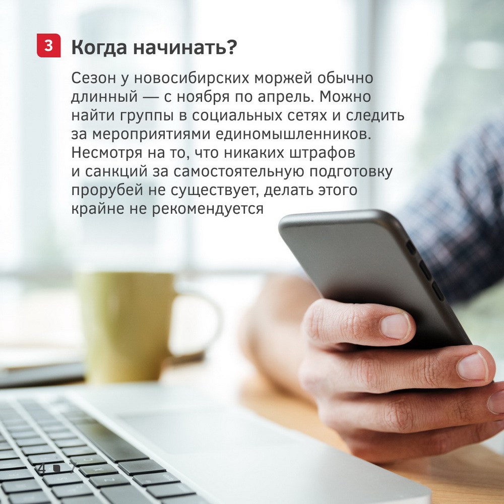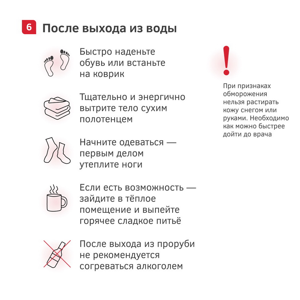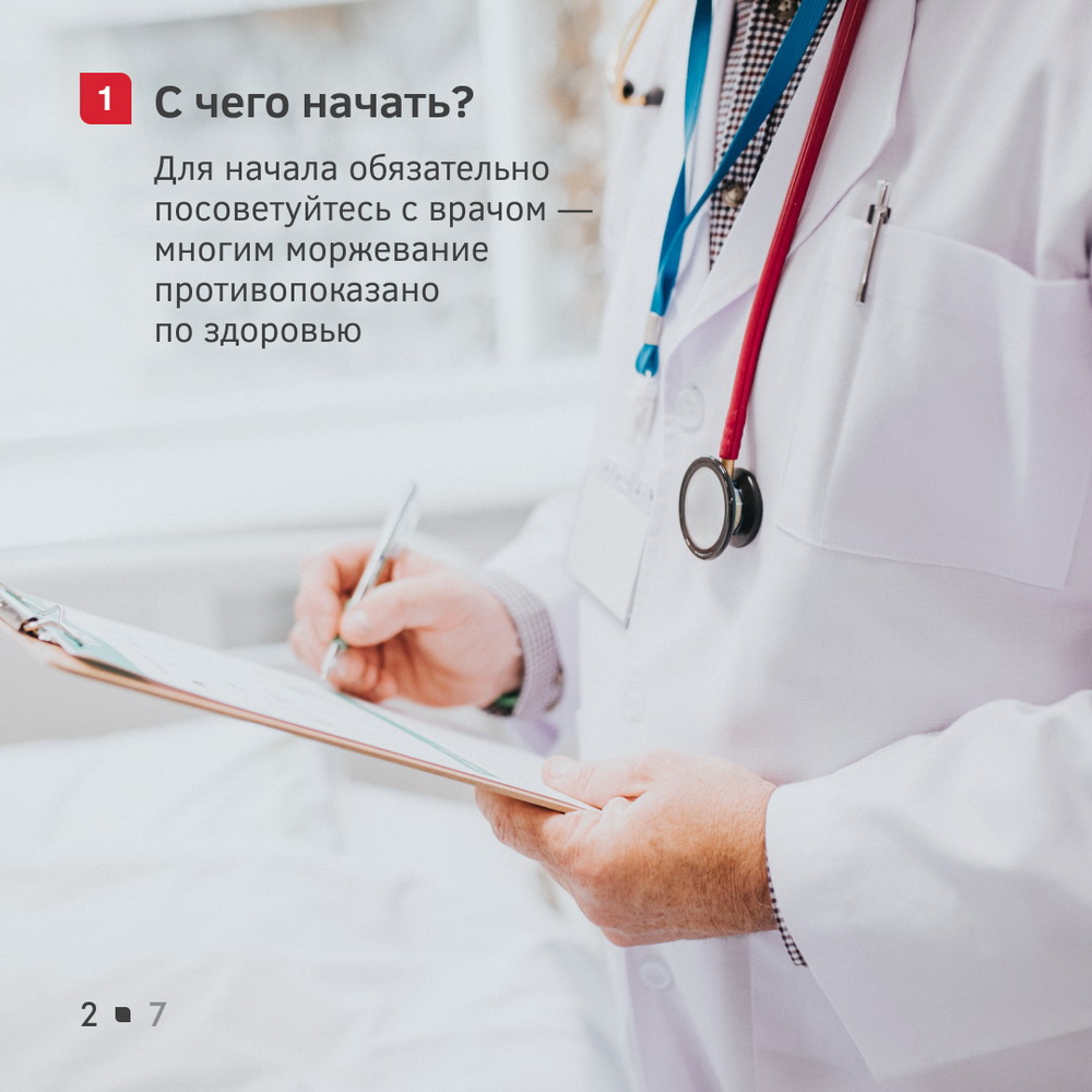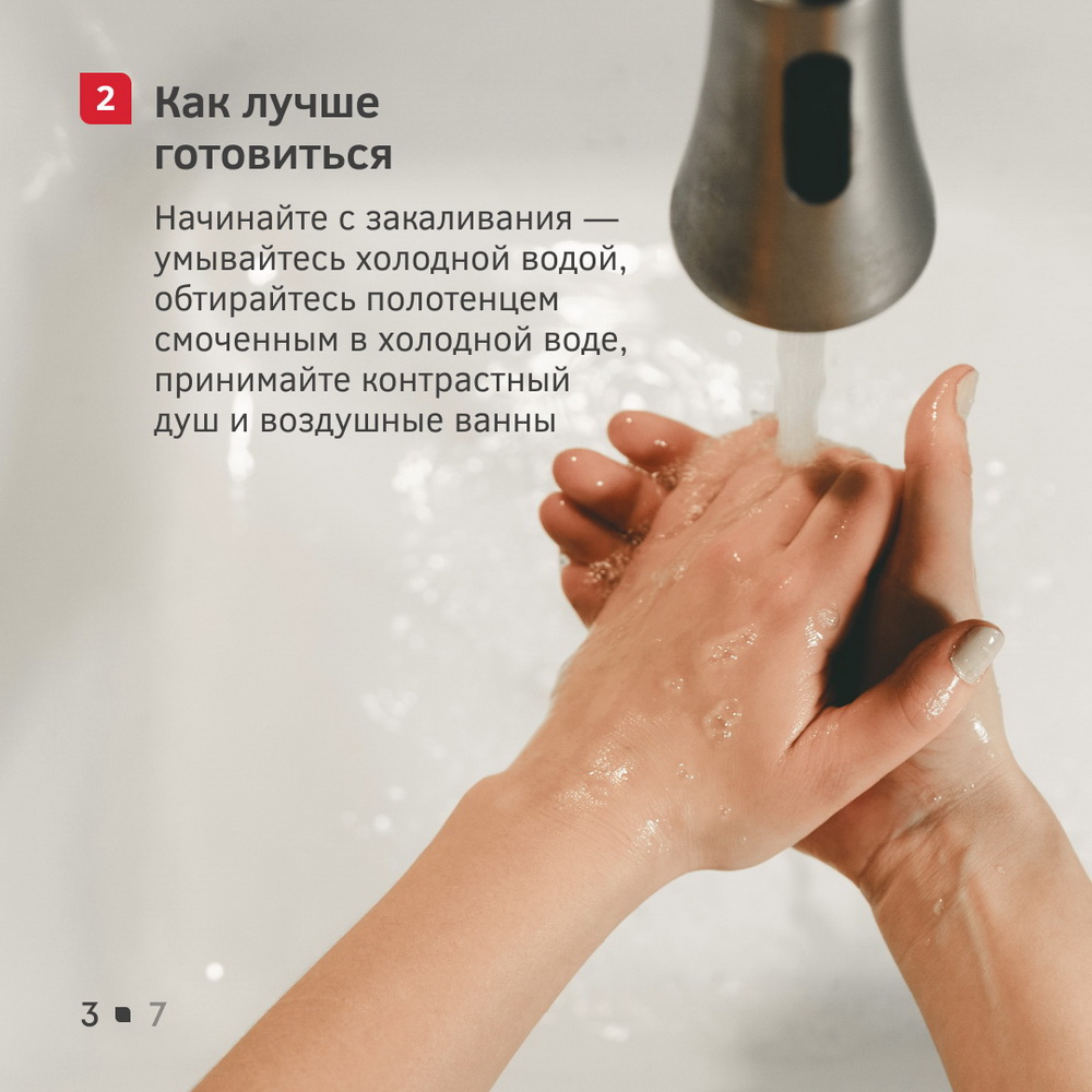 Если вы до этого никогда не моржевали, предлагаем для начала ознакомиться с нашими карточками. В них мы подробно рассказываем, как приступить к закаливанию, как себя вести при первом погружении в ледяную воду и что обычно делают моржи после заплывов.
