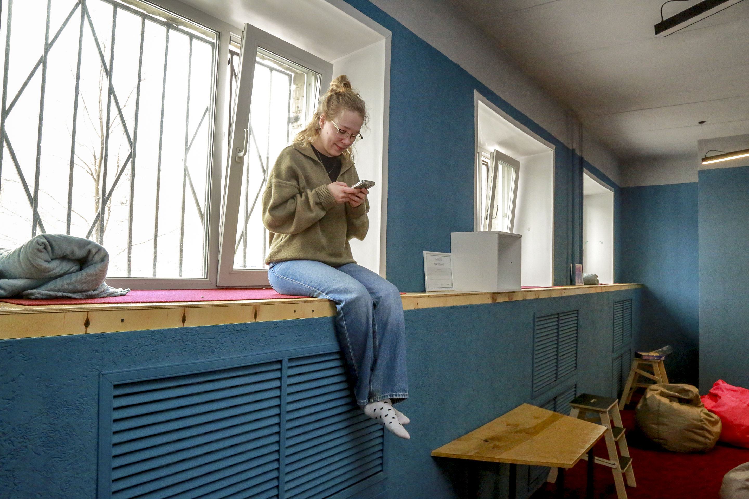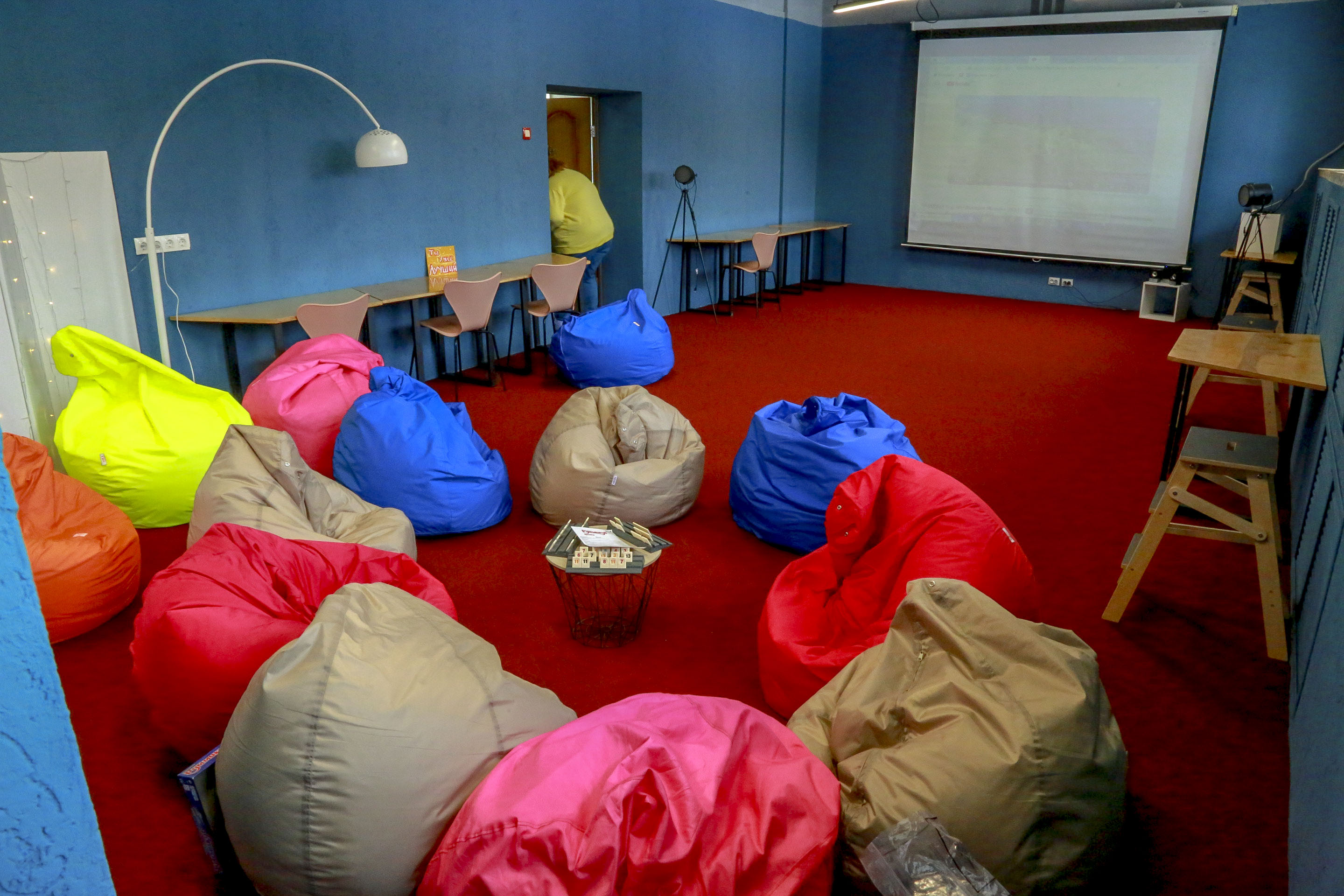 — Это несколько зон. Первая, одна из самых популярных, — кухонная. Есть зона амфитеатра для лекций, тихая зона, или игровая, — обособленное место, где можно поработать, поиграть и почитать. И есть синий зал — коворкинг, пространство для проведения событий с количеством участников до 30. В свободное от мероприятий время это зона тишины, где можно уединиться.