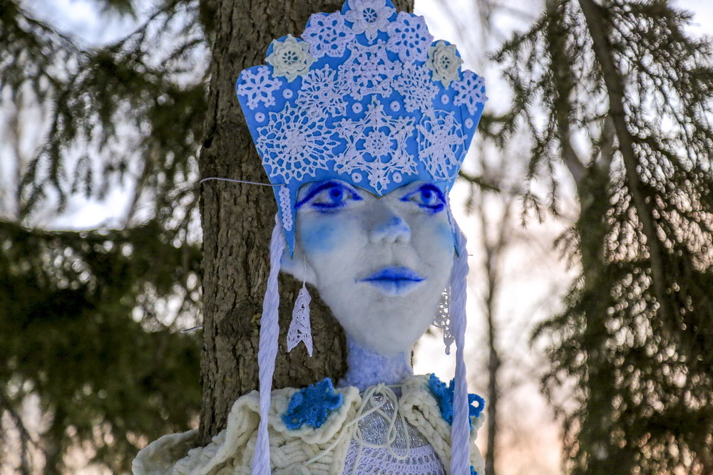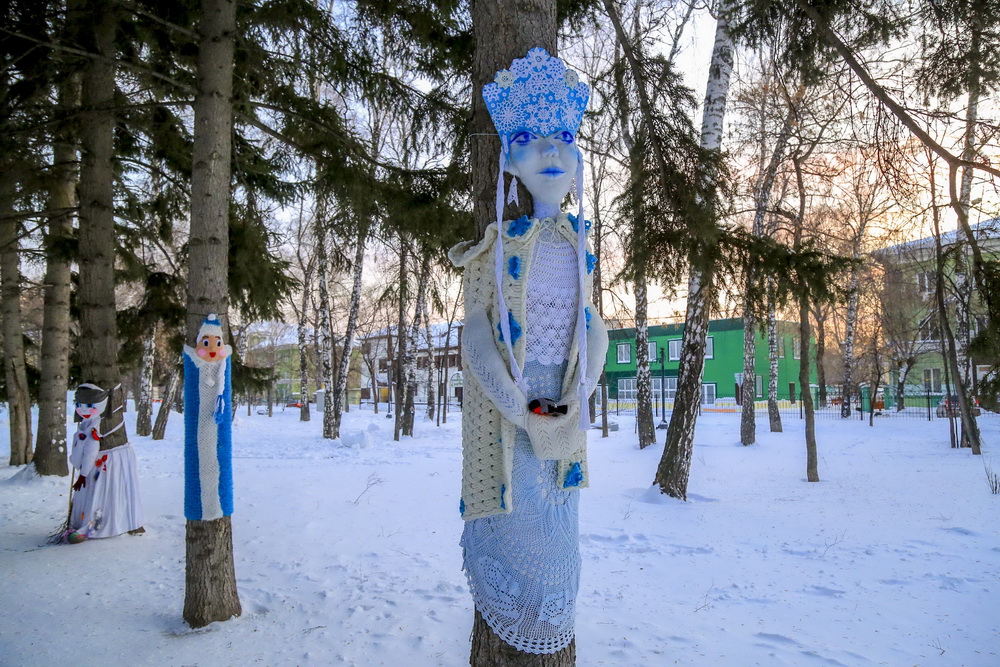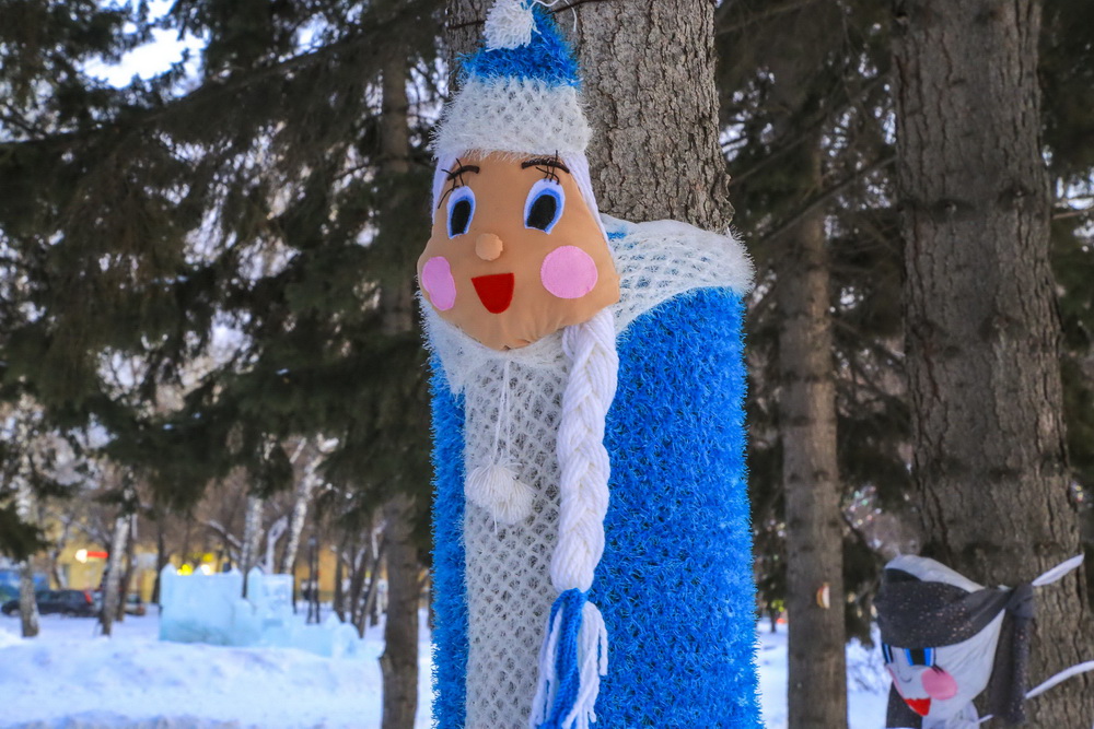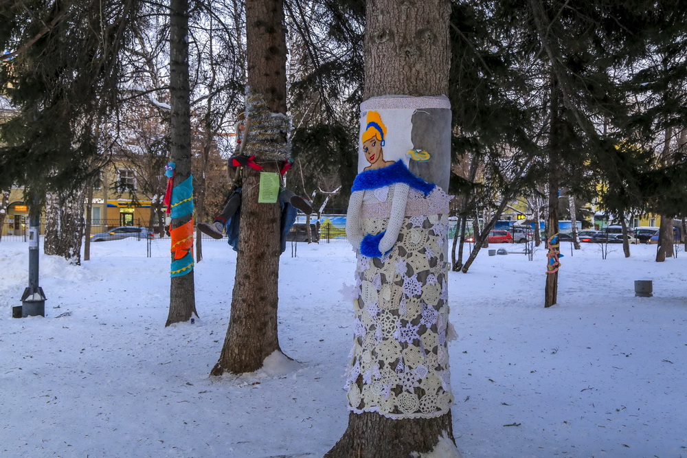 В Павловском сквере Калининского района второй год проходит необычная акция: местные жители украшают деревья вязаными «нарядами» на заданную тему. Этой зимой там можно увидеть Бабу-ягу, Снегурочку, Белоснежку, Снежную королеву и, конечно, зелёного дракона — символ наступившего года.