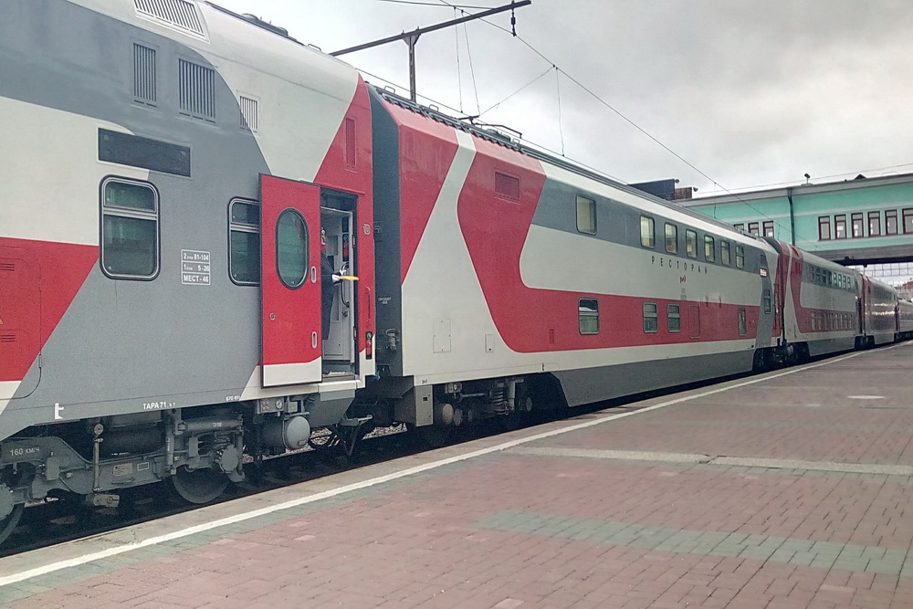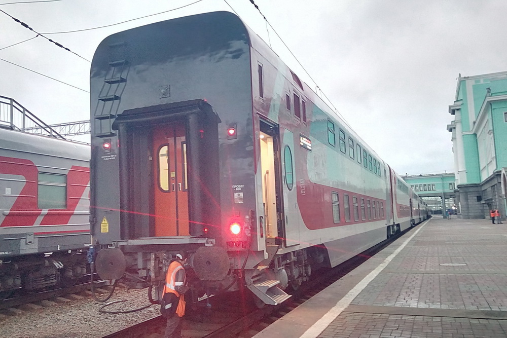 Двухэтажный туристический поезд Москва – порт Байкал отправился с Казанского вокзала в пятницу, 23 июля. В Новосибирск добрался ранним утром вторника, 27 июля, чтобы сделать техническую остановку. Никто из пассажиров поезд не покинул, большинство мирно спали. Некоторые вышли прогуляться по перрону.