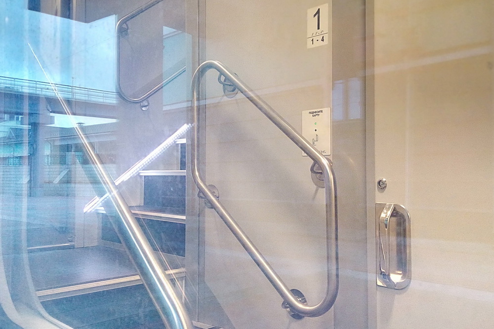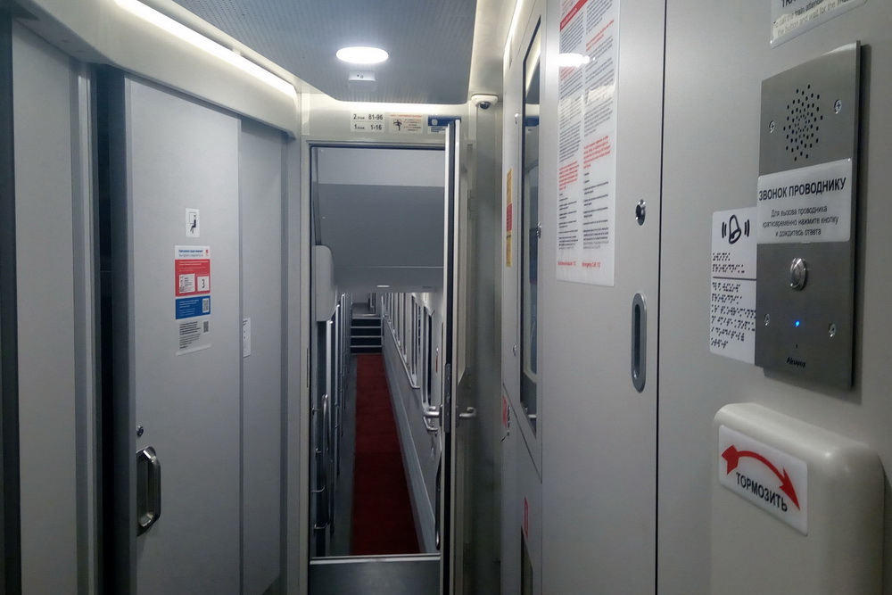 Проводник рассказал, что в каждом двухэтажном вагоне есть три туалета с душем, все они расположены на первом уровне. Один вагон оборудован для инвалидов, в нём туалет и на втором этаже.