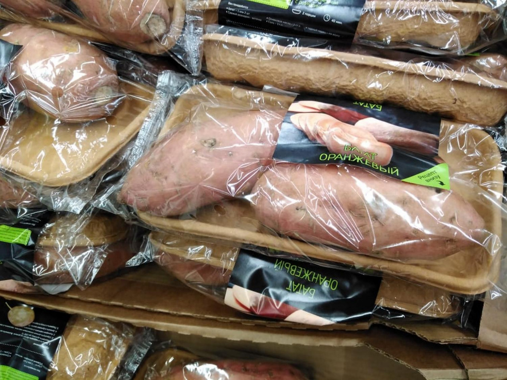 Корреспондент «Новосибирских новостей» встретила батат в «Ашане». Упакован он по два клубня на подложке. Стоит не дёшево — 270 рублей за 1 кг. На этикетке сообщают, что привезли его из Египта. Из-за внешнего сходства батат считают картофелем. Но близкого родства с паслёновыми у батата нет. К тому же он в 1,5 раза калорийнее картошки, а по содержанию углеводов, кальция и железа превосходит её.