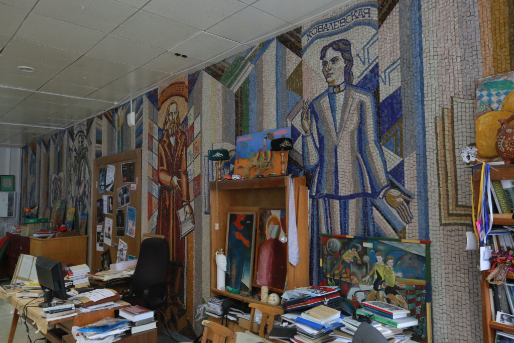 В Новосибирске для посетителей ГПНТБ откроют отлично сохранившиеся мозаичные картины из Советского Союза. До сих пор их мало кто видел. Нам удалось их сфотографировать во всей красе.