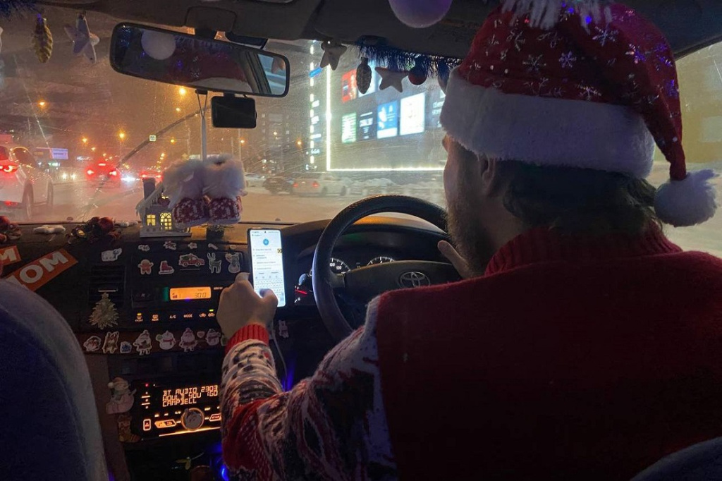 Новосибирский таксист создаёт новогоднее настроение своим пассажирам. Он украсил салон автомобиля игрушками, гирляндами, снежинками и мишурой, надел красный колпак и свитер с оленями и приготовил сладкие призы тем, кто участвует в праздничной викторине.